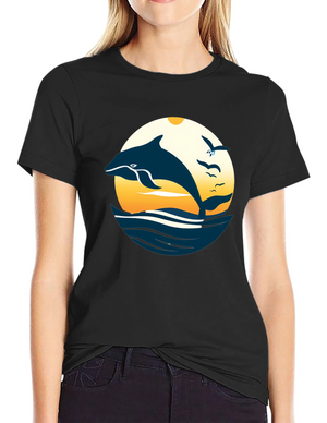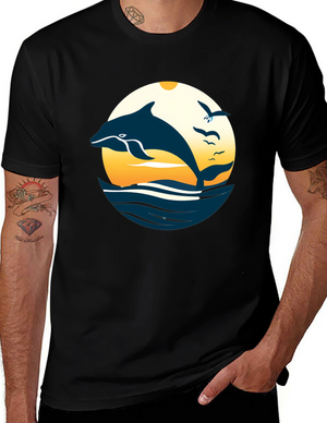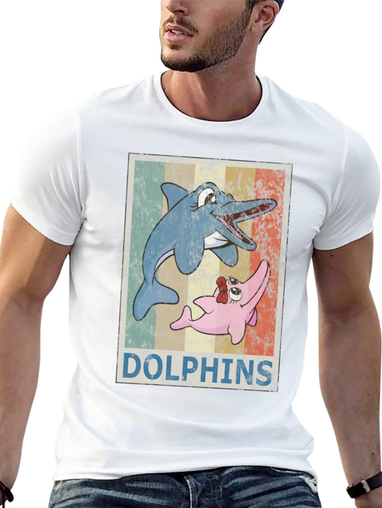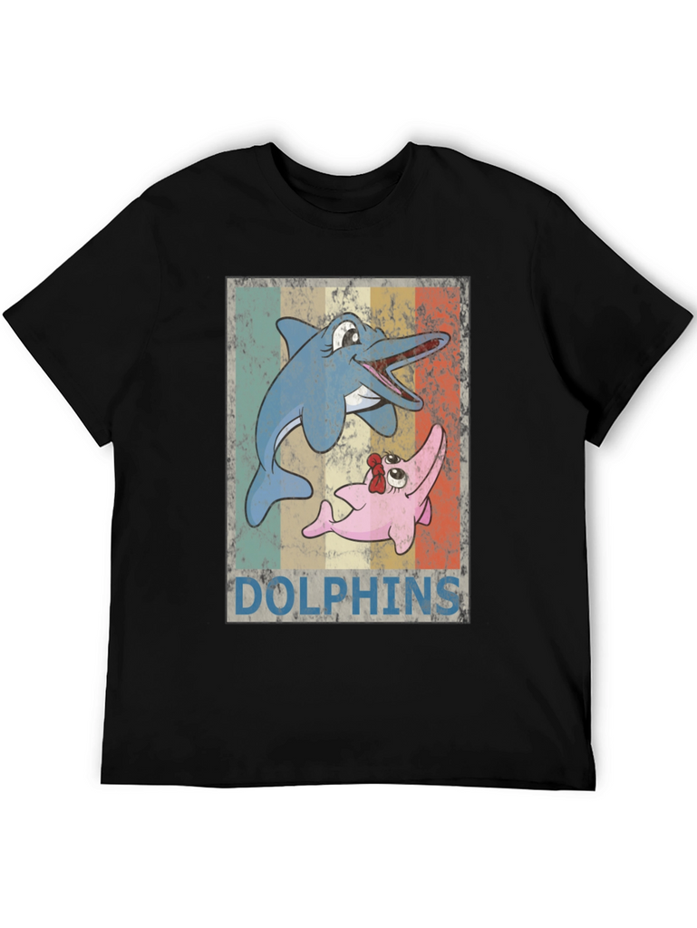 Dive into nostalgia with this vintage-style t-shirt featuring a playful cartoon dolphin design. The shirt showcases two animated dolphins set against a retro striped background, complete with a weathered texture for an authentic vintage look. Made from a comfortable, breathable fabric, this black t-shirt offers a relaxed fit perfect for everyday wear. The eye-catching design makes it a fun and unique addition to your wardrobe, ideal for casual outings, beach trips, or simply expressing your love for marine life. Stand out with this charming retro tee!