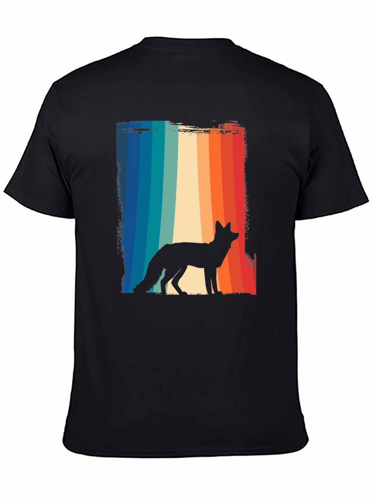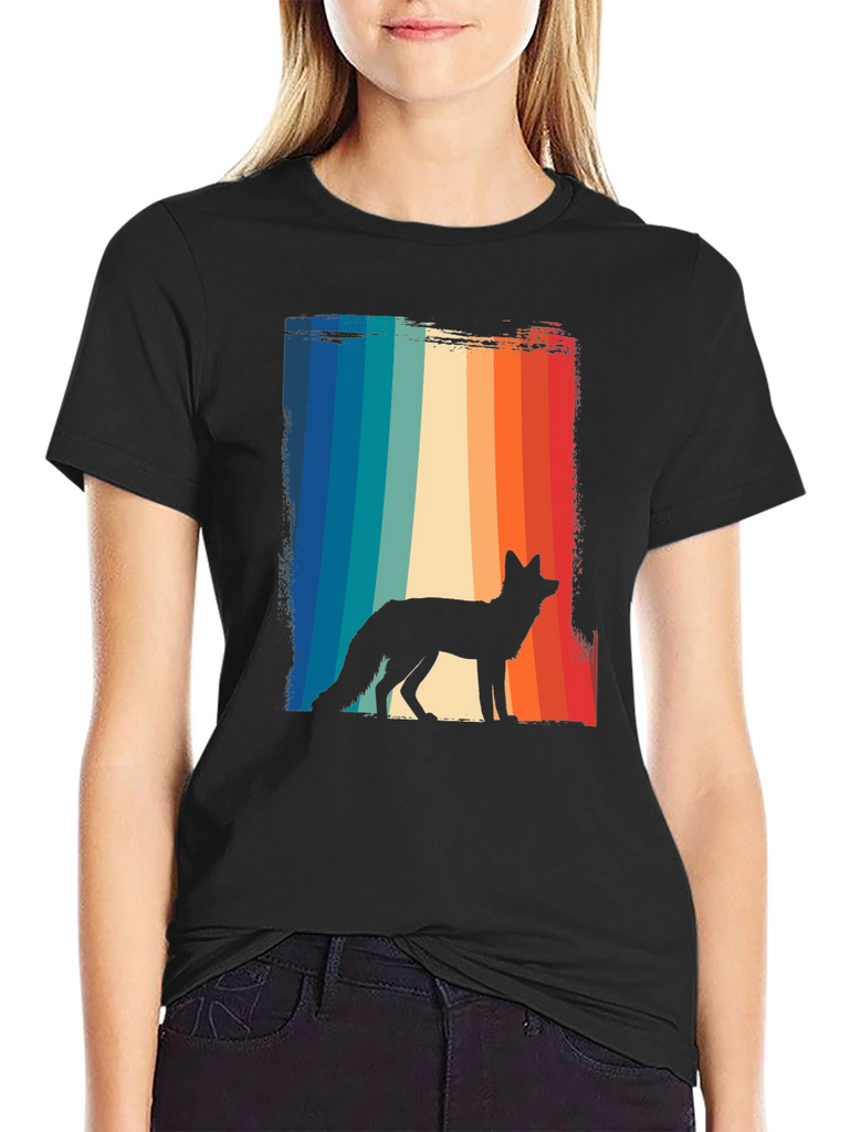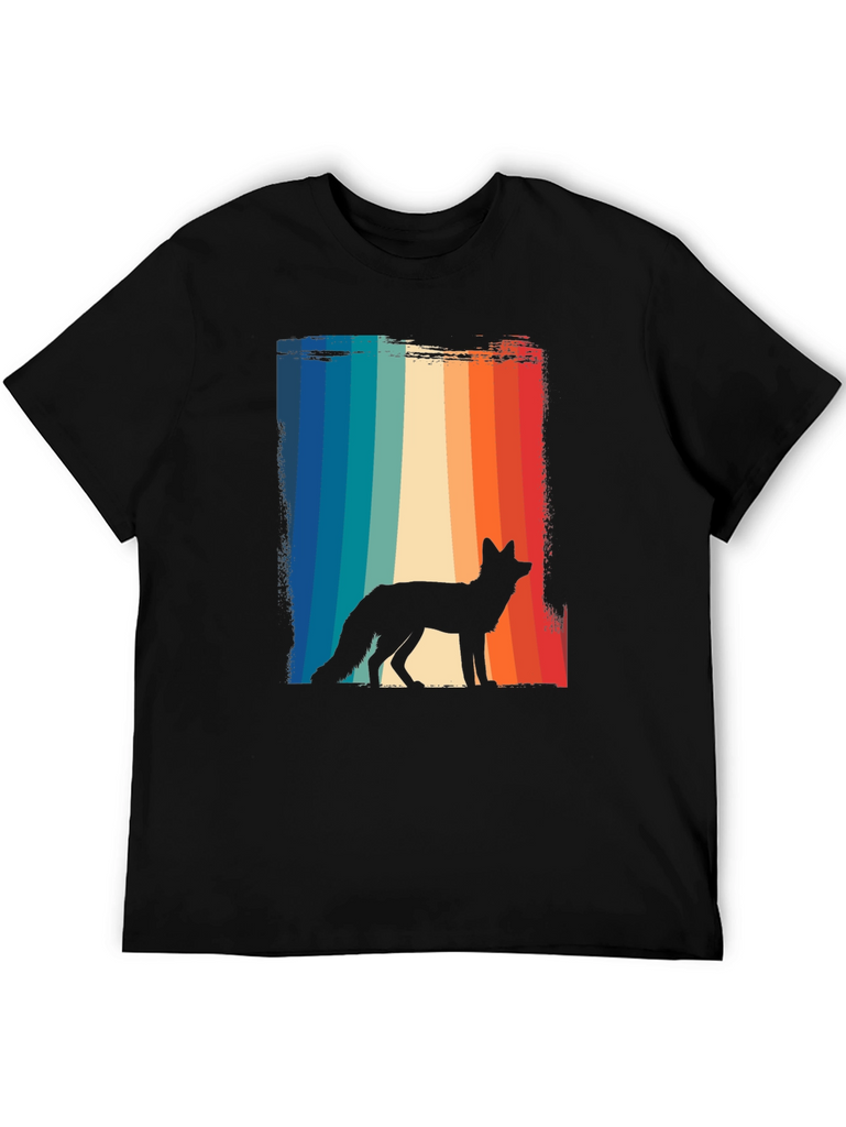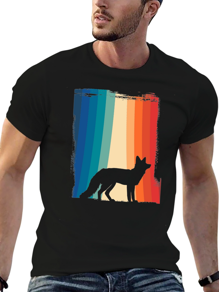 Embrace vintage vibes with this stylish graphic tee! Showcasing a bold silhouette of a fox against a retro-inspired vertical rainbow stripe backdrop, this black t-shirt offers a unique and eye-catching design. The classic crew neck and short sleeves provide a comfortable fit for everyday wear. Made from soft, breathable fabric, it's perfect for casual outings, concerts, or simply relaxing at home. Pair it with jeans, shorts, or a skirt for a cool and effortless look. Make a statement and add a touch of retro flair to your wardrobe with this standout tee!