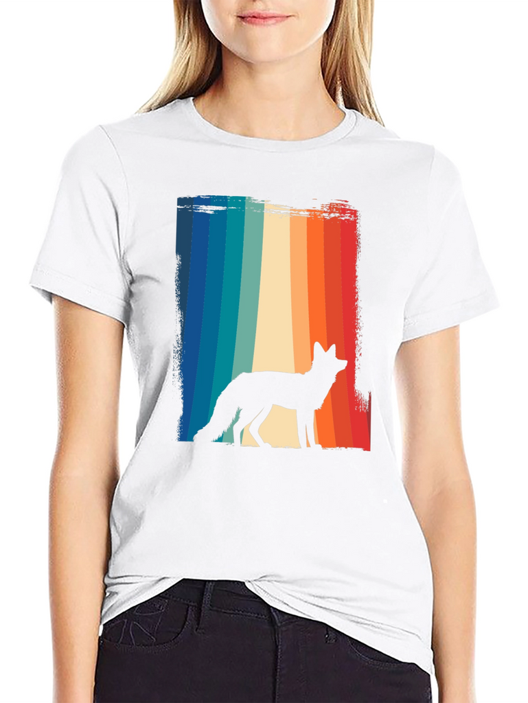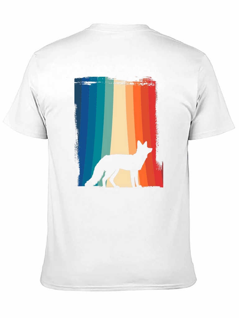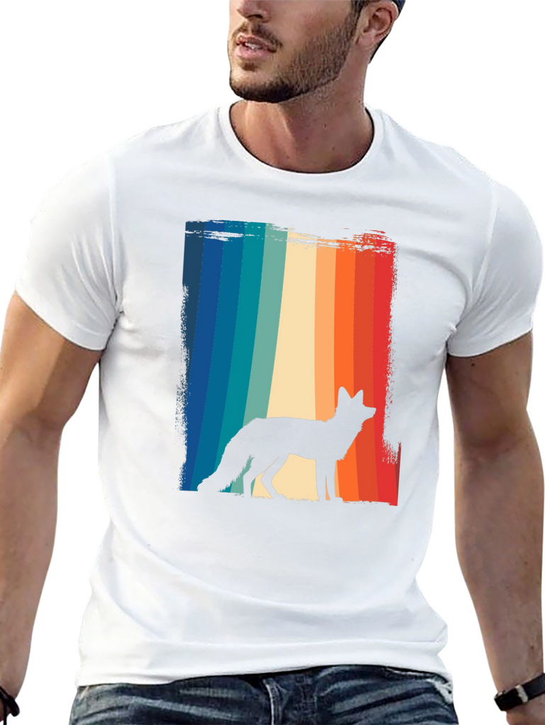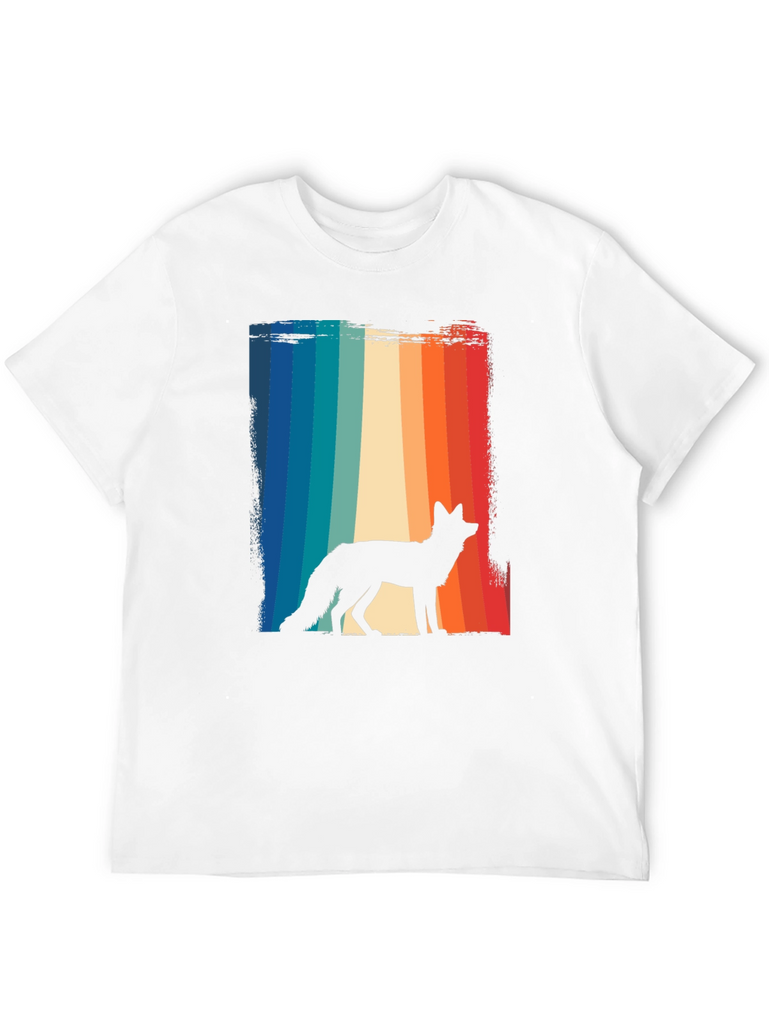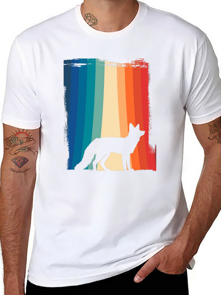 Embrace vintage vibes with this stylish graphic tee! Showcasing a bold silhouette of a fox against a retro-inspired vertical rainbow stripe backdrop, this black t-shirt offers a unique and eye-catching design. The classic crew neck and short sleeves provide a comfortable fit for everyday wear. Made from soft, breathable fabric, it's perfect for casual outings, concerts, or simply relaxing at home. Pair it with jeans, shorts, or a skirt for a cool and effortless look. Make a statement and add a touch of retro flair to your wardrobe with this standout tee!