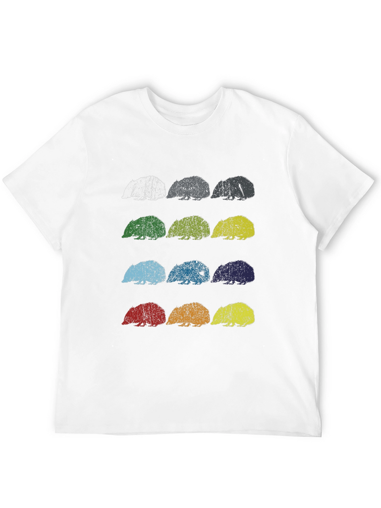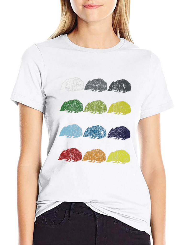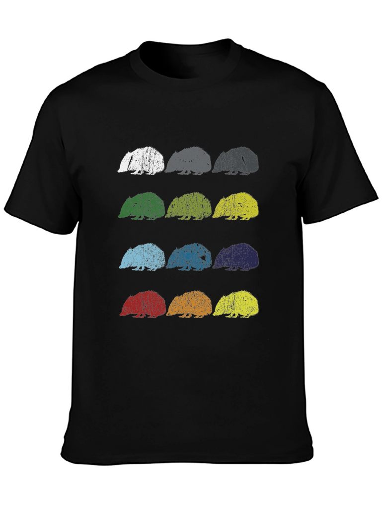 Show off your love for animals with this unique graphic T-shirt! This tee features a fun retro-style pattern of hedgehogs in various vibrant colors. The design is printed on a soft, breathable black fabric, perfect for everyday wear. The classic fit makes it a comfortable choice for casual outings, weekend adventures, or just relaxing at home. Make a statement with this playful and eye-catching T-shirt that combines vintage charm with a modern touch. It’s a great gift for hedgehog lovers!