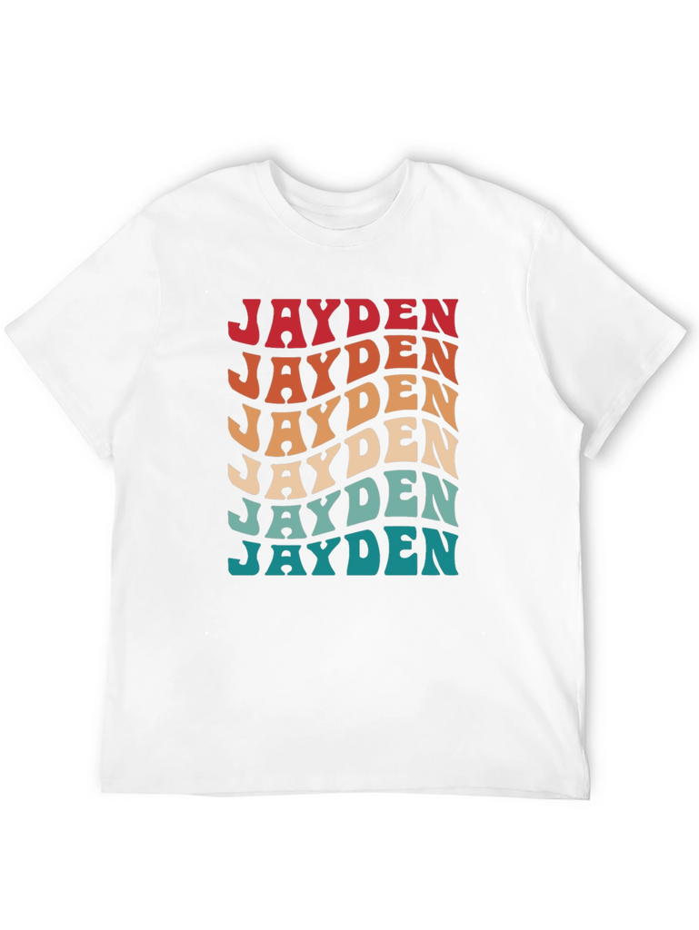 Show off your unique style with this retro-inspired "Jayden" name t-shirt. The shirt features the name 'Jayden' printed multiple times in a wavy, stacked design, utilizing a groovy retro color palette of red, orange, tan, and teal. The design is printed on a soft, comfortable black tee. Perfect for casual wear, making a statement, or gifting to someone named Jayden. This trendy and eye-catching shirt is sure to turn heads and add a pop of vintage flair to any outfit.