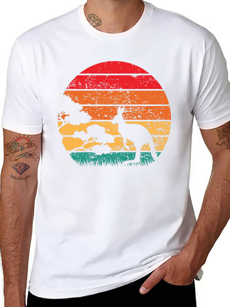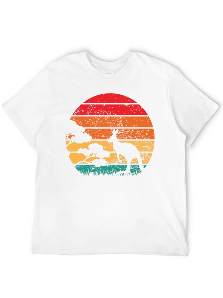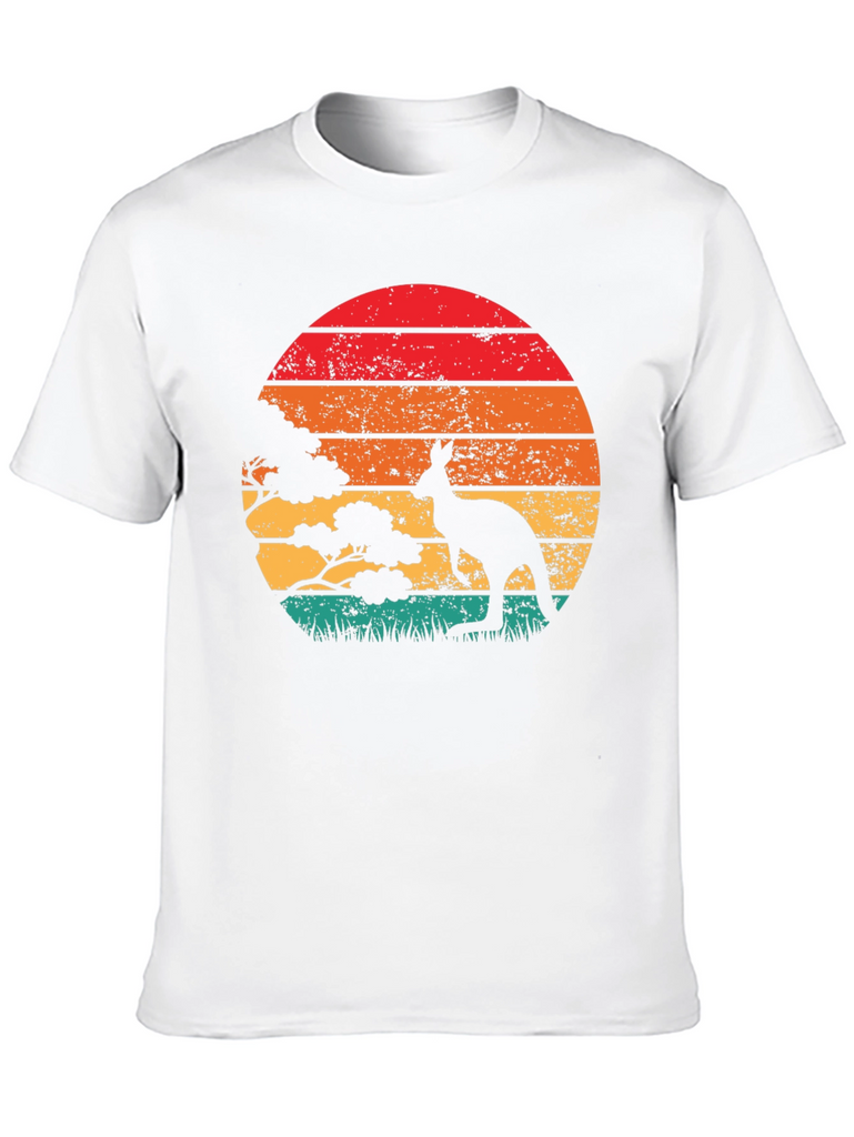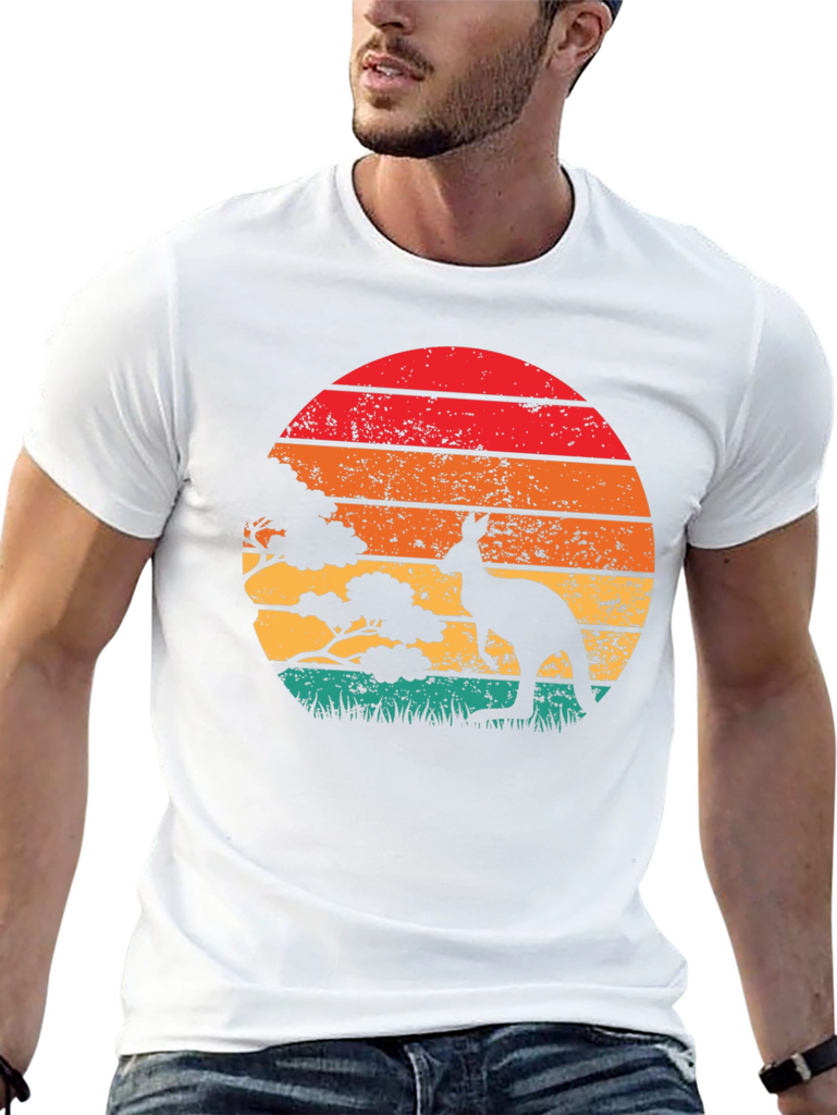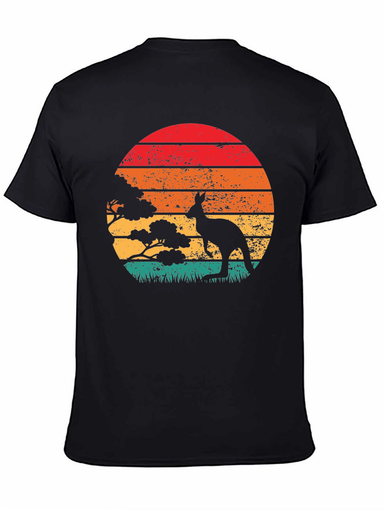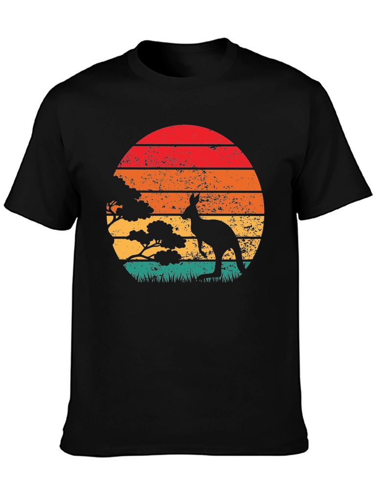 Embrace a vintage vibe with this classic black t-shirt featuring a striking retro-style graphic. The design showcases a kangaroo silhouette against a vibrant, textured sunset backdrop, complete with stylized trees and grassy terrain. The color palette includes warm reds, oranges, and yellows transitioning to cool greens and teal. Crafted from a soft, comfortable fabric, this tee is perfect for casual wear, outdoor adventures, or simply making a stylish statement. Add a touch of nostalgic charm to your wardrobe with this eye-catching and unique graphic tee. A great gift idea!