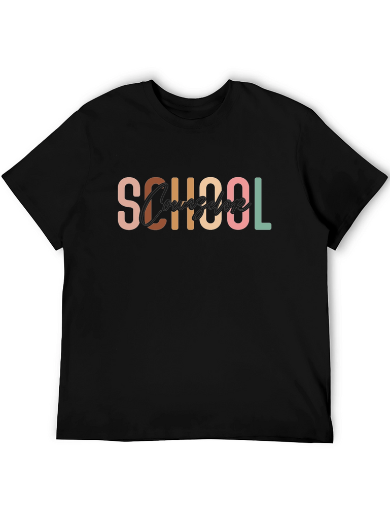 Show your school spirit with this stylish black t-shirt! Featuring a trendy retro design with the word "SCHOOL" in muted pastel colors and the word "Counselor" in a bold black, handwritten-style font. This soft and comfortable tee is perfect for everyday wear, whether you're at school, running errands, or relaxing at home. Made from a breathable material, it's designed for both comfort and style. Great as a gift for a school counselor or as a way to celebrate your profession. Add a touch of vintage flair to your wardrobe with this unique and eye-catching t-shirt. Get yours today!