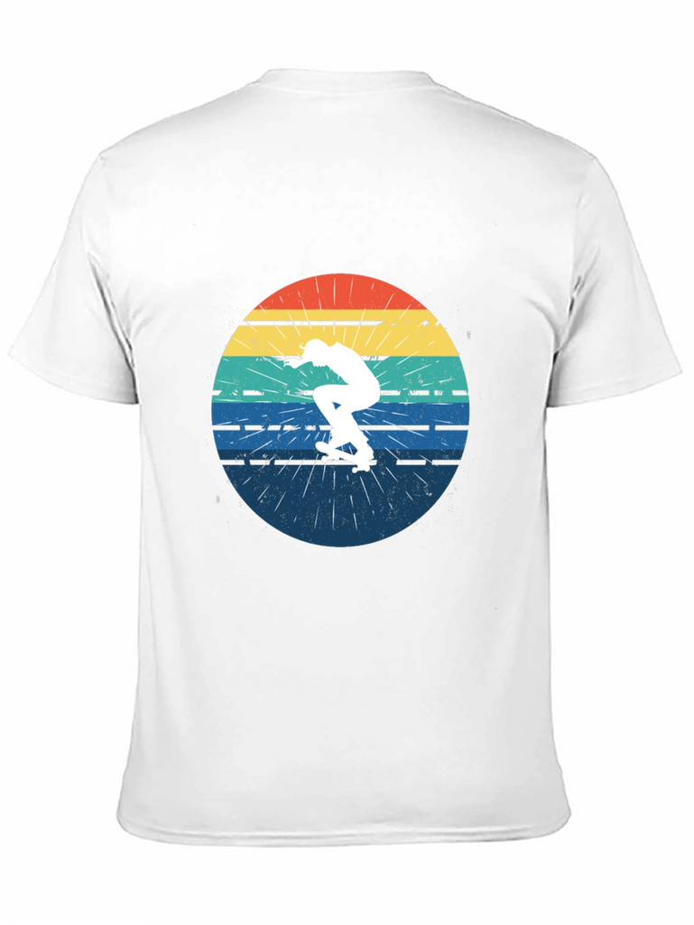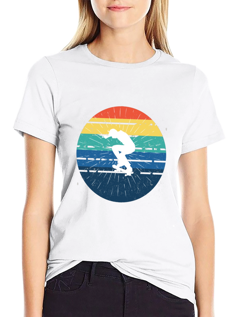 This classic black tee features a vibrant retro-style graphic of a skateboarder silhouetted against a striped sunset. The design incorporates warm hues of red and yellow blending into cooler shades of teal and blue, radiating outward from the center. Made from comfortable, breathable fabric, this t-shirt is perfect for casual wear. The bold graphic makes it a standout piece, ideal for expressing your love for skateboarding or adding a touch of vintage cool to your everyday wardrobe. Whether you're hitting the skate park or just hanging out, this tee is sure to turn heads and spark conversations. A great gift for skaters and retro enthusiasts alike!