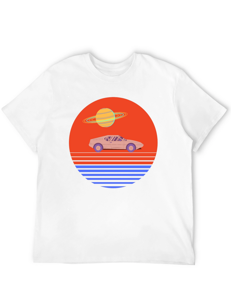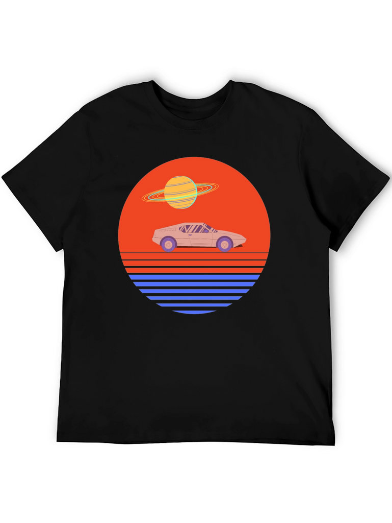 Step back in time with this retro-inspired t-shirt. Featuring a stylized car design against a sunset background, this shirt evokes a nostalgic feel. The design includes a planet Saturn, a car, and bold colors, making it a statement piece. Made from comfortable, breathable fabric, this tee is perfect for everyday wear or casual outings. Show off your unique style with this must-have addition to your wardrobe. Great for music lovers, car enthusiasts, and anyone who appreciates retro aesthetics.