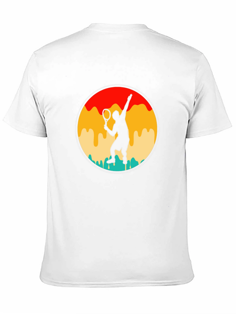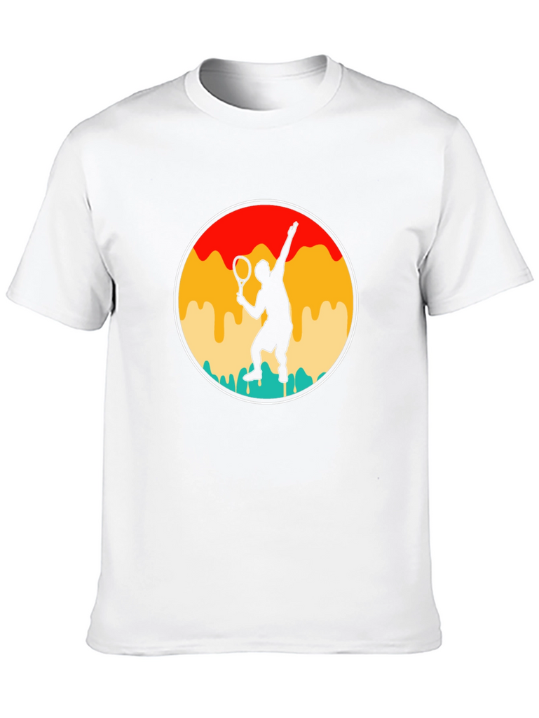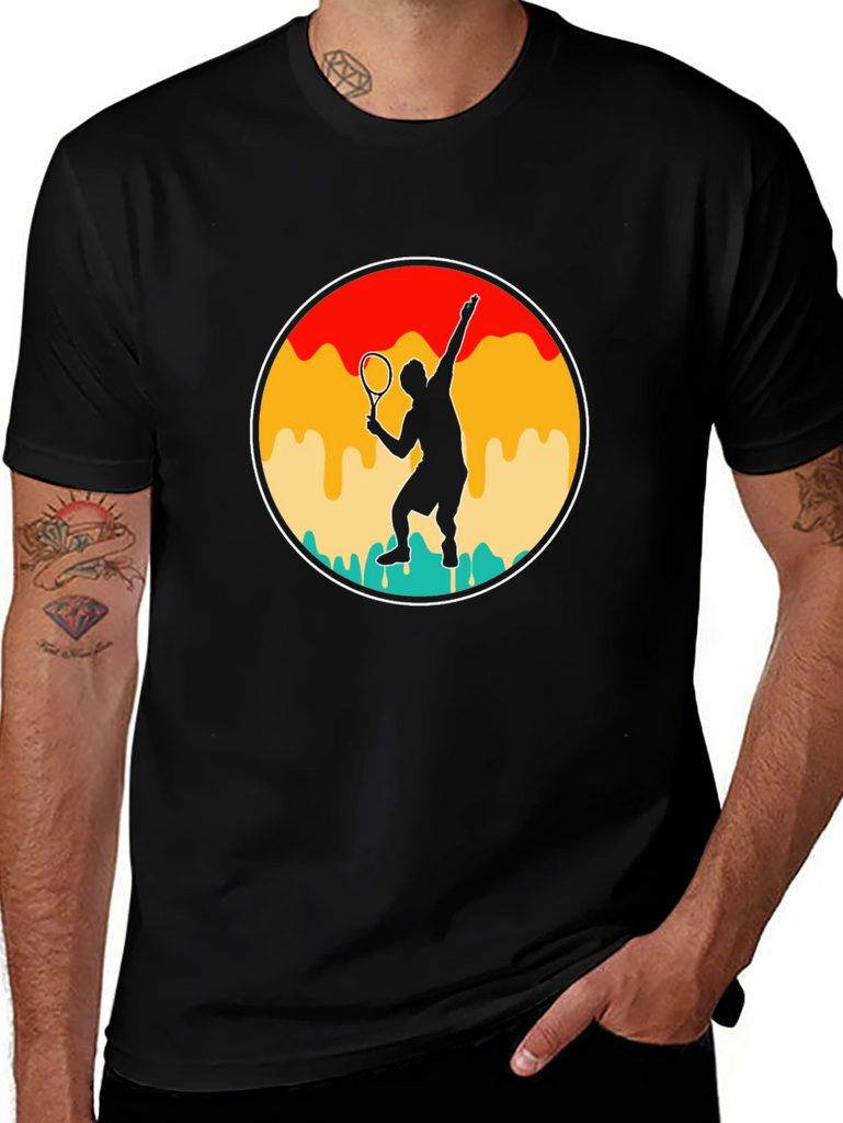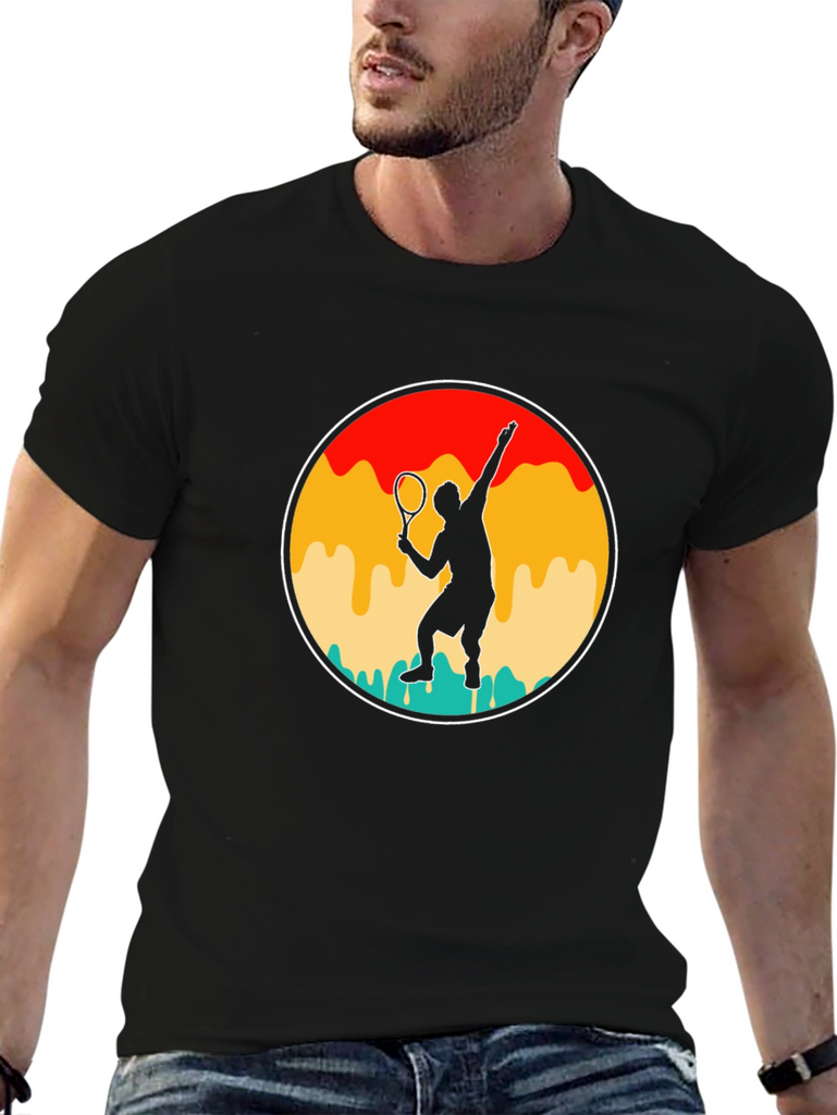 Step onto the court or into everyday life with this stylish retro-themed t-shirt! Featuring a bold circular graphic, the shirt showcases a tennis player silhouette ready to serve, set against a vintage sunset backdrop of red, orange, and teal. The unique melting drip design adds a touch of modern flair to the retro vibe. Made from a comfortable, soft black fabric, this tee is perfect for casual wear or showing off your love for the game. The standout design is sure to catch eyes and spark conversations, making it a must-have for tennis enthusiasts and retro fashion lovers alike. Add a bit of sport nostalgia to your wardrobe!