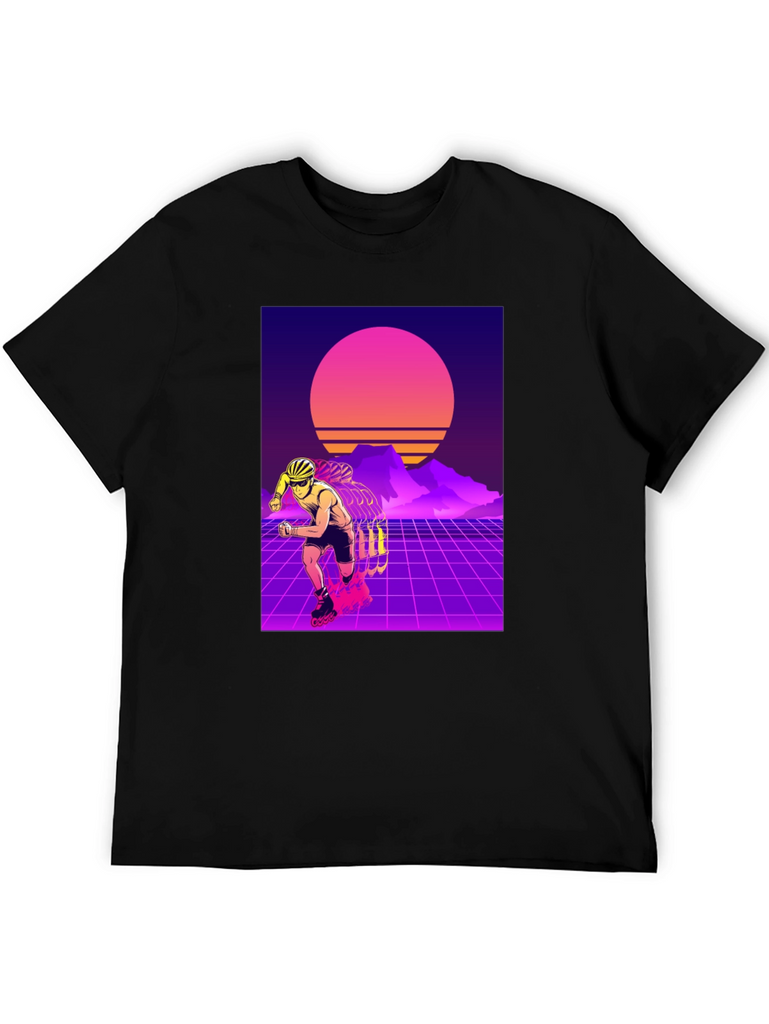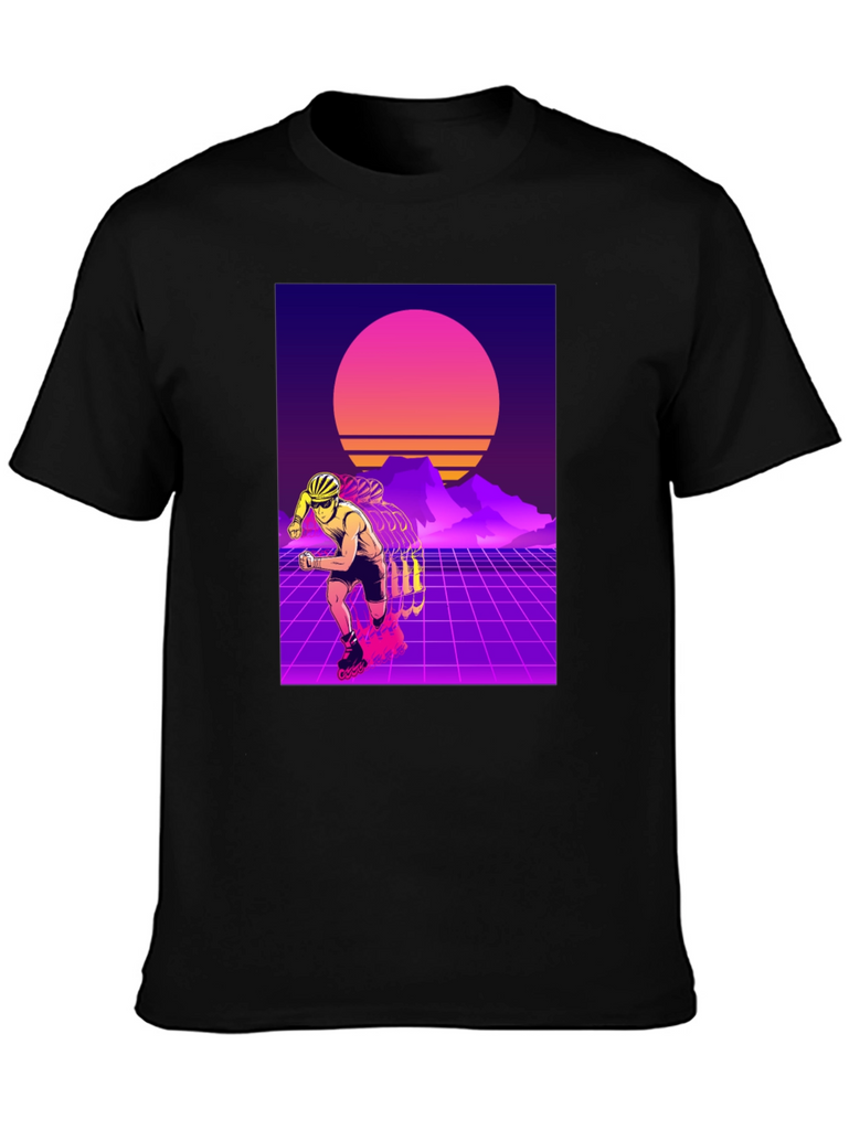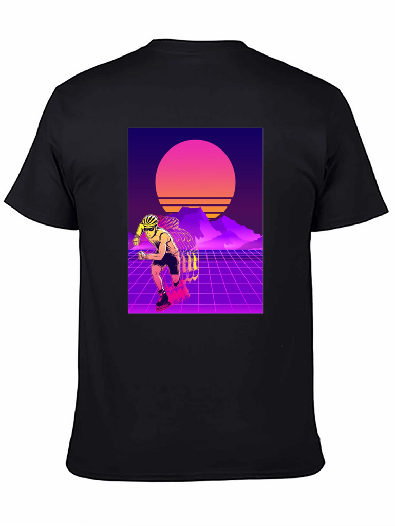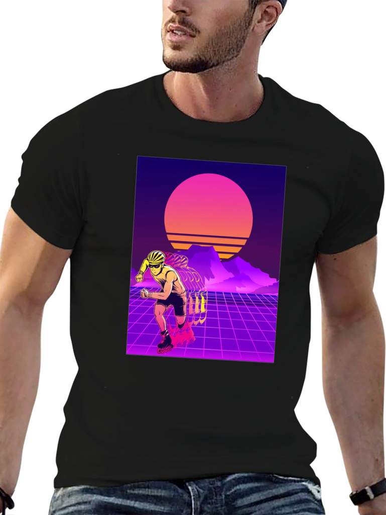 Show off your love for retro style with this eye-catching t-shirt. This black tee features a vibrant design of a rollerblader set against a classic 80s-inspired synthwave backdrop. With its neon grids, sunset, and silhouetted mountains, this t-shirt captures the essence of the iconic retro aesthetic. Made from soft, breathable fabric, it offers both style and comfort for everyday wear. Perfect for skating enthusiasts or anyone who appreciates a touch of nostalgia. Stand out from the crowd with this unique and stylish shirt!