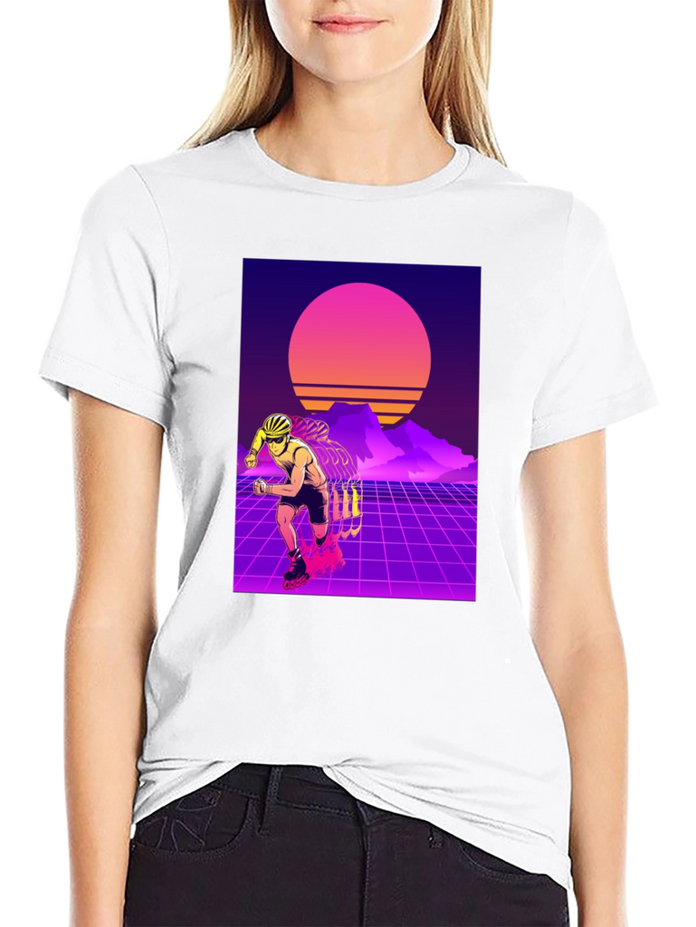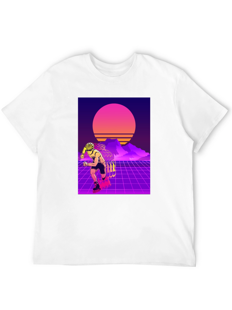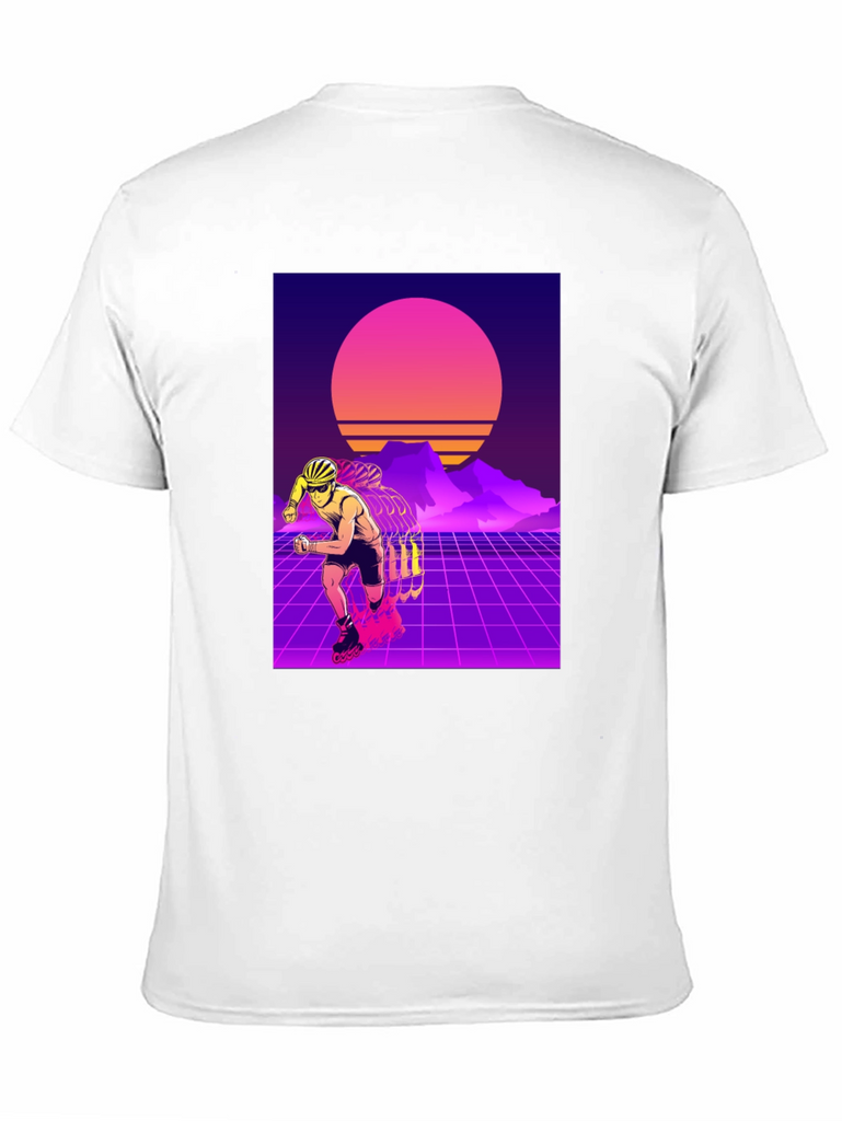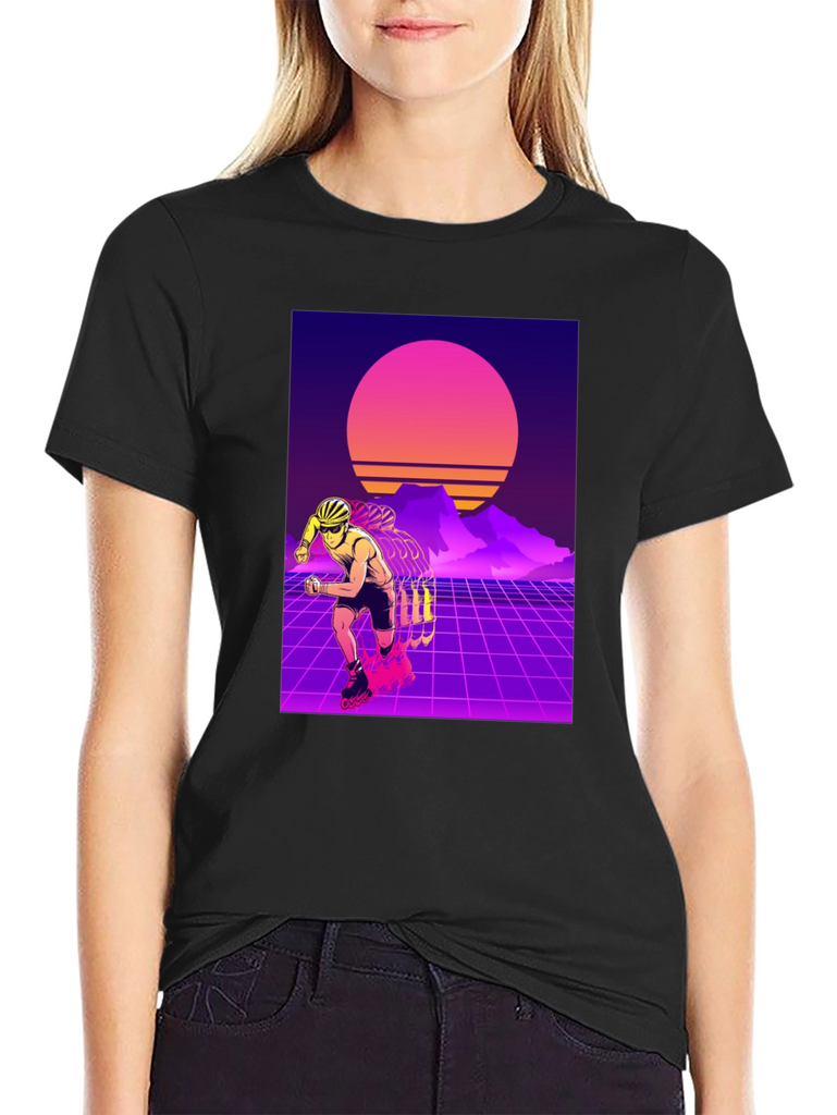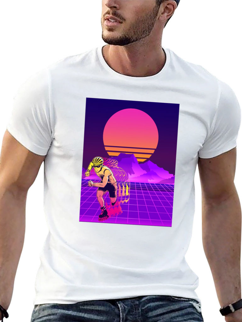 Show off your love for retro style with this eye-catching t-shirt. This black tee features a vibrant design of a rollerblader set against a classic 80s-inspired synthwave backdrop. With its neon grids, sunset, and silhouetted mountains, this t-shirt captures the essence of the iconic retro aesthetic. Made from soft, breathable fabric, it offers both style and comfort for everyday wear. Perfect for skating enthusiasts or anyone who appreciates a touch of nostalgia. Stand out from the crowd with this unique and stylish shirt!