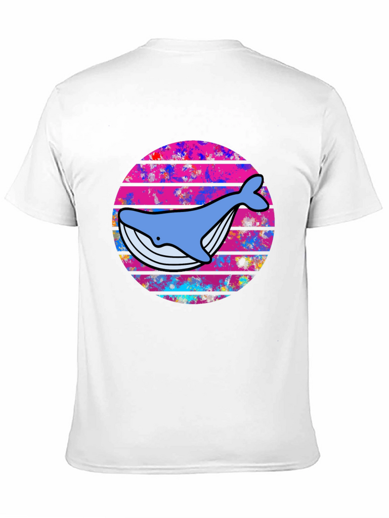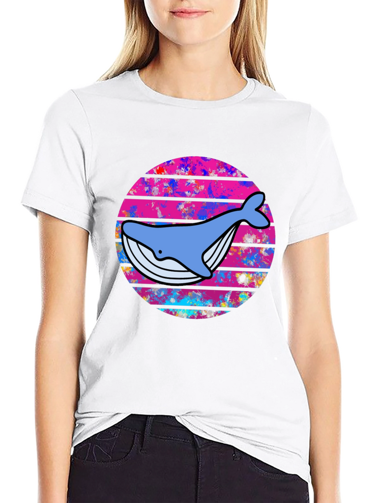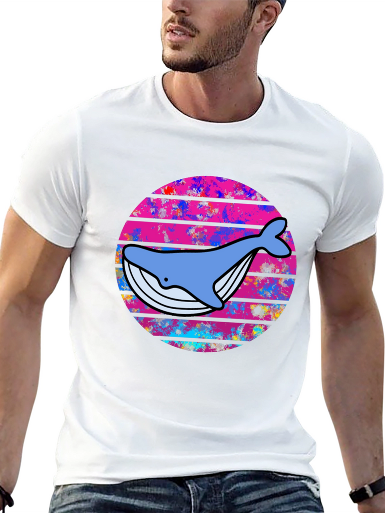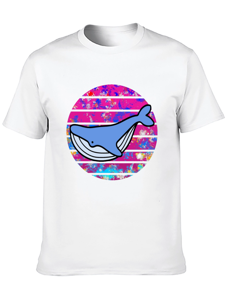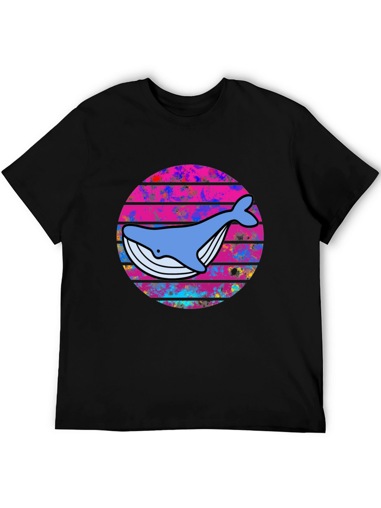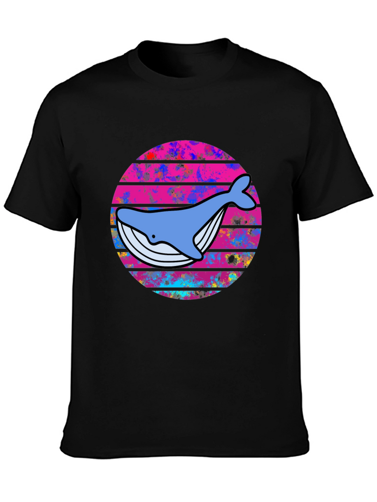 Dive into style with this eye-catching black t-shirt featuring a retro-inspired whale graphic. The design showcases a stylized blue whale against a vibrant circle of pink, blue, and black stripes, adding a pop of color to your casual wear. Made from soft, breathable cotton, this tee offers both comfort and durability for everyday wear. Perfect for whale enthusiasts, ocean lovers, or anyone looking to add a unique and playful touch to their wardrobe. Pair it with jeans, shorts, or joggers for a laid-back look. Make a splash with this distinctive and comfortable whale graphic tee!