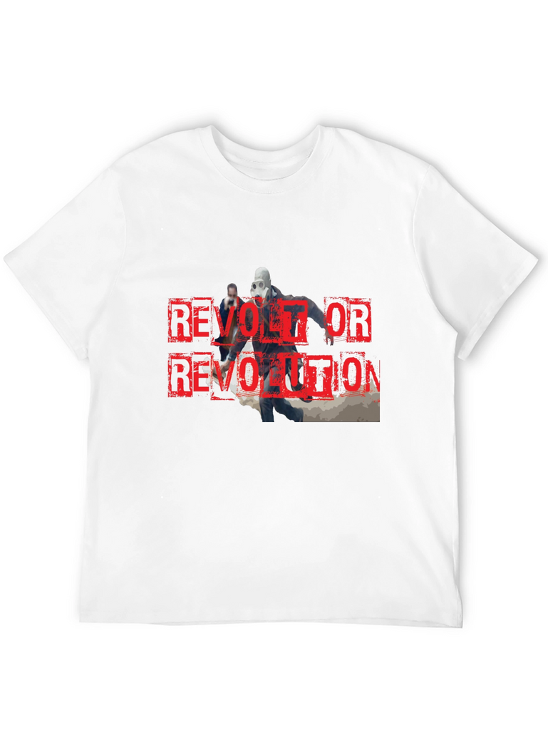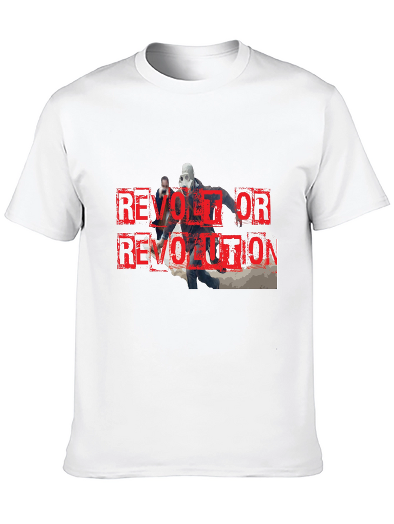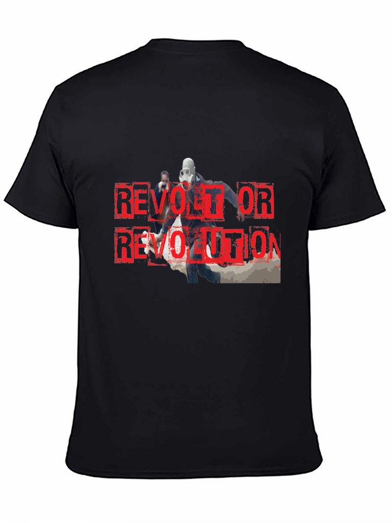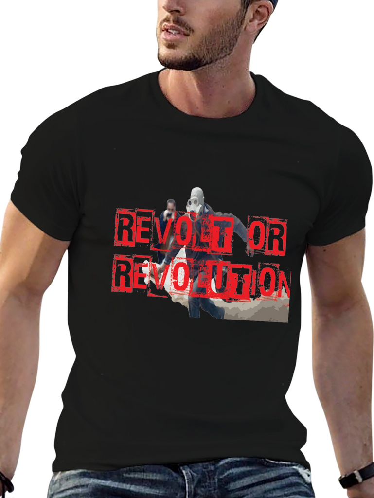 Make a statement with this bold black t-shirt. Featuring a striking graphic print of masked figures amid chaos, emblazoned with the words "REVOLT OR REVOLUTION" in a distressed red font, this tee commands attention. Constructed from what appears to be a soft, comfortable cotton blend, it offers both style and ease of wear. The classic crew neck and short sleeves make it a versatile piece for everyday wear. Express your individuality and stand out from the crowd with this edgy and thought-provoking t-shirt. Ideal for casual outings, protests, or making a statement wherever you go.