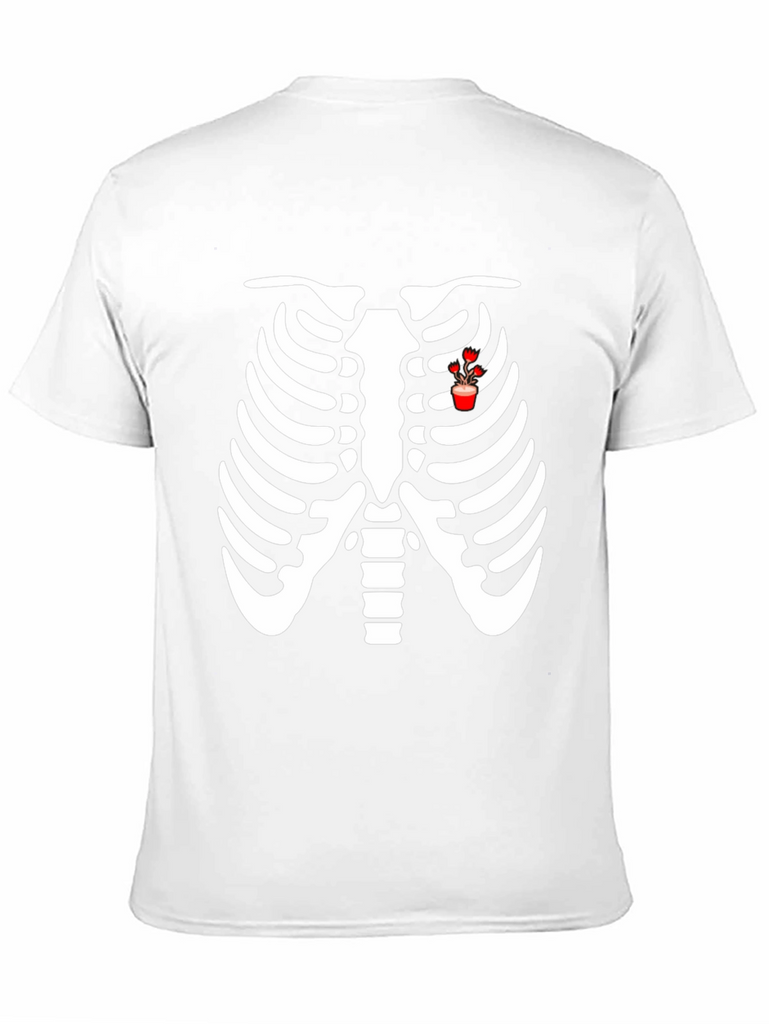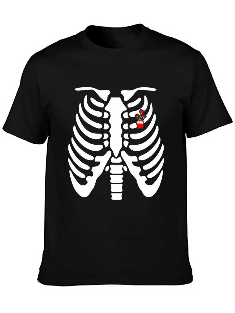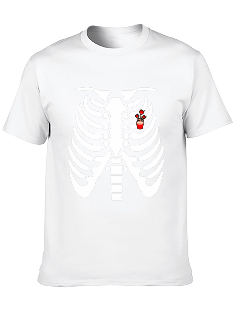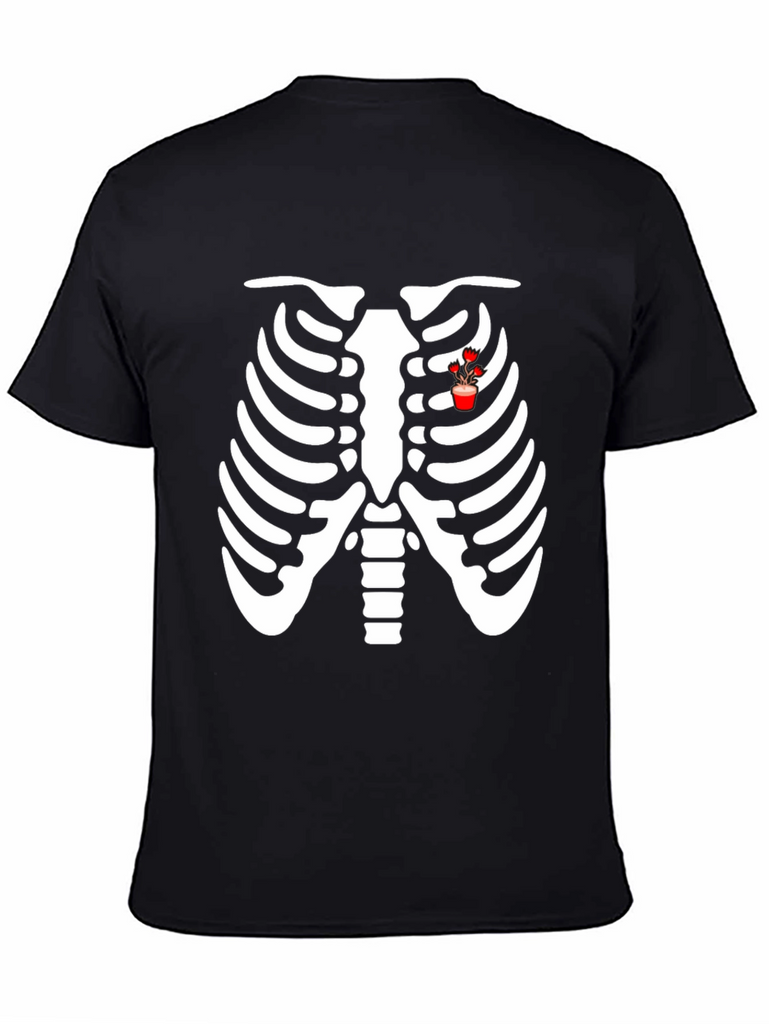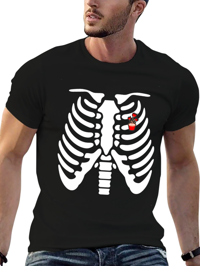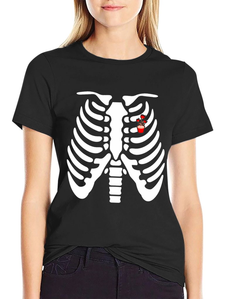 Show off your unique sense of style with this eye-catching black t-shirt. Featuring a bold rib cage design in white, this shirt puts a playful twist on anatomy. A vibrant potted flower in place of the heart adds a touch of whimsy and color. This comfortable and durable tee is perfect for casual outings, parties, or expressing your love for alternative fashion. Stand out from the crowd and make a statement with this unique piece! Great for everyday wear, costume parties, or a fun gift.