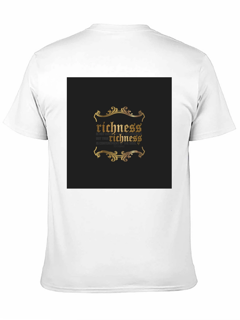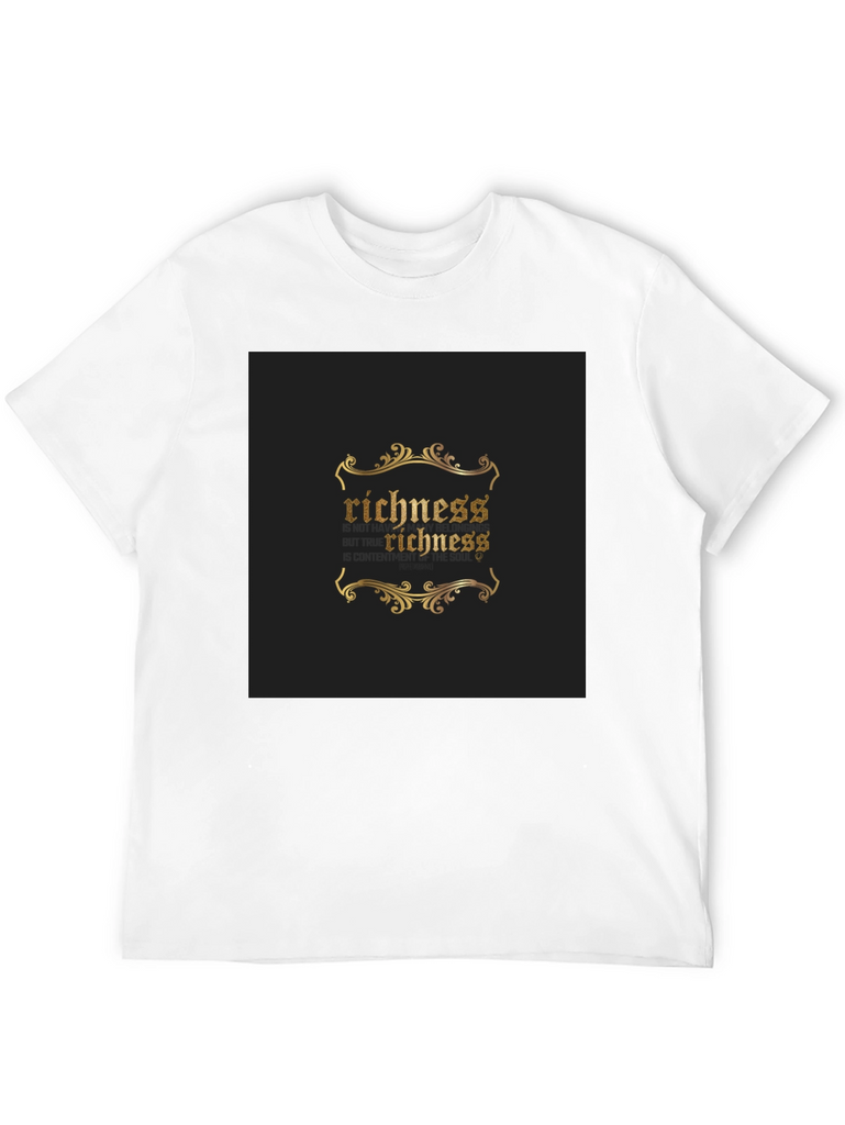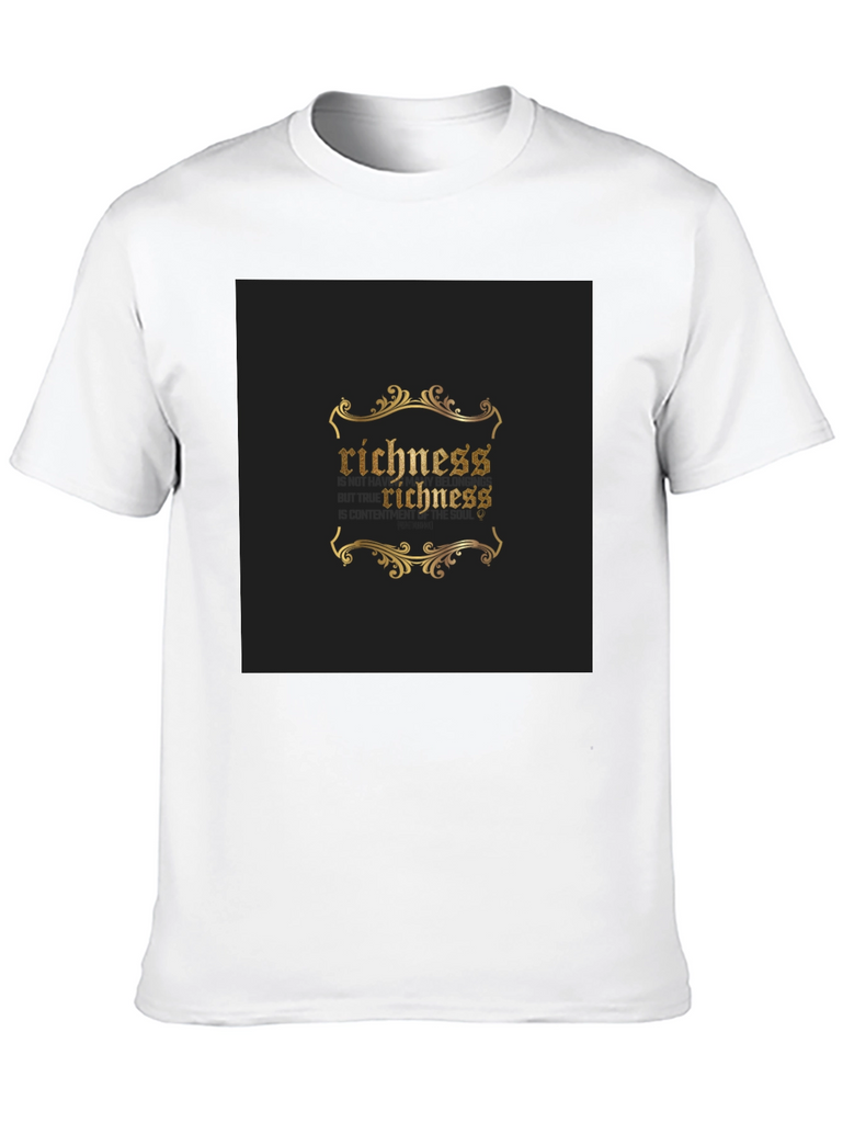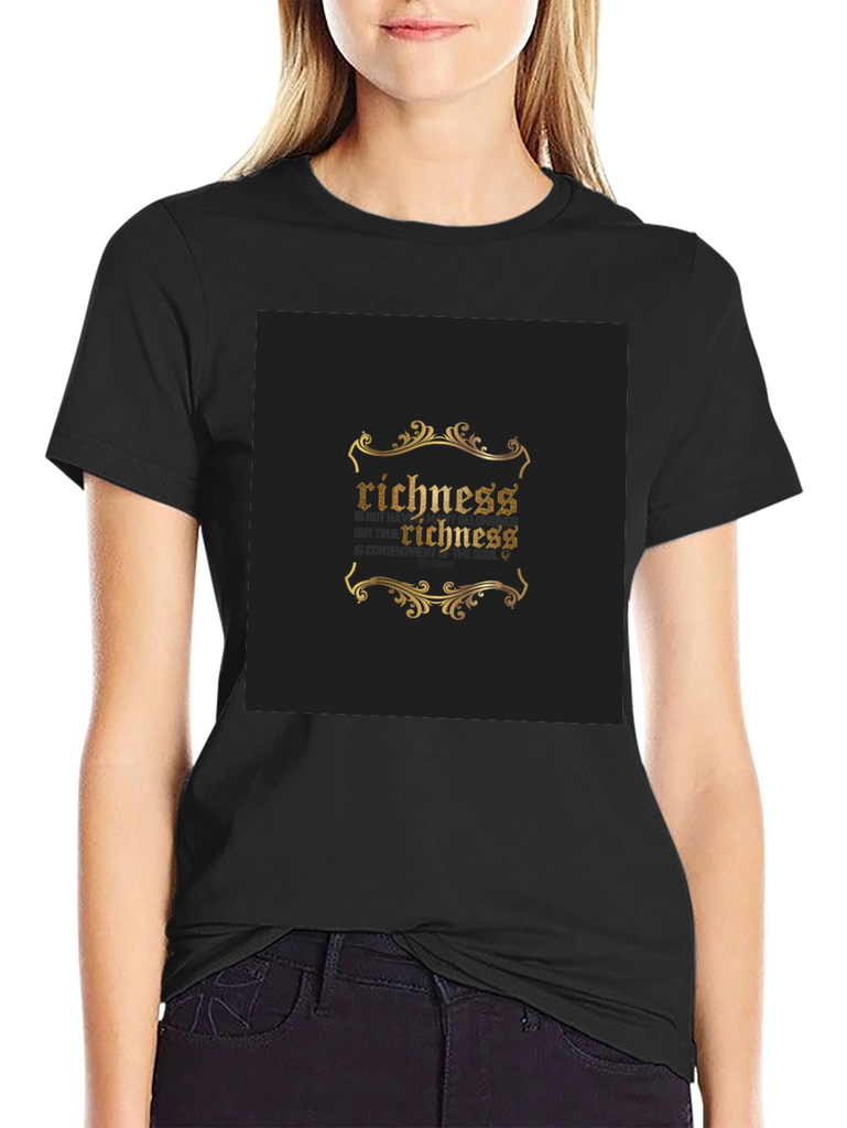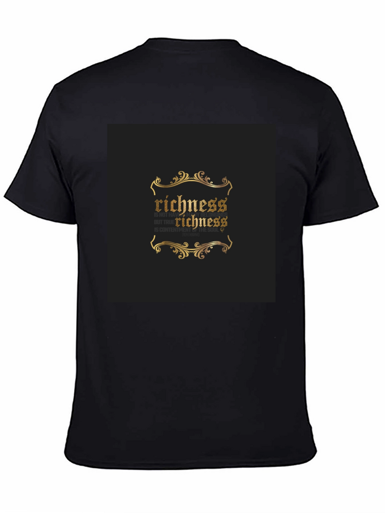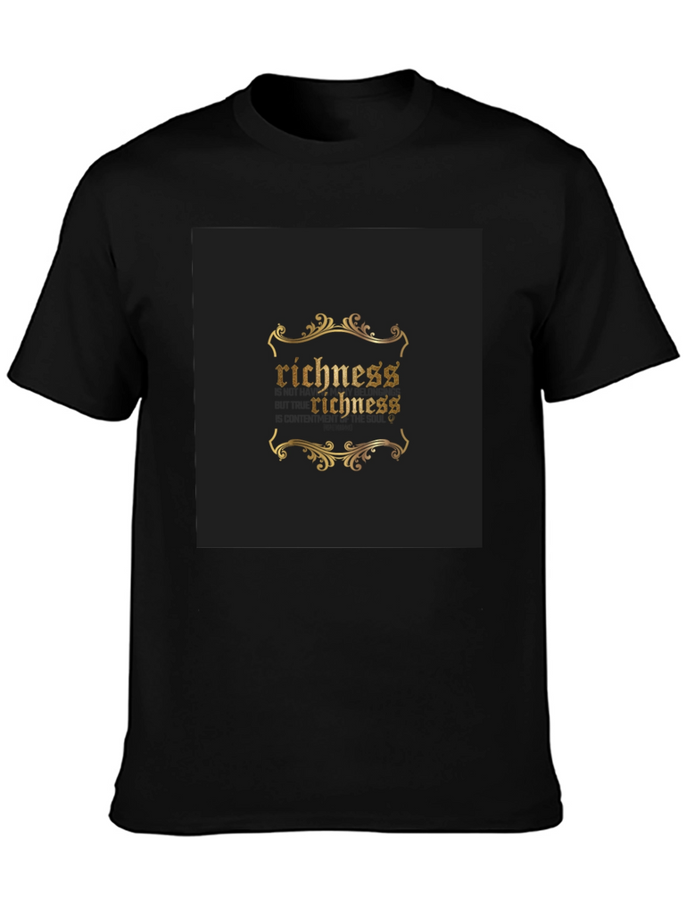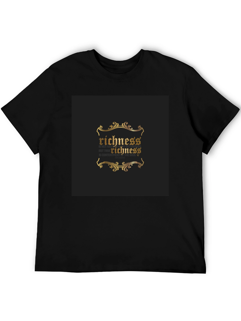 Embrace timeless wisdom with this elegant black t-shirt. Featuring a striking gold-toned print with the word "richness" displayed in a decorative frame, this tee blends classic style with profound meaning. Made from a comfortable and durable fabric, it is soft to the touch and built for everyday wear. The design adds a touch of sophistication, making it perfect for casual outings or layering under a jacket. Its unisex style ensures a great fit for anyone. This t-shirt makes a statement about true wealth, inviting reflection and sparking conversation wherever you go.