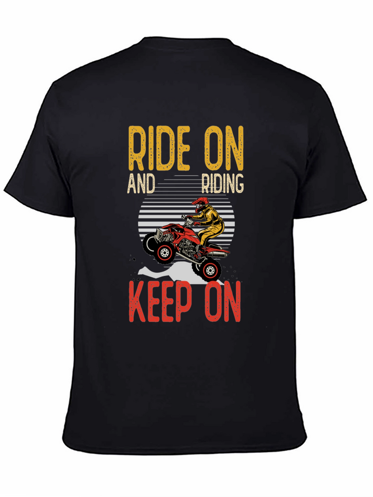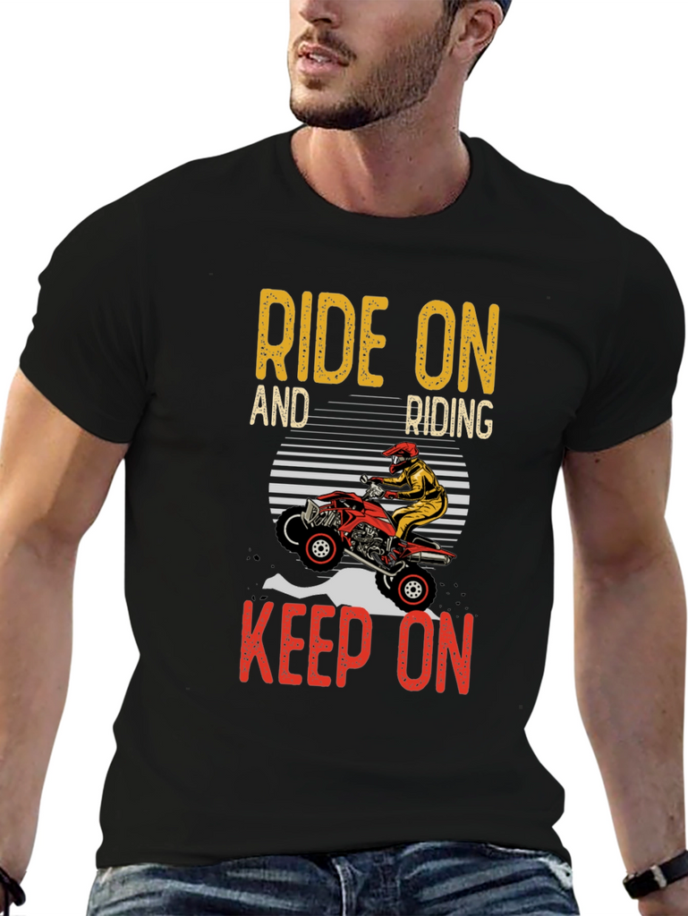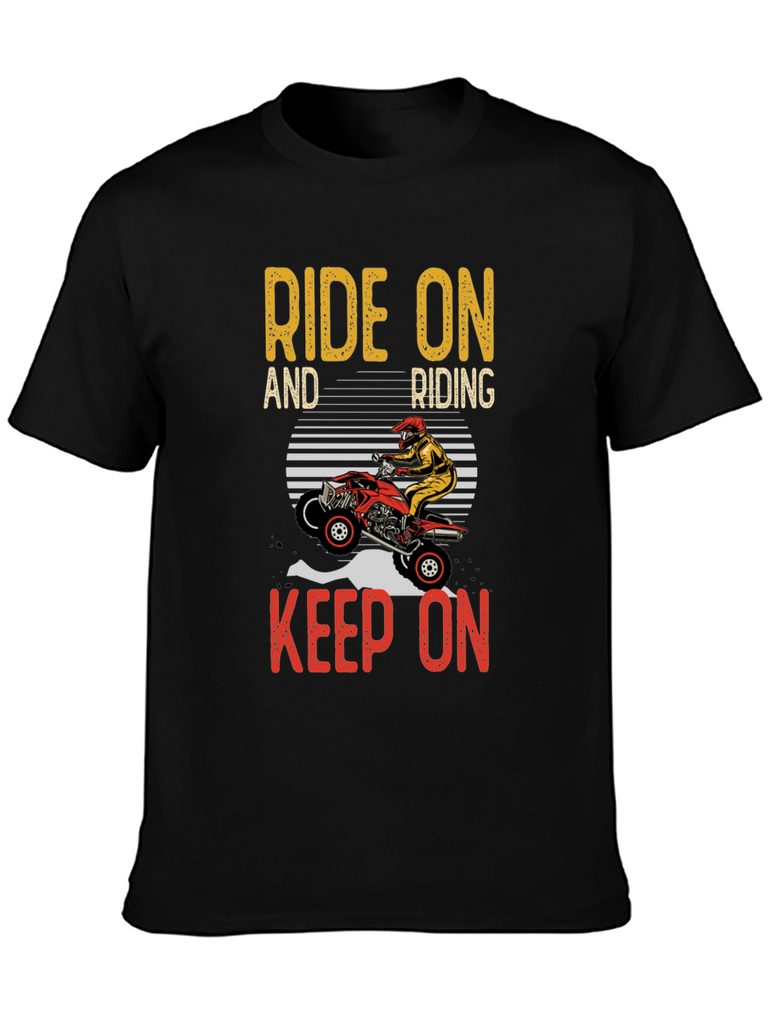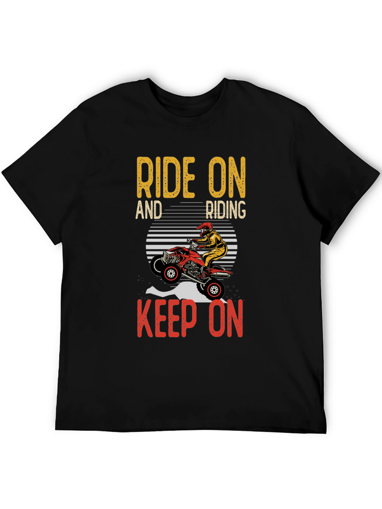 Gear up for adventure with this eye-catching black t-shirt featuring a dynamic ATV design. The graphic showcases a rider on an all-terrain vehicle against a stylized sun background. Bold lettering spells out "RIDE ON" and "KEEP ON", adding an energetic touch. Made from a comfortable-looking fabric, this tee is perfect for casual wear or showing off your love for outdoor thrills. Whether you're hitting the trails or just hanging out, this shirt will rev up your style. A great gift for ATV enthusiasts!