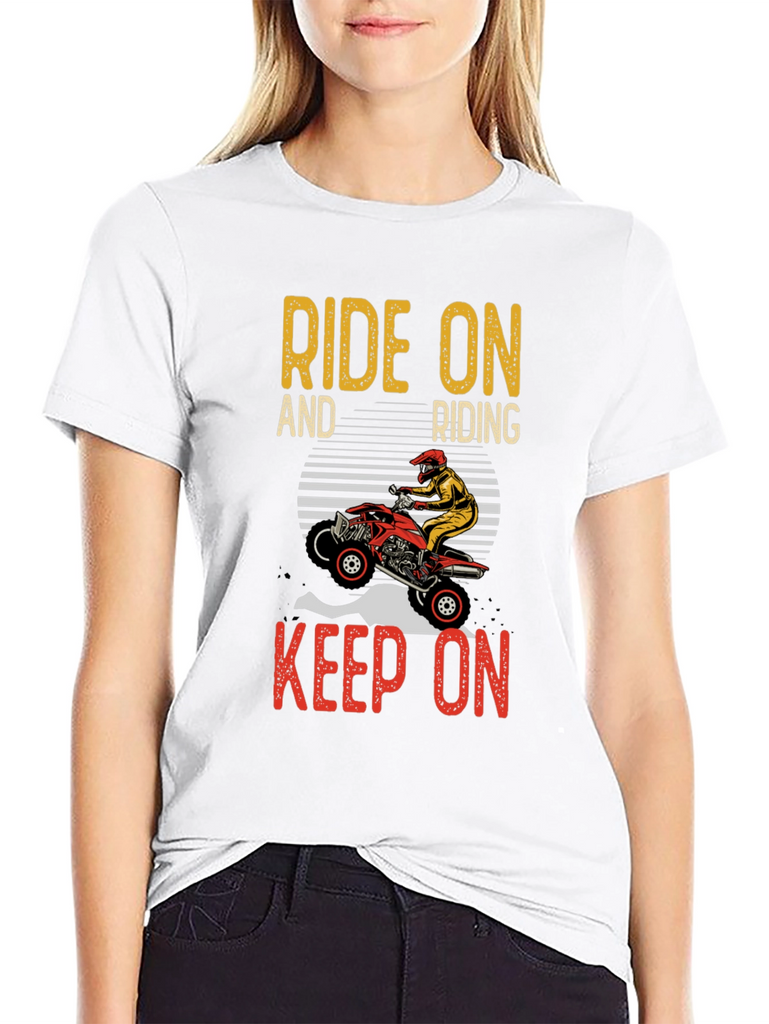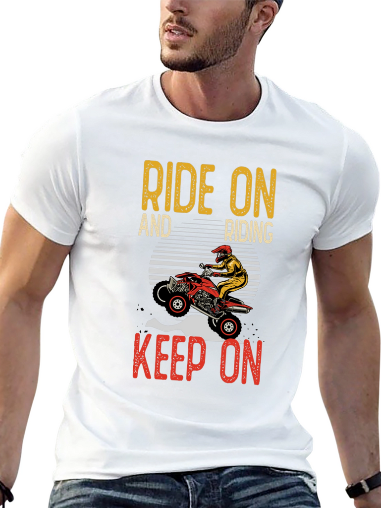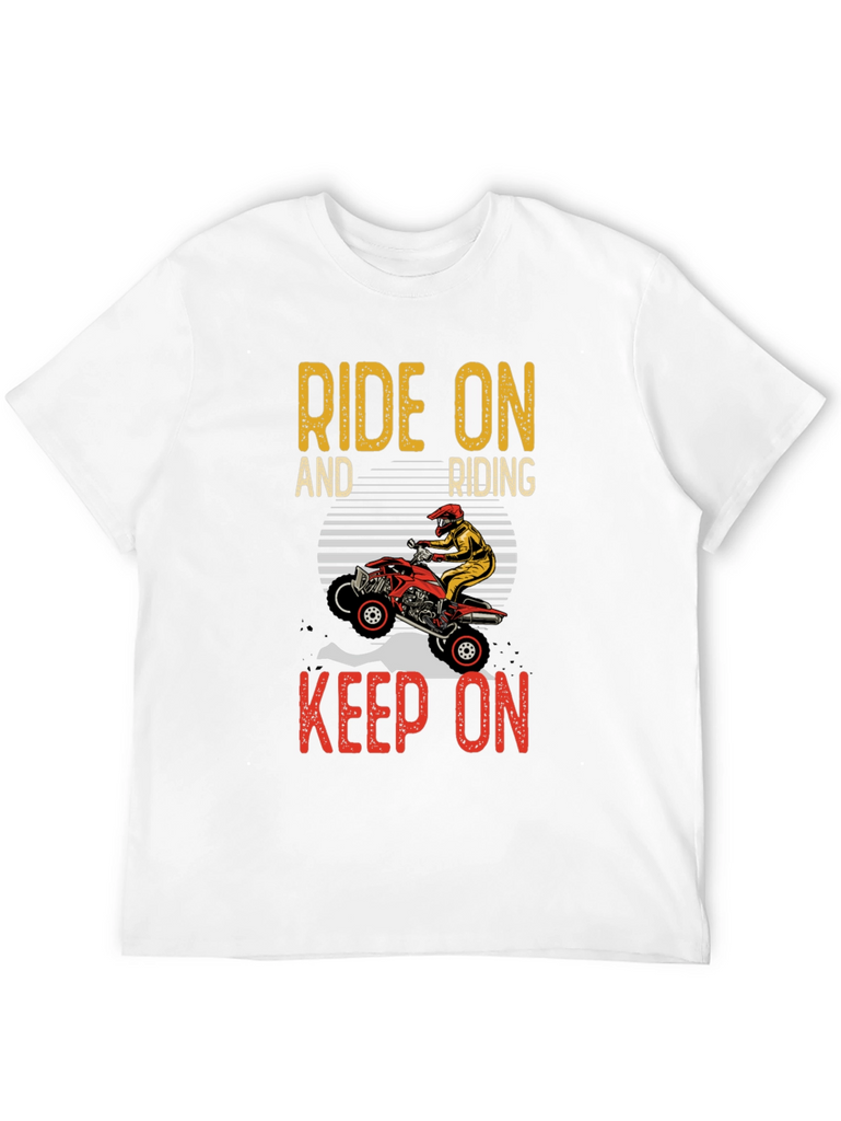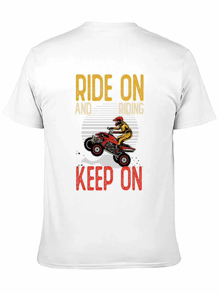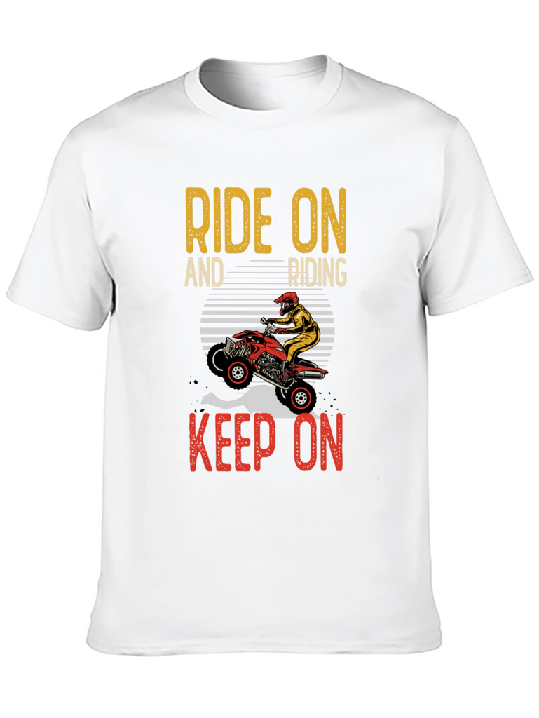 Gear up for adventure with this eye-catching black t-shirt featuring a dynamic ATV design. The graphic showcases a rider on an all-terrain vehicle against a stylized sun background. Bold lettering spells out "RIDE ON" and "KEEP ON", adding an energetic touch. Made from a comfortable-looking fabric, this tee is perfect for casual wear or showing off your love for outdoor thrills. Whether you're hitting the trails or just hanging out, this shirt will rev up your style. A great gift for ATV enthusiasts!