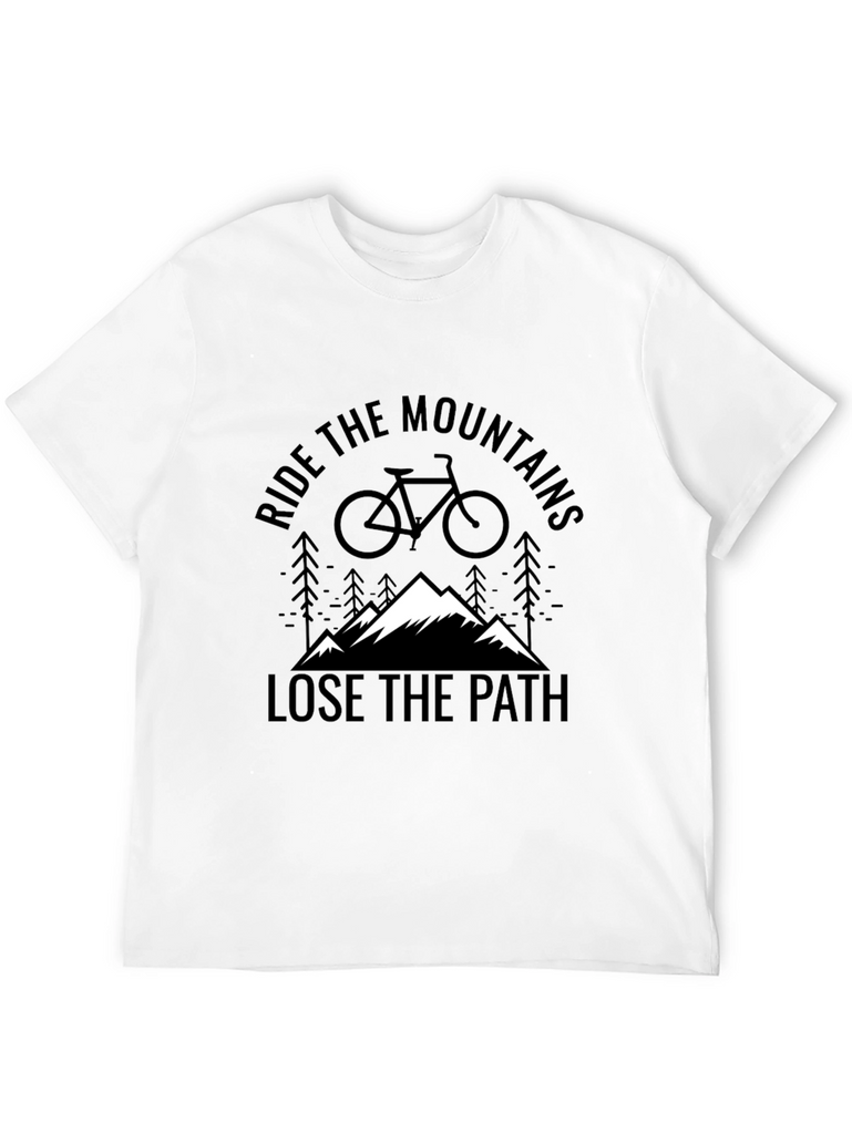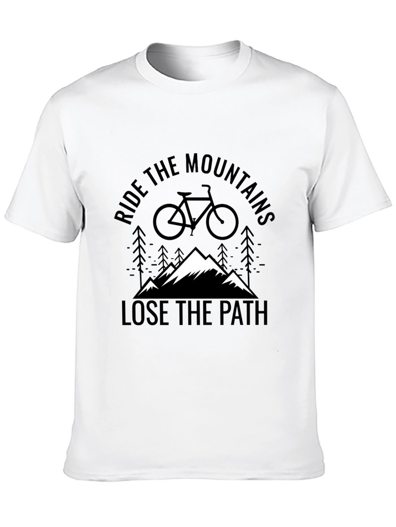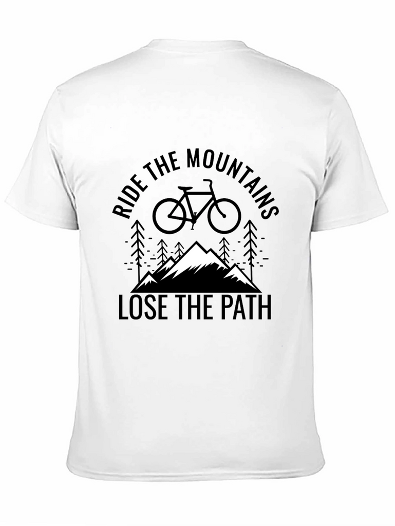 Embrace your adventurous side with this bold black t-shirt. Featuring a striking graphic design, it encourages you to "Ride the Mountains" and "Lose the Path." The design includes a mountain range, bike silhouette, and subtle pine tree accents. Made from comfortable fabric, it's perfect for casual wear or outdoor adventures. Show off your passion for biking and the outdoors with this unique tee. Great for weekend hikes, bike rides, or everyday style. A perfect addition to any adventure seeker's wardrobe.