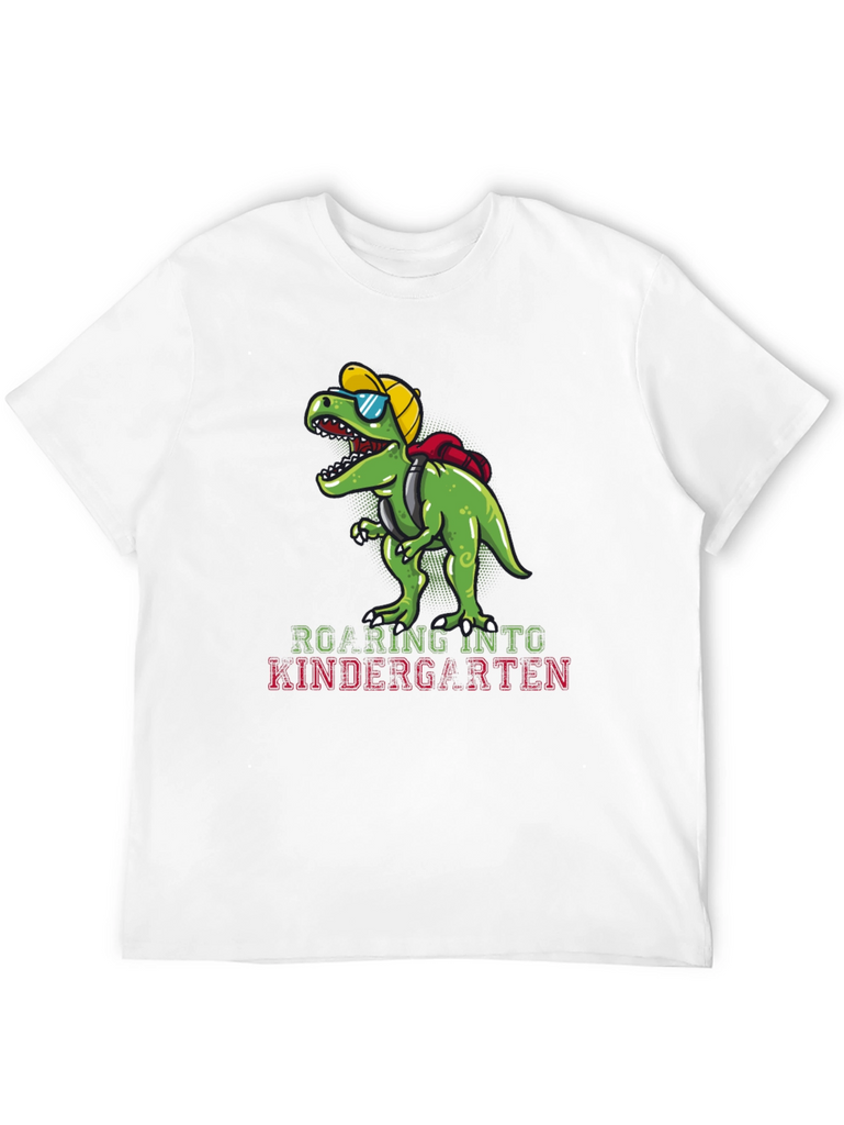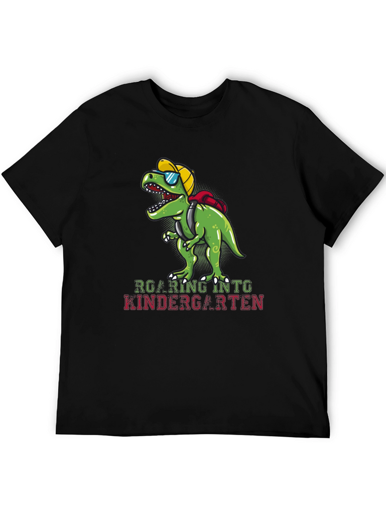 Get ready for kindergarten with this fun and vibrant t-shirt! The black tee features a playful cartoon dinosaur wearing a yellow hat, sunglasses, and a backpack, ready for school. The design includes the phrase "ROARING INTO KINDERGARTEN" in eye-catching green and red fonts. Made from comfortable material, this shirt is perfect for your little one's first day or everyday wear. Let your child showcase their excitement for kindergarten with this unique and adorable t-shirt.