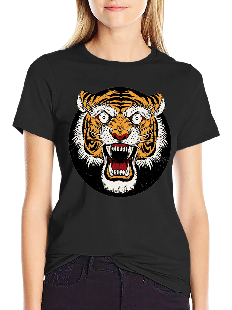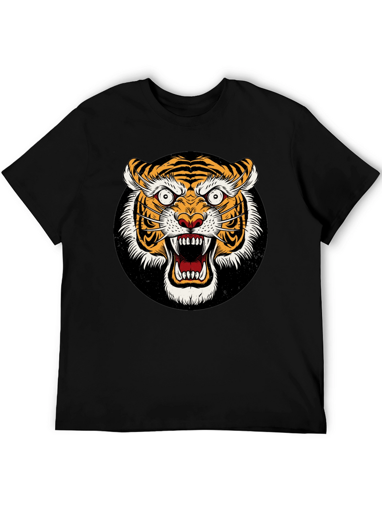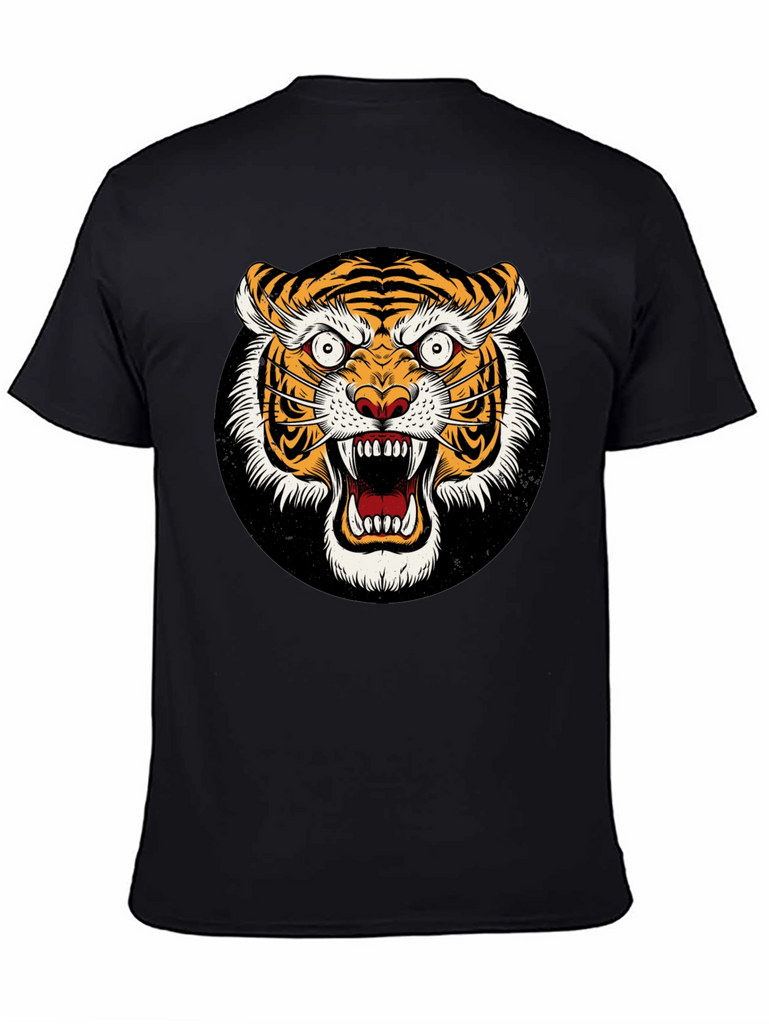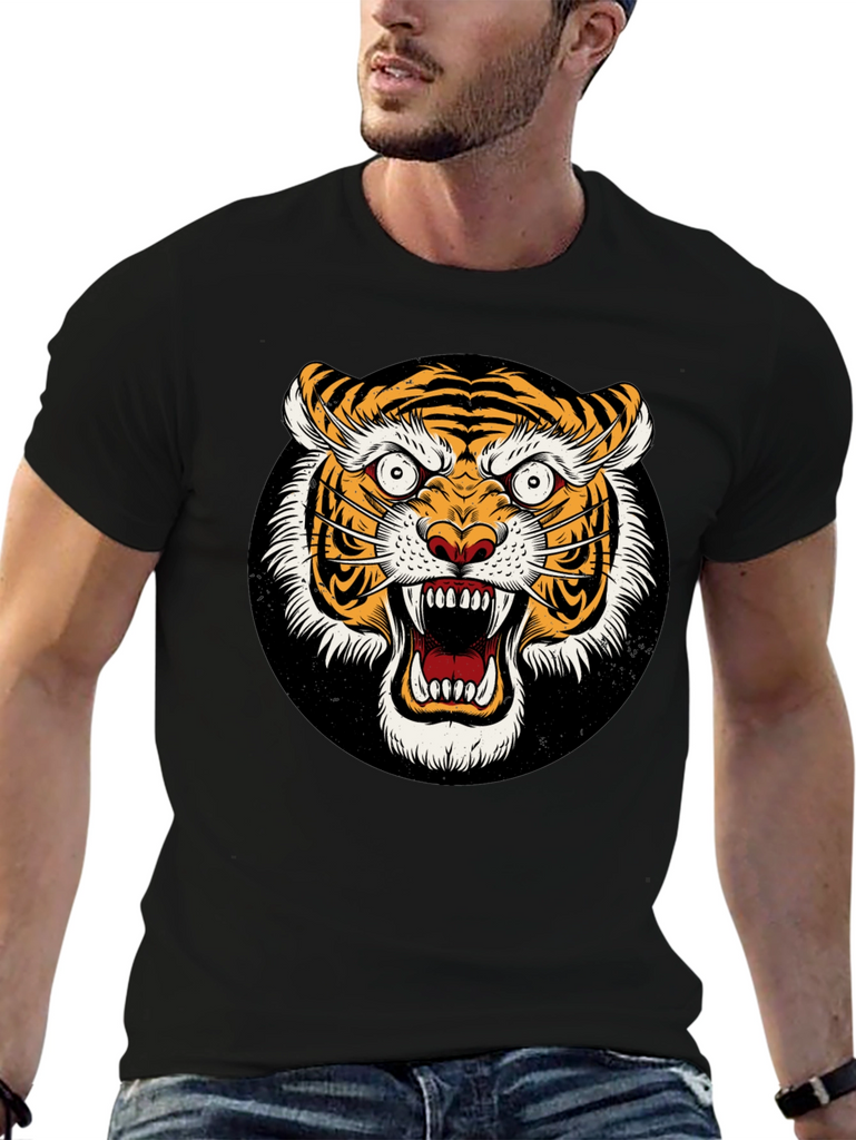 Unleash your wild side with this striking black t-shirt featuring a ferocious tiger graphic. The detailed design showcases a vibrant, roaring tiger face set against a black background. Made from a comfortable-looking fabric, this tee offers both style and comfort. The bold graphic is perfect for making a statement and expressing your unique personality. Ideal for casual wear, concerts, or adding an edgy touch to any outfit. Grab yours today and show off your fierce style!