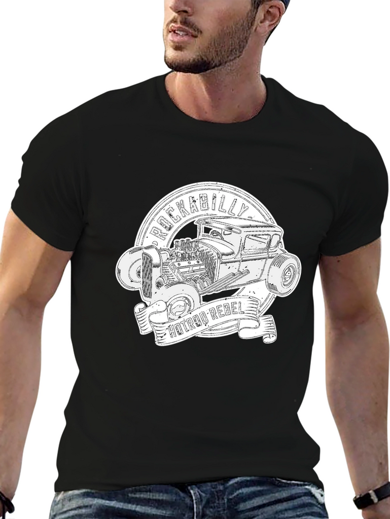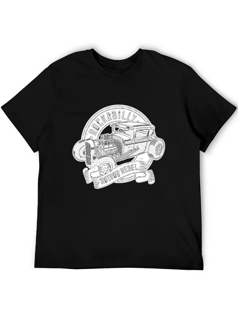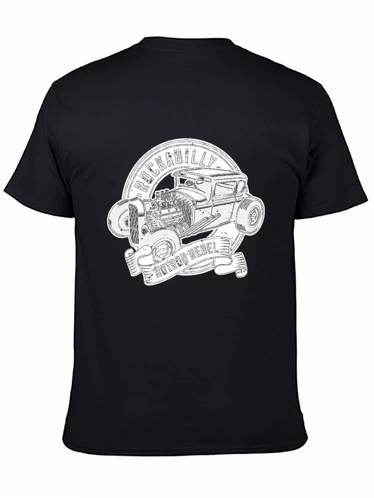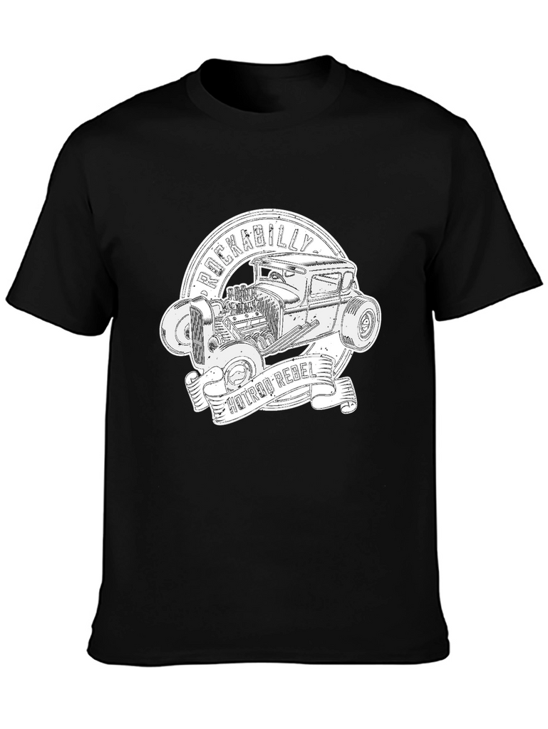 Showcase your love for classic cars and vintage style with this striking black t-shirt. Featuring a bold graphic of a vintage hotrod, encircled by "Rockabilly" lettering and a "Hotrod Rebel" banner, this tee is a must-have for enthusiasts. The detailed design stands out against the black background, offering a cool and edgy look. Made from comfortable, breathable fabric, this t-shirt is perfect for casual wear, car shows, or a night out. Express your passion for the rockabilly and hotrod culture with this unique and stylish tee.