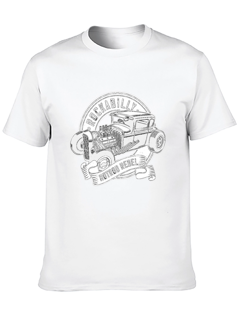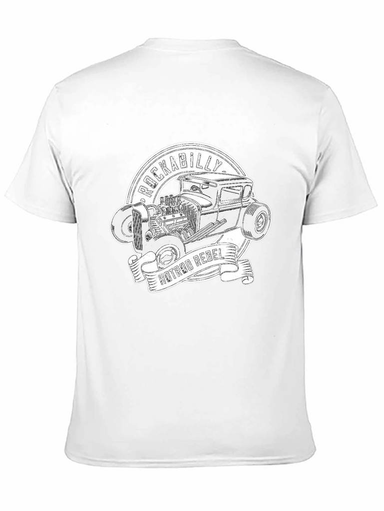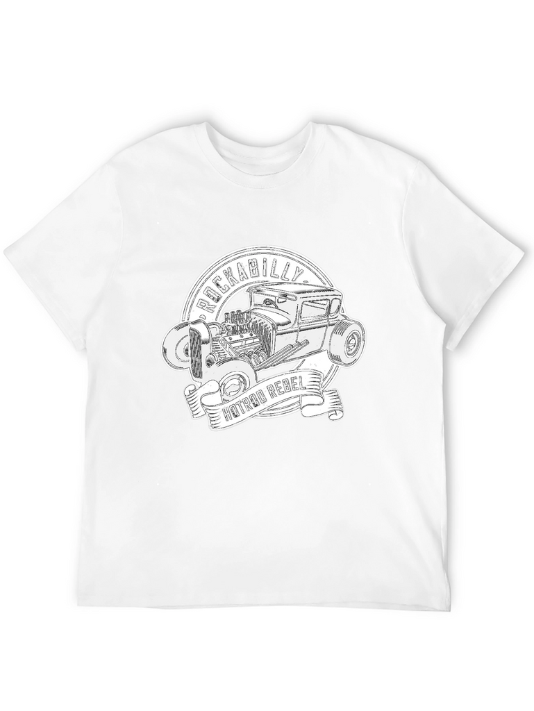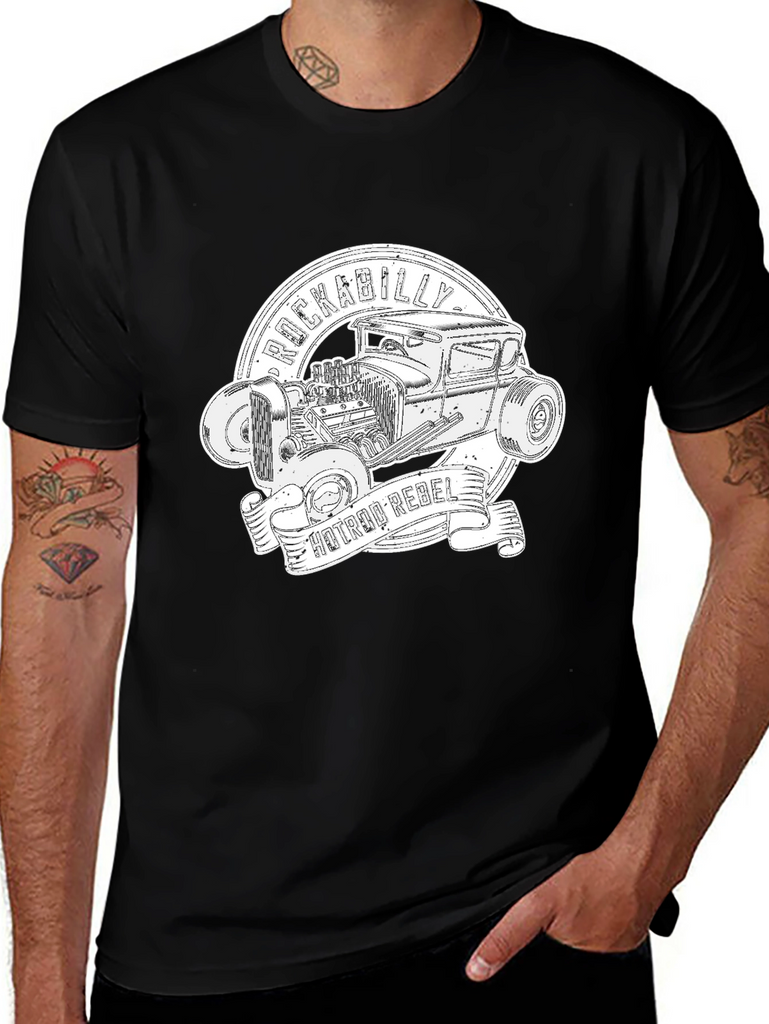 Showcase your love for classic cars and vintage style with this striking black t-shirt. Featuring a bold graphic of a vintage hotrod, encircled by "Rockabilly" lettering and a "Hotrod Rebel" banner, this tee is a must-have for enthusiasts. The detailed design stands out against the black background, offering a cool and edgy look. Made from comfortable, breathable fabric, this t-shirt is perfect for casual wear, car shows, or a night out. Express your passion for the rockabilly and hotrod culture with this unique and stylish tee.