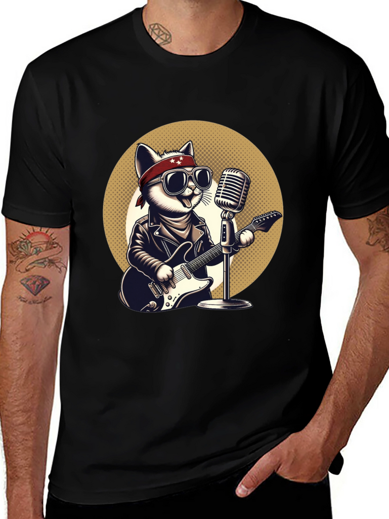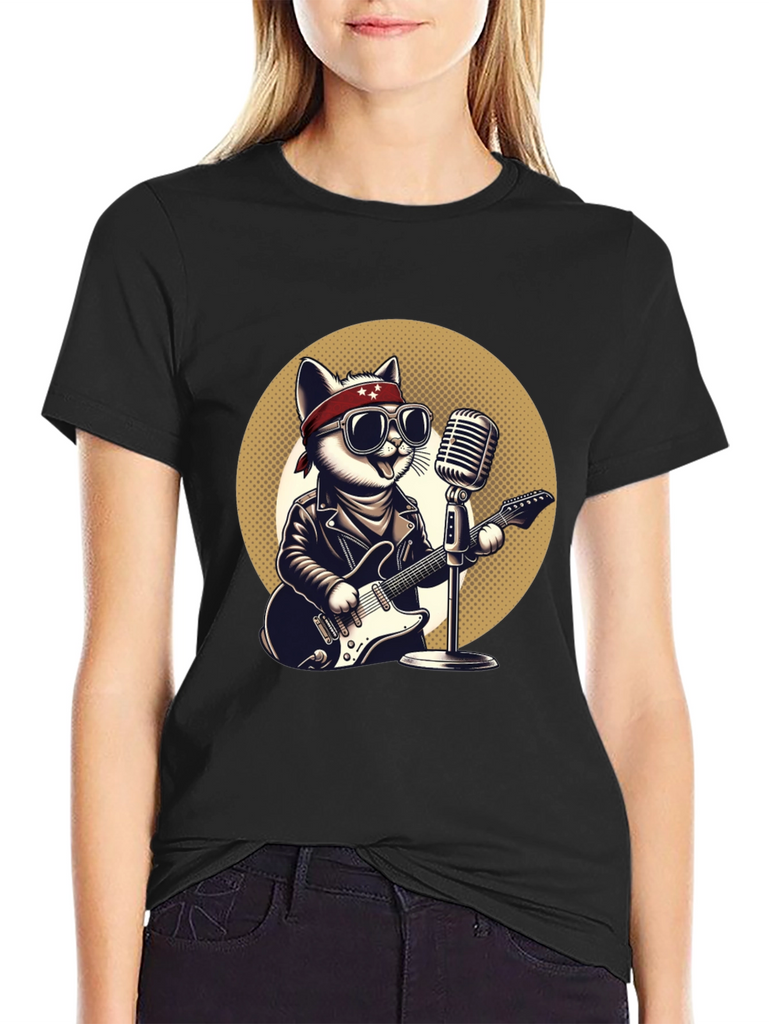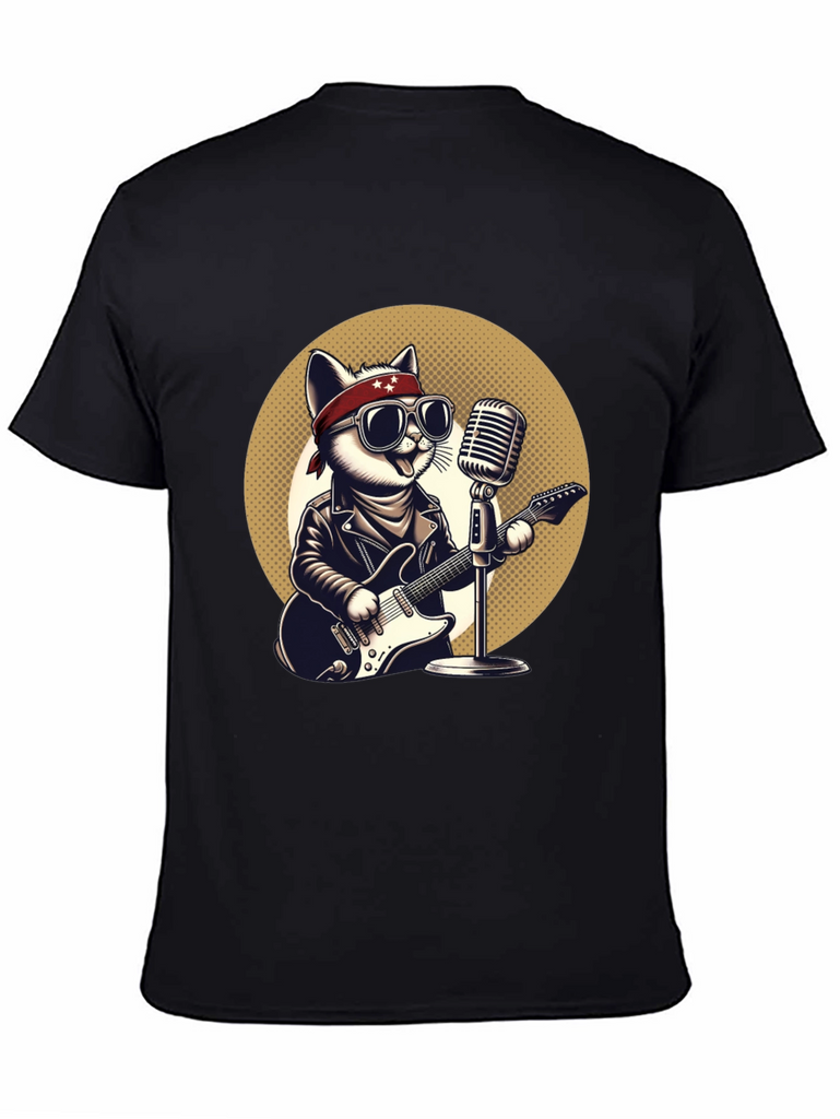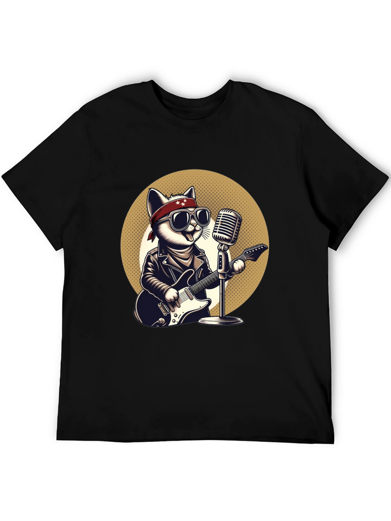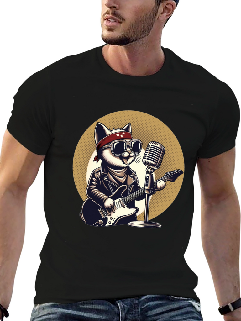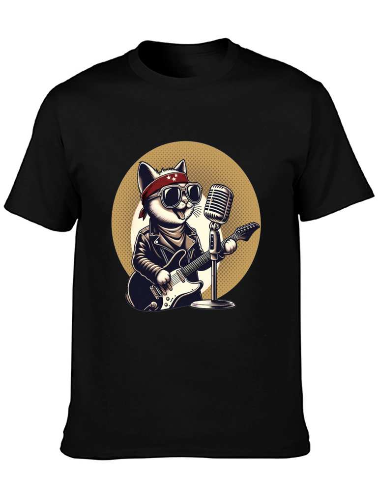 Rock your style with this cool and edgy black t-shirt! Featuring a unique graphic of a cat dressed as a rockstar, complete with sunglasses, a leather jacket, and a guitar, this tee is purr-fect for music lovers and cat enthusiasts alike. The design showcases the feline musician belting out a tune into a vintage microphone, all set against a stylish backdrop. Made from comfortable fabric, this short-sleeved shirt is ideal for casual wear, concerts, or just showing off your quirky personality. Grab this tee and let your inner rockstar shine!