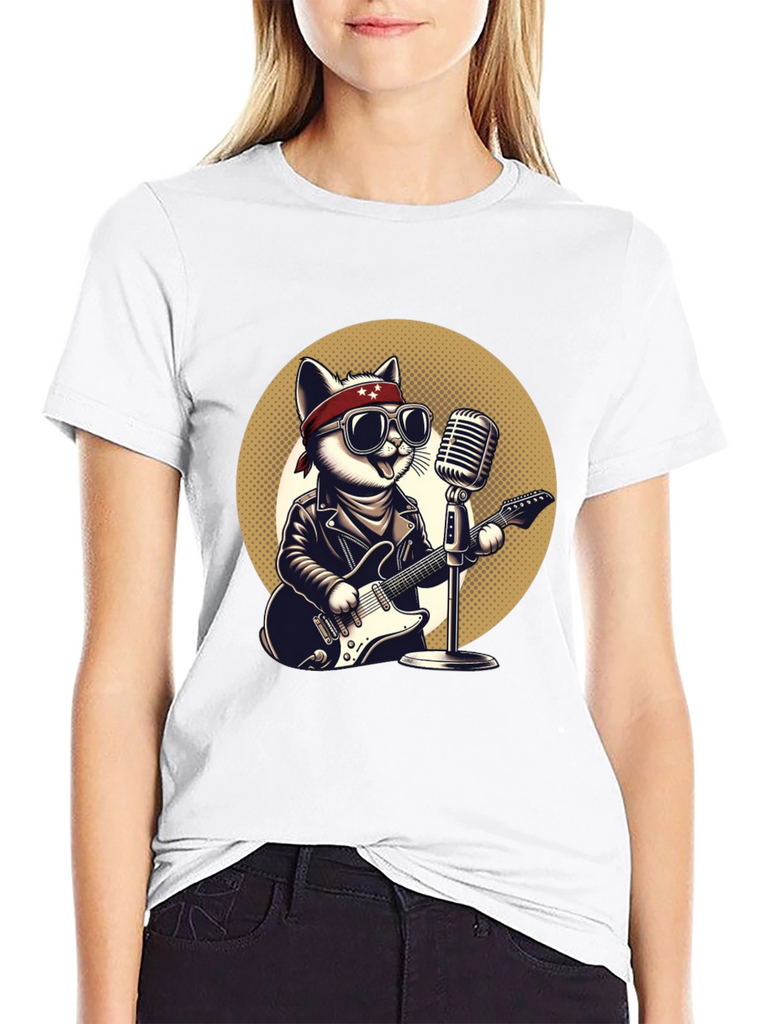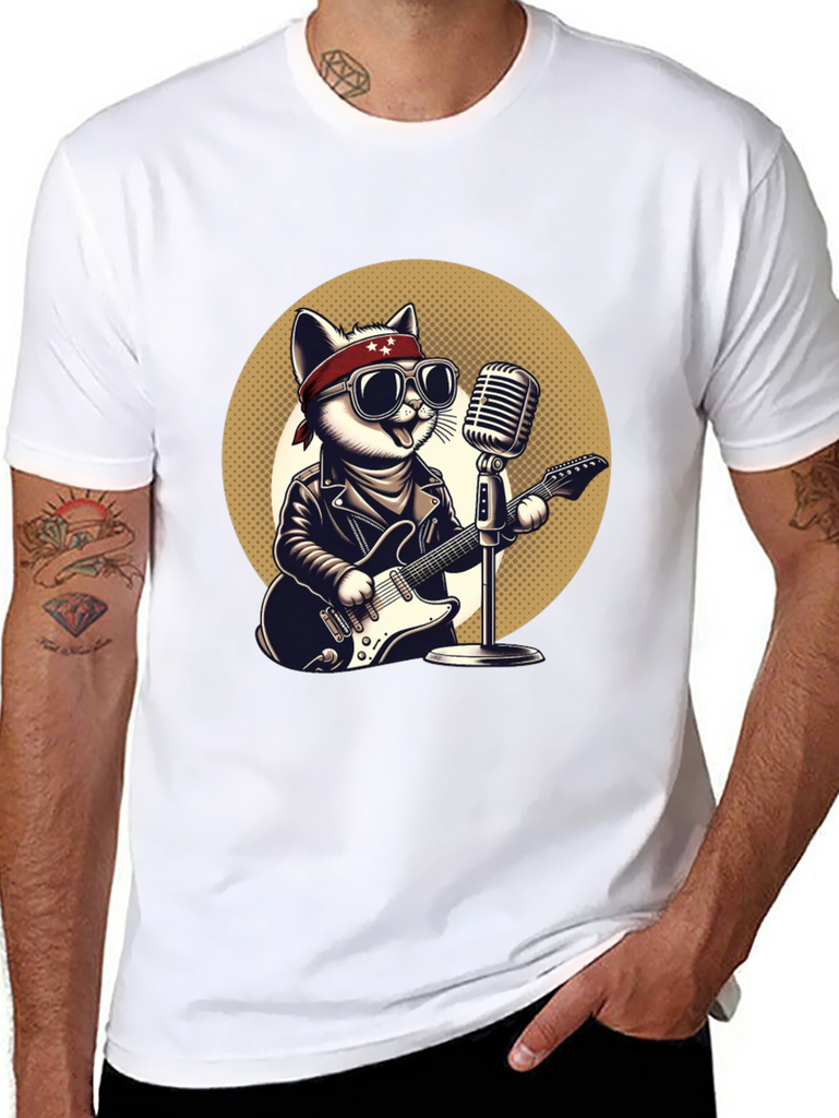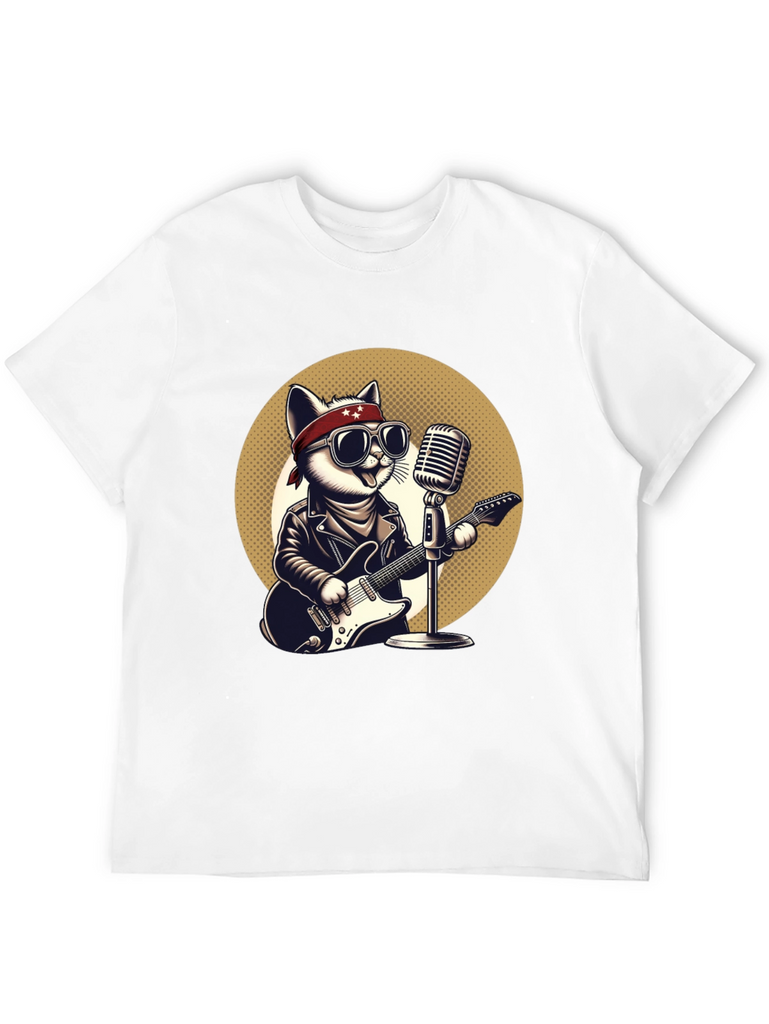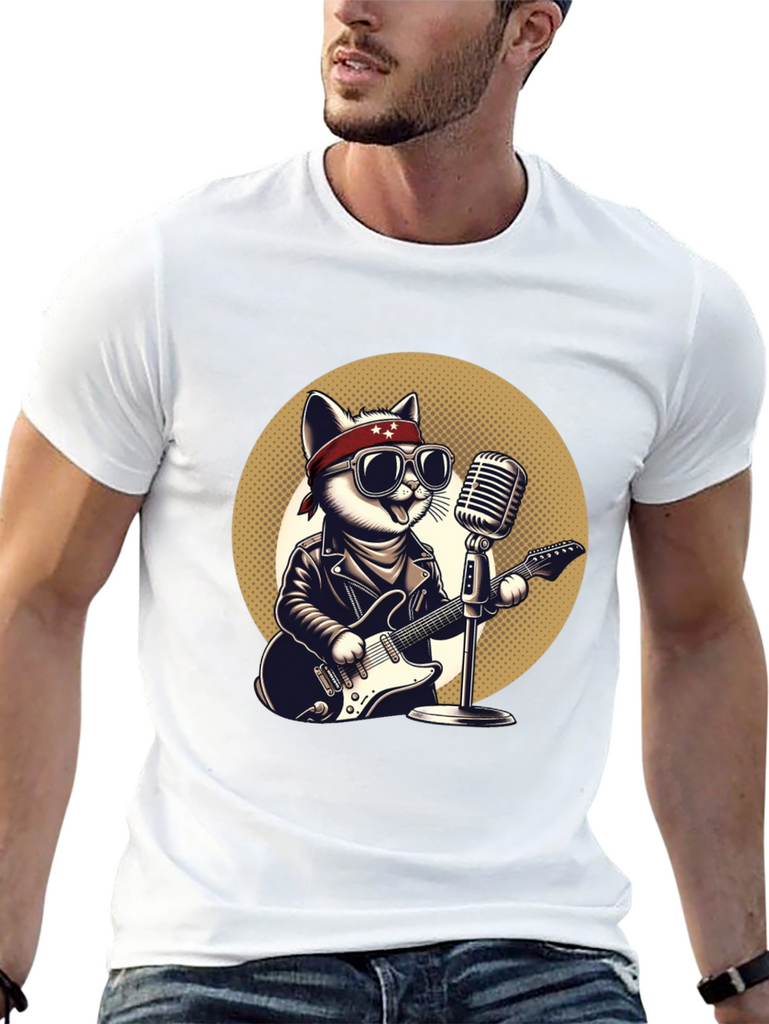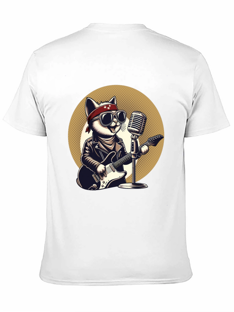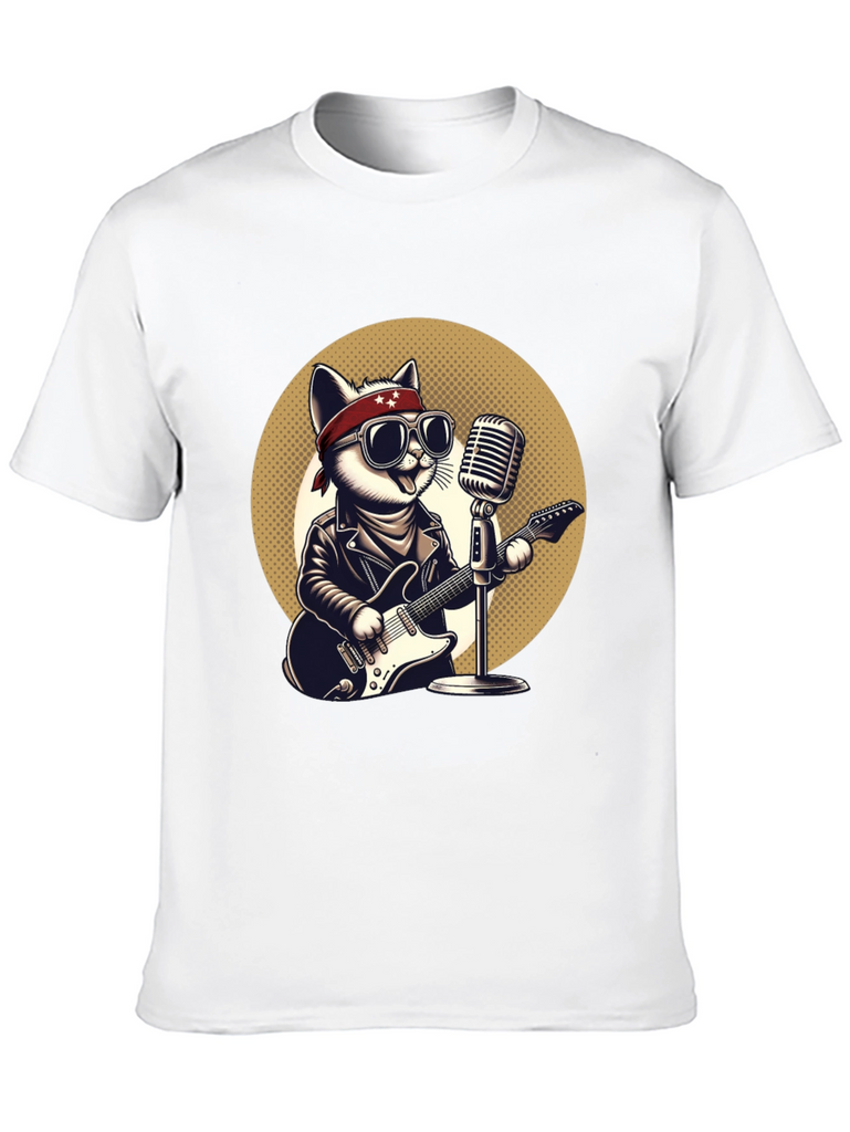 Rock your style with this cool and edgy black t-shirt! Featuring a unique graphic of a cat dressed as a rockstar, complete with sunglasses, a leather jacket, and a guitar, this tee is purr-fect for music lovers and cat enthusiasts alike. The design showcases the feline musician belting out a tune into a vintage microphone, all set against a stylish backdrop. Made from comfortable fabric, this short-sleeved shirt is ideal for casual wear, concerts, or just showing off your quirky personality. Grab this tee and let your inner rockstar shine!