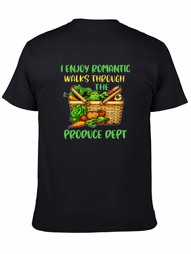 This black t-shirt features a humorous and charming design. The graphic showcases a basket overflowing with fresh produce like lettuce, carrots, and potatoes, accompanied by the phrase "I ENJOY ROMANTIC WALKS THROUGH THE PRODUCE DEPT." The playful text and colorful imagery make this shirt a fun conversation starter. Perfect for grocery shoppers and food enthusiasts alike. Show off your love for fresh produce and a touch of humor with this unique tee. It's a great addition to any casual wardrobe!