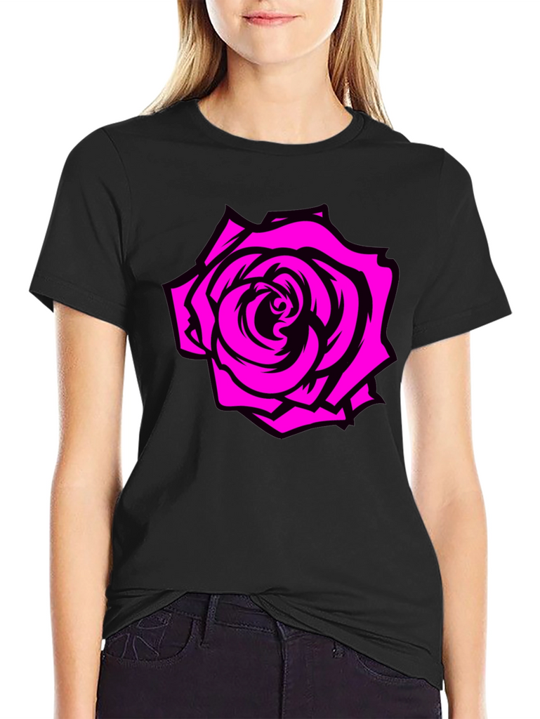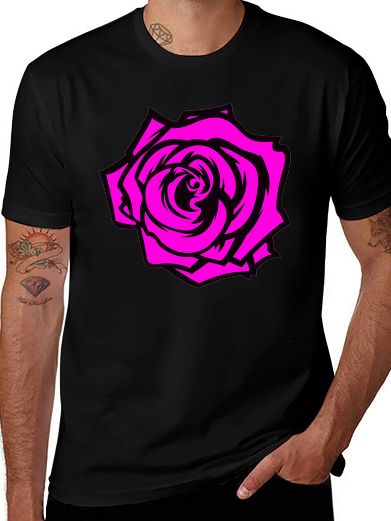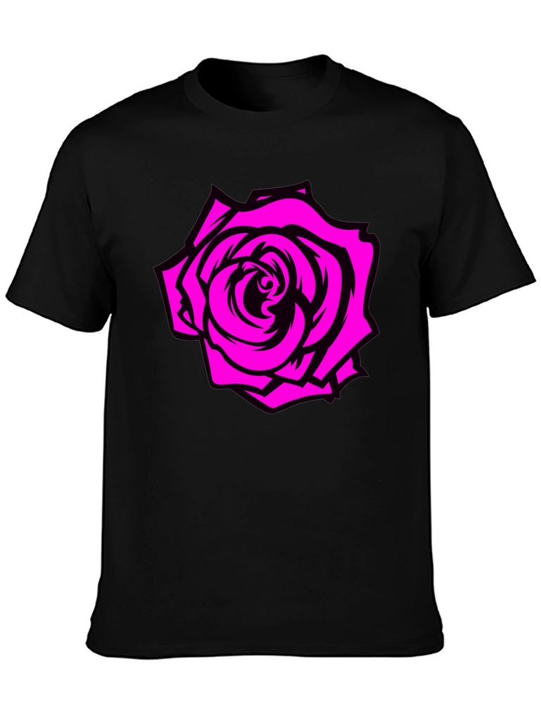 Embrace bold style with this black tee featuring a striking rose graphic. The vibrant pink rose design stands out against the classic black background, offering a modern and edgy look. Made from comfortable, breathable fabric, this t-shirt is ideal for everyday wear. Perfect for casual outings, concerts, or making a statement wherever you go. Pair it with jeans or shorts for a relaxed yet stylish outfit. Add a touch of floral flair to your wardrobe with this unique graphic tee!