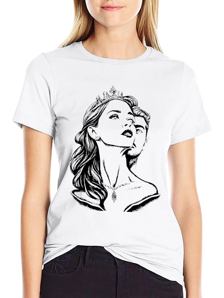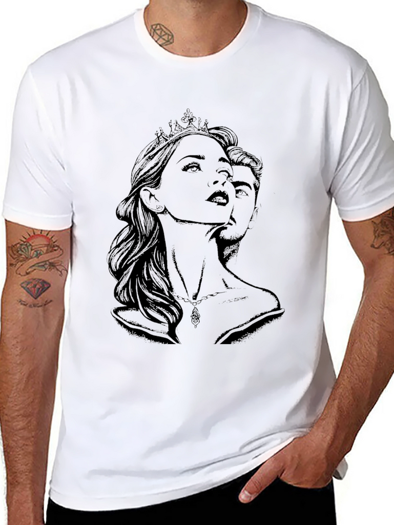 Elevate your style with this striking black t-shirt featuring an artistic graphic print of a queen and king. The intricate design showcases a woman with a crown and a man's face behind her, creating a captivating visual. Made from a soft, comfortable fabric, this tee offers a great fit and feel. Perfect for casual wear, making a statement, or expressing your unique personality. Pair it with jeans or shorts for an effortlessly cool look. This eye-catching t-shirt is a must-have for anyone who appreciates art and distinctive fashion.