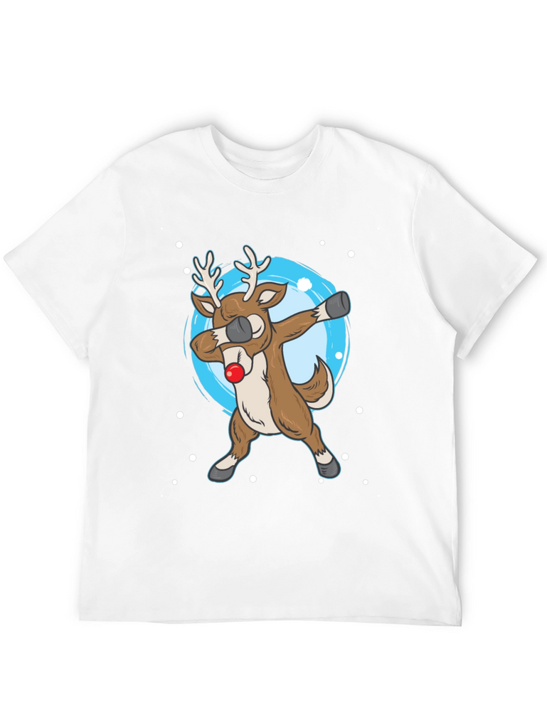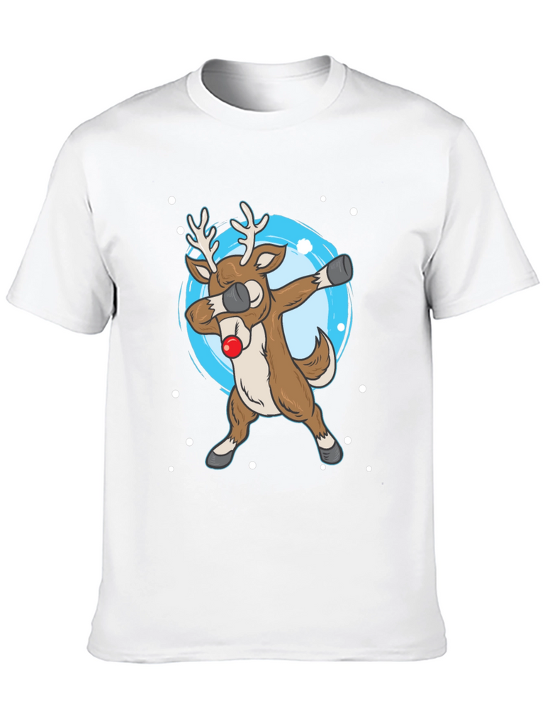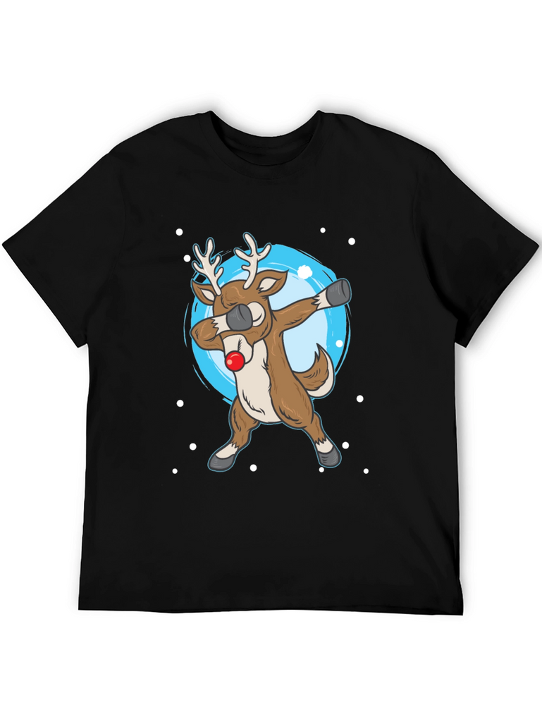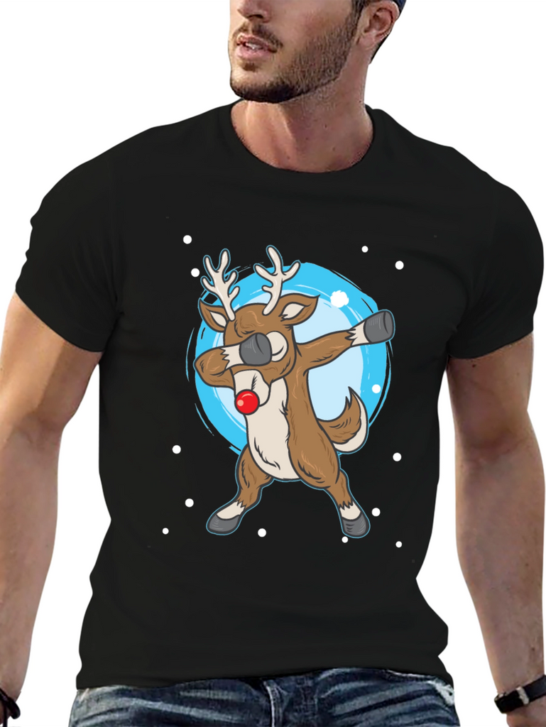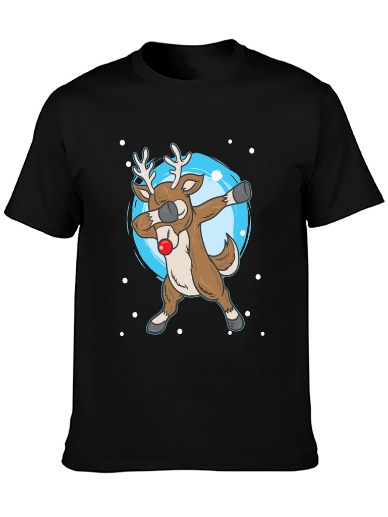 Spread some holiday cheer with this fun Rudolph the Red-Nosed Reindeer dabbing T-shirt. The black tee features a cartoon graphic of Rudolph in a dabbing pose, set against a festive blue and white snowy background. The vibrant design makes it a perfect choice for Christmas parties, casual holiday gatherings, or everyday wear during the festive season. Made from comfortable fabric, this shirt is both stylish and cozy. Show off your playful side and celebrate Christmas in style with this unique and eye-catching T-shirt.
