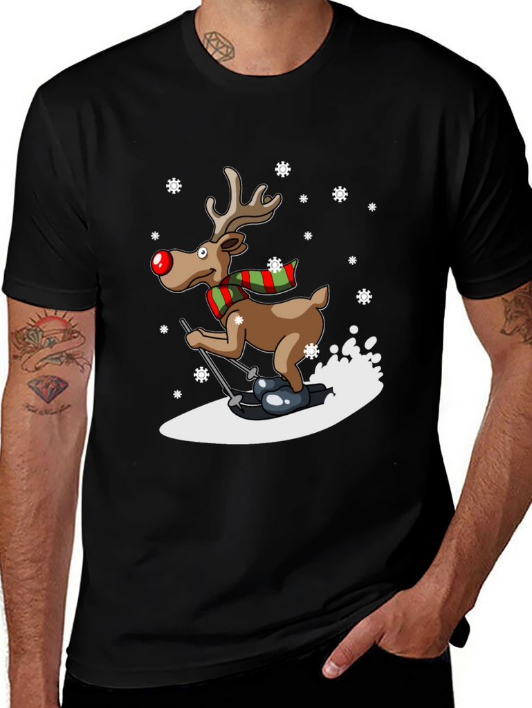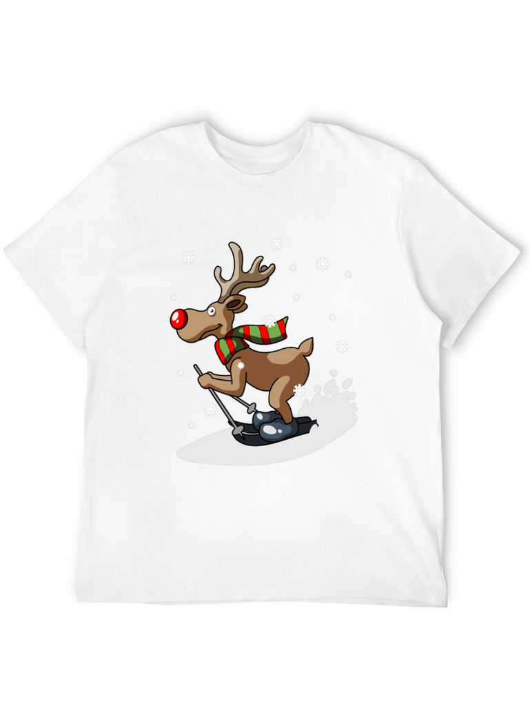 Spread holiday cheer with this fun and festive t-shirt. The black tee features a cartoon of Rudolph the Red-Nosed Reindeer joyfully skiing downhill. Rudolph sports a red nose, antlers, and a green and red striped scarf. White snowflakes complete the wintry design. This playful t-shirt is perfect for Christmas parties, holiday gatherings, or just showing off your festive spirit. The comfortable fabric makes it great for everyday wear during the holiday season. Makes a unique and humorous gift for friends and family who love Christmas.