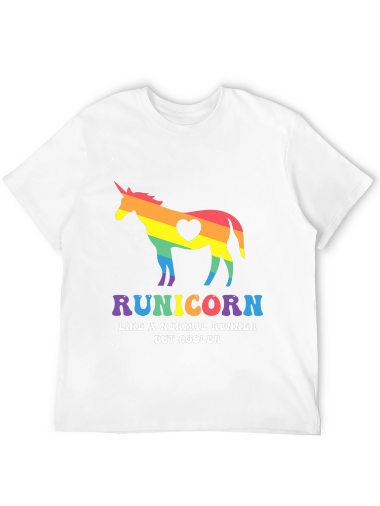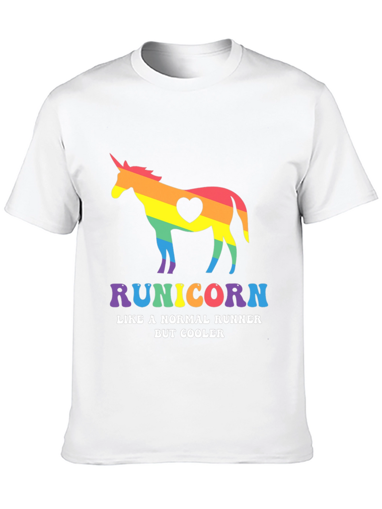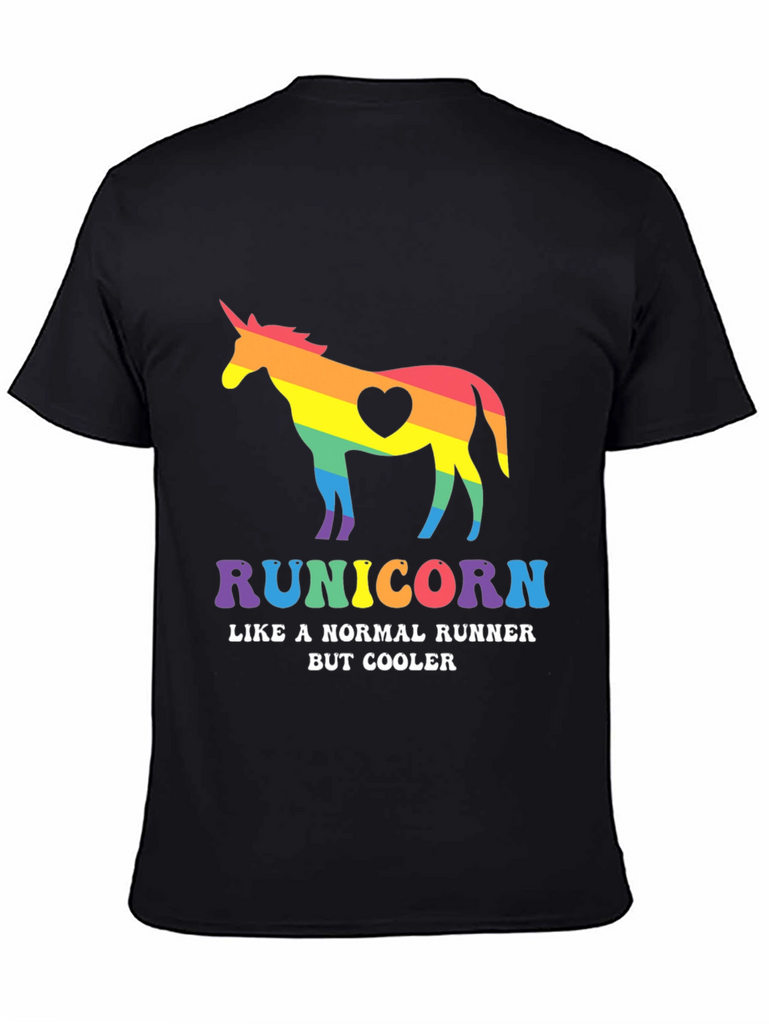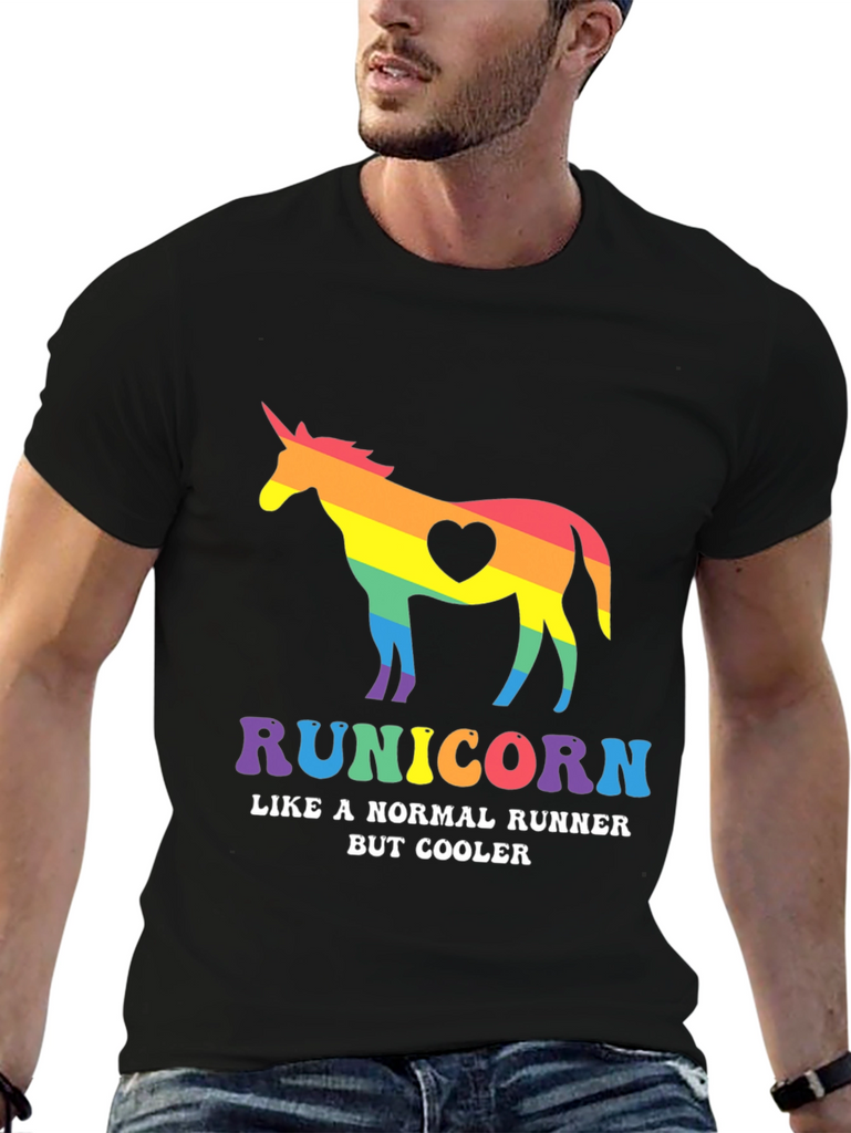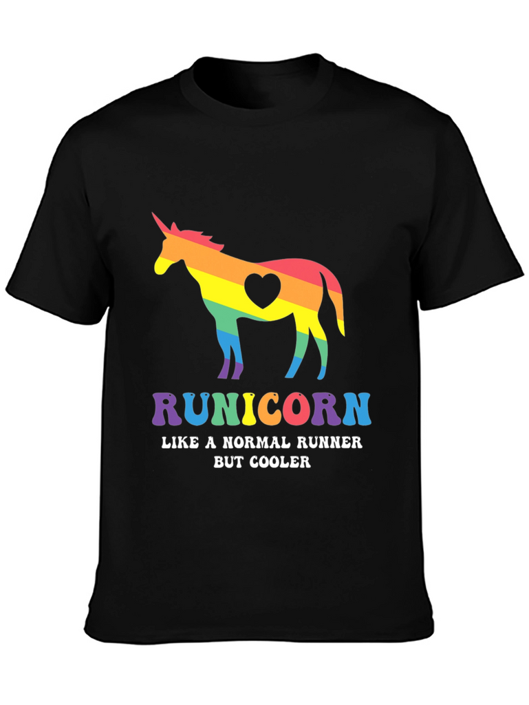 Show off your unique style with this fun Runicorn graphic tee. This black t-shirt features a vibrant, rainbow-colored unicorn silhouette with a heart detail. The text "Runicorn - Like a normal runner but cooler" adds a playful touch. Made from a comfortable material, this tee is perfect for everyday wear, workouts, or casual outings. A great conversation starter and a unique addition to your wardrobe. Wear your pride and personality with this cool and comfortable tee!