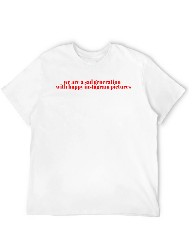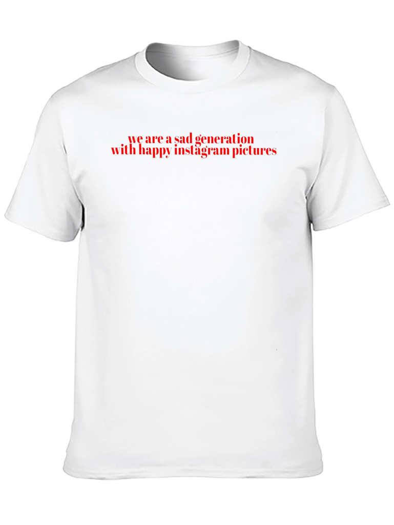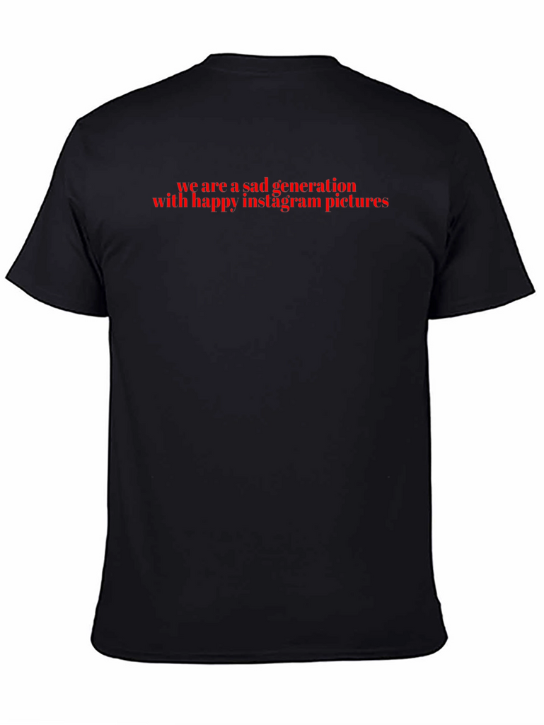 Embrace your inner irony with this eye-catching black t-shirt. The bold red text proclaims "we are a sad generation with happy instagram pictures," a humorous commentary on modern life. This classic fit tee is made from what appears to be a soft, comfortable material, perfect for everyday wear. The short sleeves and crew neck offer a relaxed and casual style. Pair it with jeans or shorts for a laid-back look that sparks conversation. This t-shirt is ideal for those who appreciate witty humor and relatable statements.