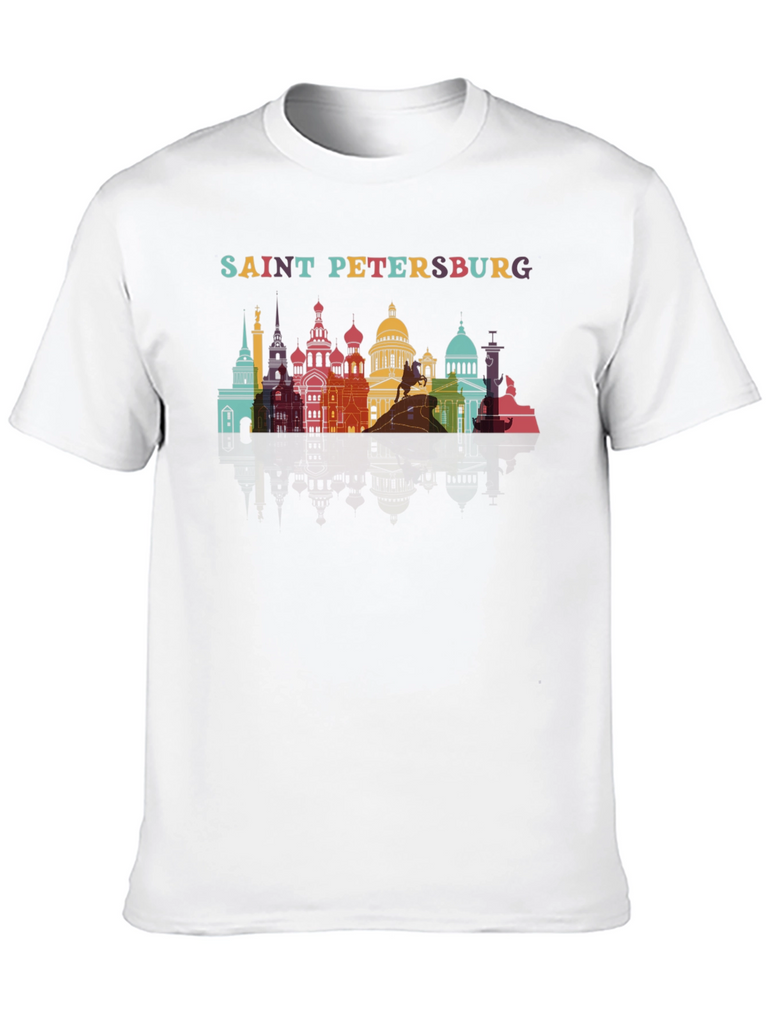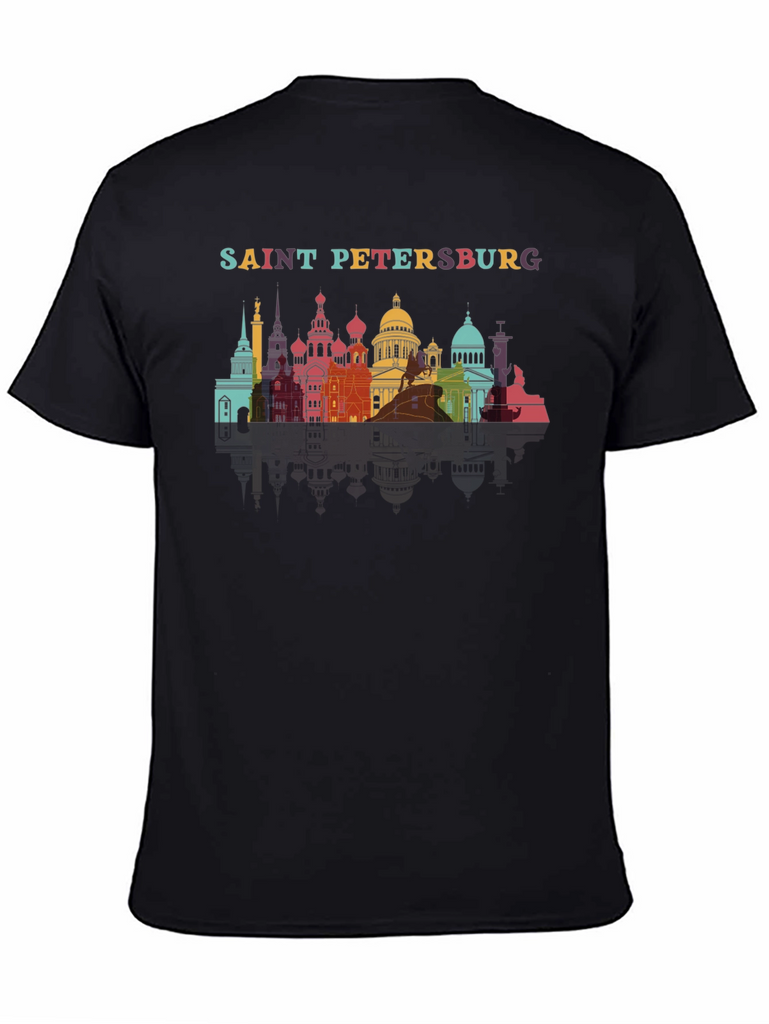 Show off your love for Saint Petersburg with this unique graphic tee! This stylish black t-shirt features a vibrant, colorful skyline design of the city's iconic landmarks, topped with the city name in playful lettering. Made from a comfortable and breathable fabric, this tee is perfect for everyday wear. The eye-catching design makes this t-shirt a great conversation starter. Whether you've visited Saint Petersburg or dream of going, this shirt is a fun way to express your appreciation for the city's rich history and culture. Pair it with jeans for a casual look or dress it up with a blazer for a more polished style. A must-have for any travel enthusiast or city lover!