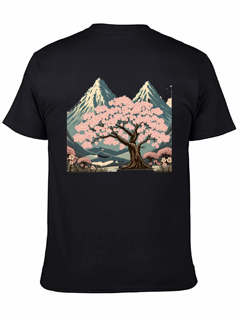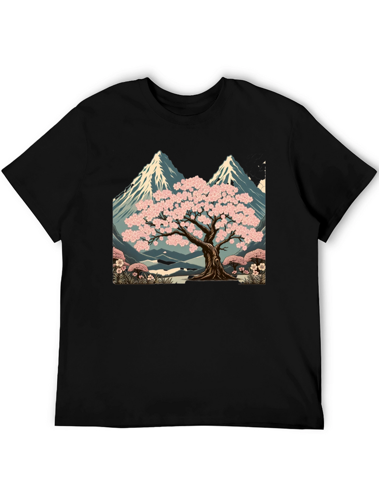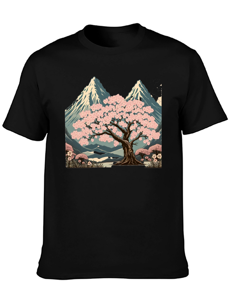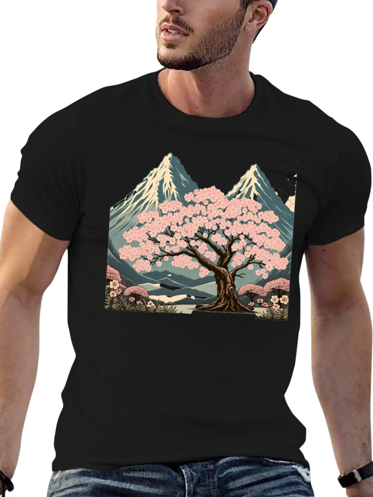 Elevate your style with this unique black t-shirt featuring a striking graphic design. The print showcases a serene landscape with a blossoming sakura tree set against a backdrop of majestic mountains. The artwork is rich in detail, with vibrant pink blossoms and cool blue tones in the mountain range. Made from comfortable, breathable fabric, this tee is perfect for casual wear, artistic expression, or as a standout piece in your wardrobe. Pair it with jeans, shorts, or a jacket for a versatile look. A great way to express your love for nature and art.