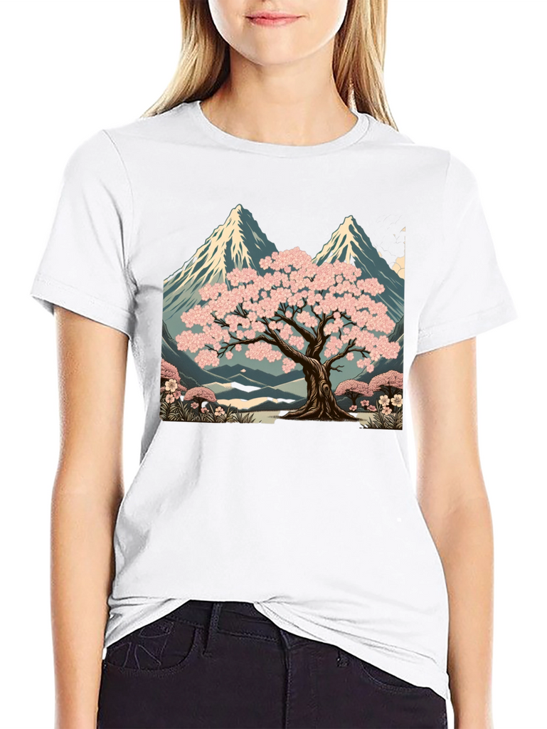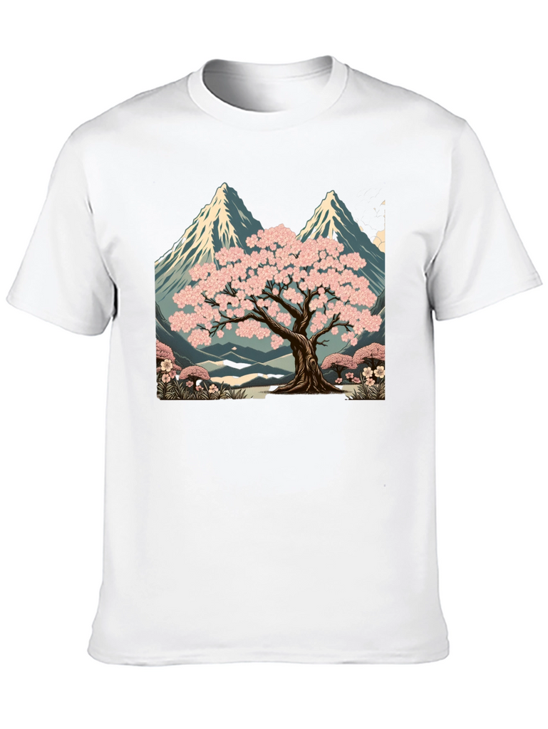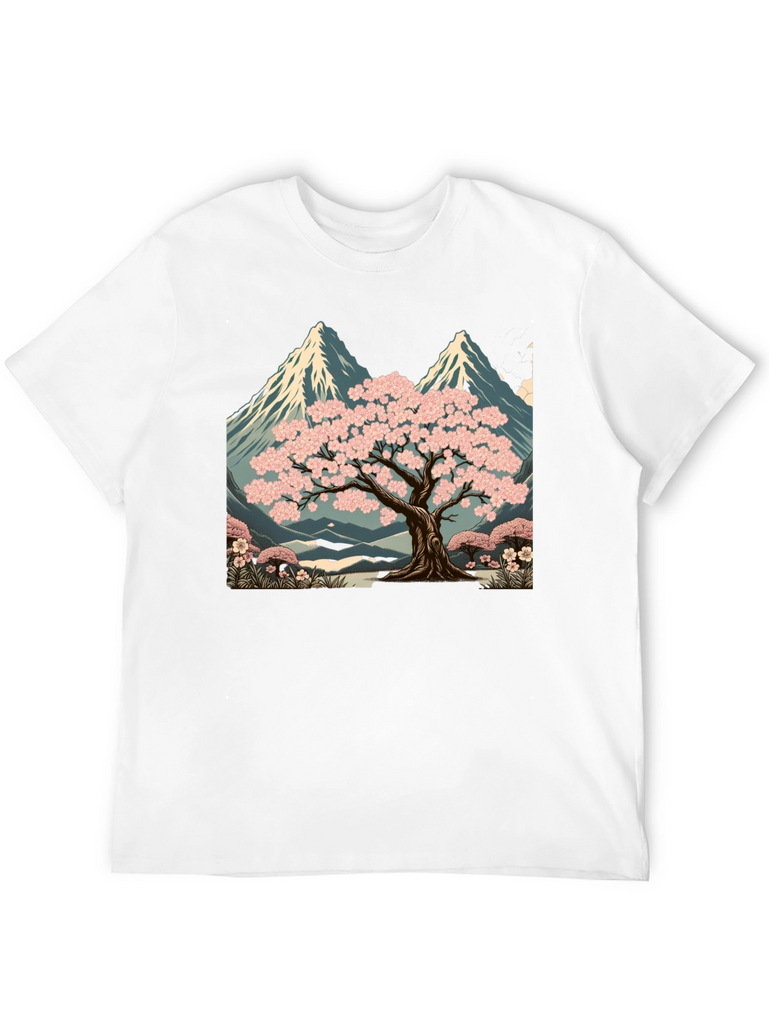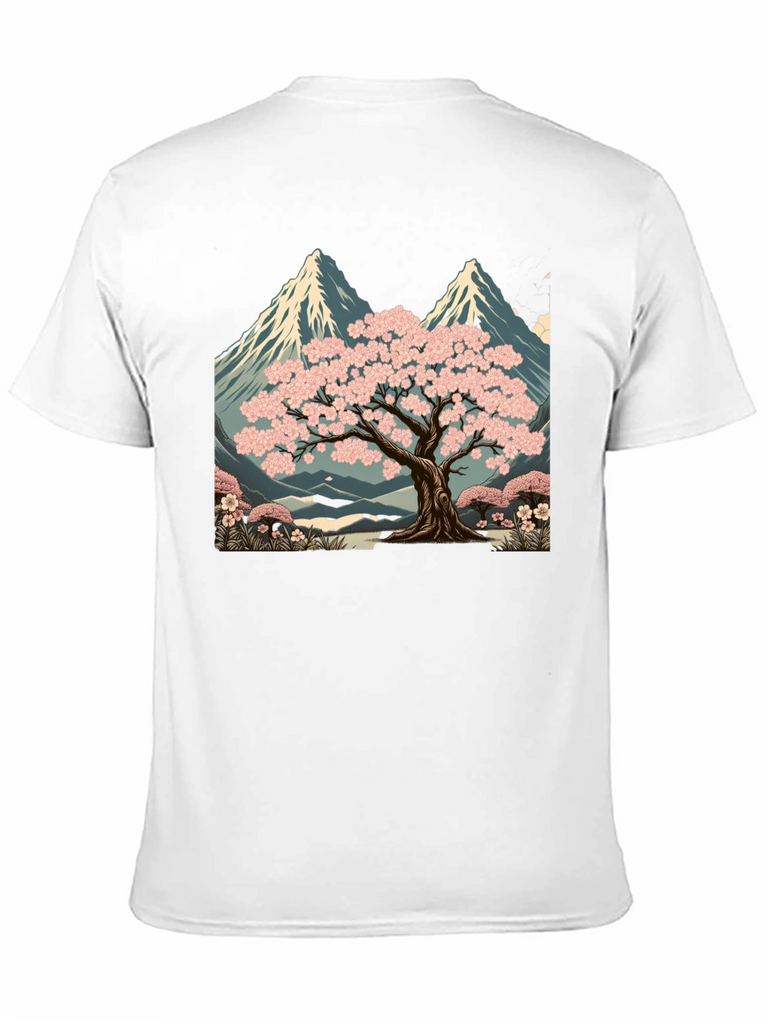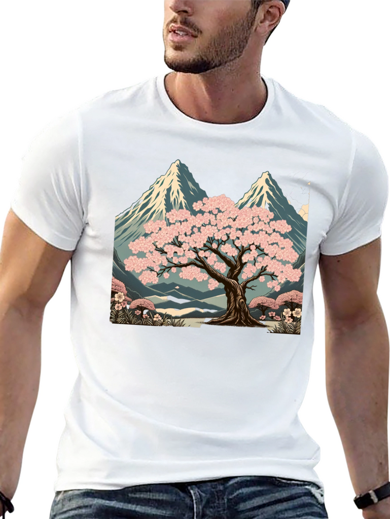 Elevate your style with this unique black t-shirt featuring a striking graphic design. The print showcases a serene landscape with a blossoming sakura tree set against a backdrop of majestic mountains. The artwork is rich in detail, with vibrant pink blossoms and cool blue tones in the mountain range. Made from comfortable, breathable fabric, this tee is perfect for casual wear, artistic expression, or as a standout piece in your wardrobe. Pair it with jeans, shorts, or a jacket for a versatile look. A great way to express your love for nature and art.