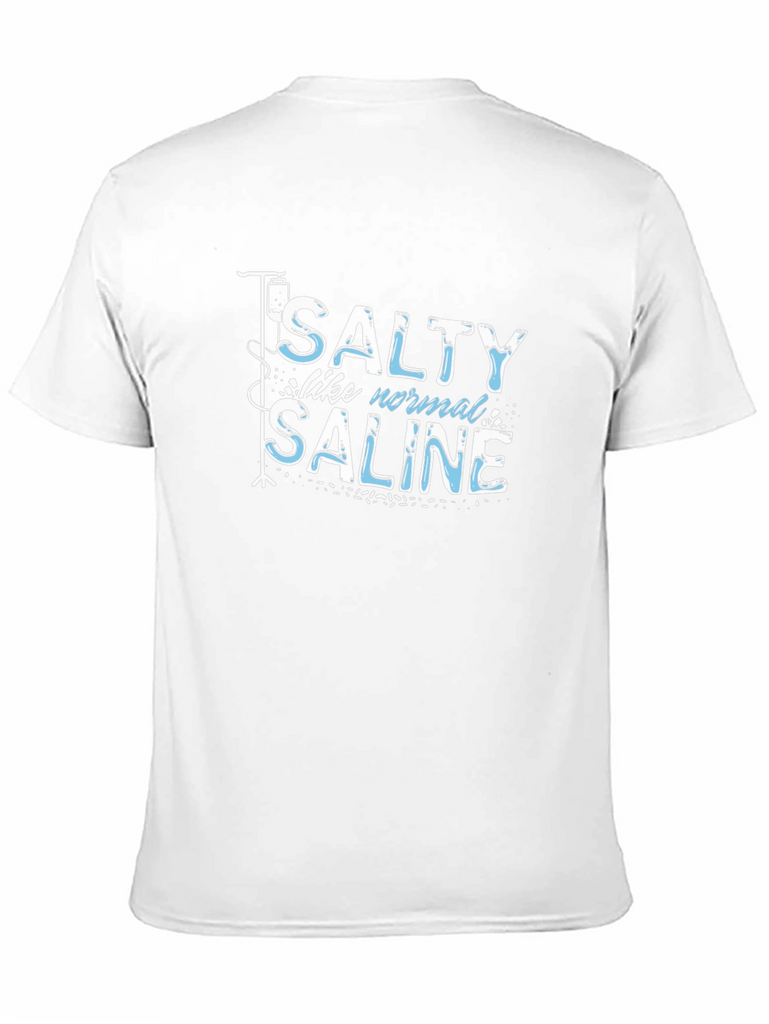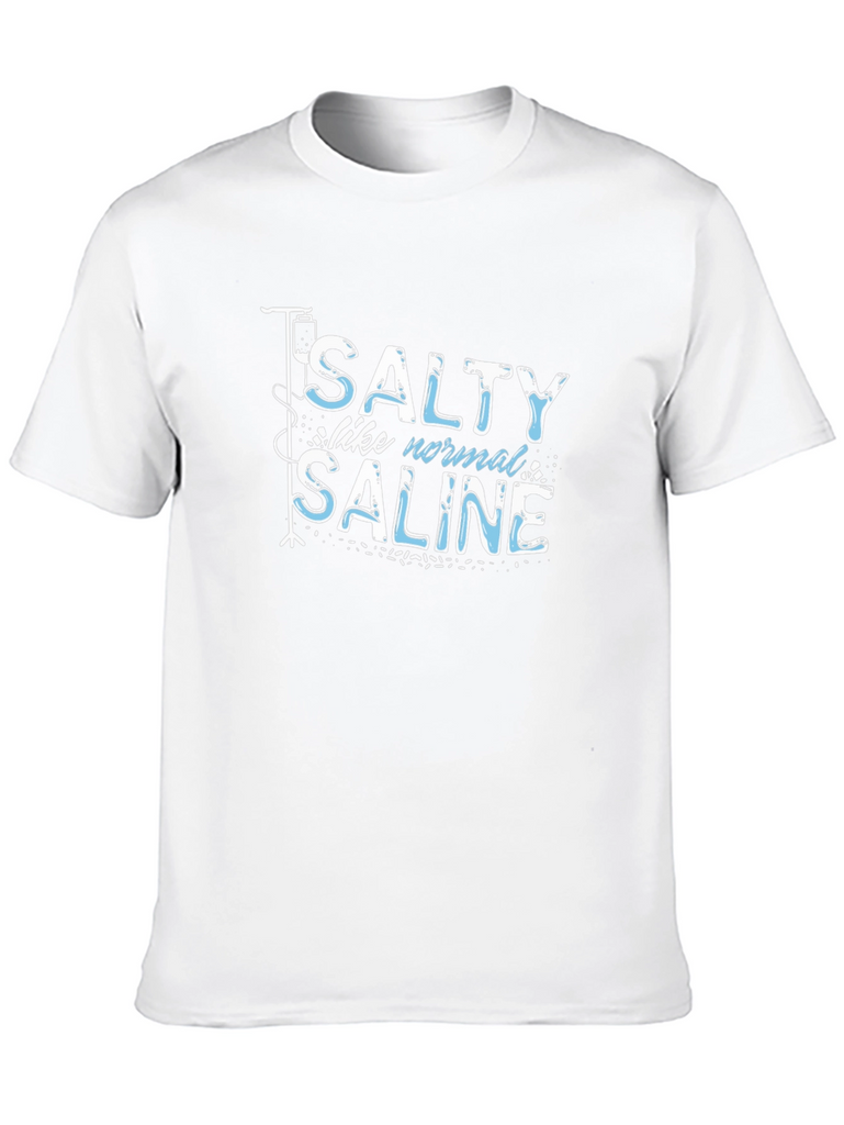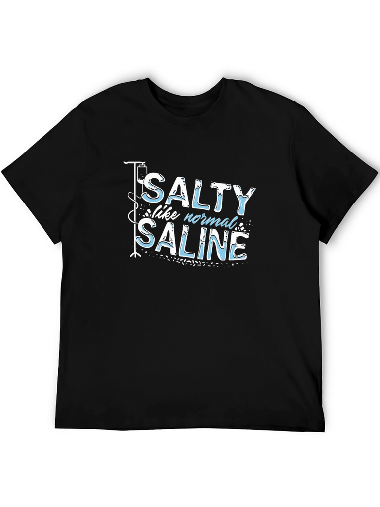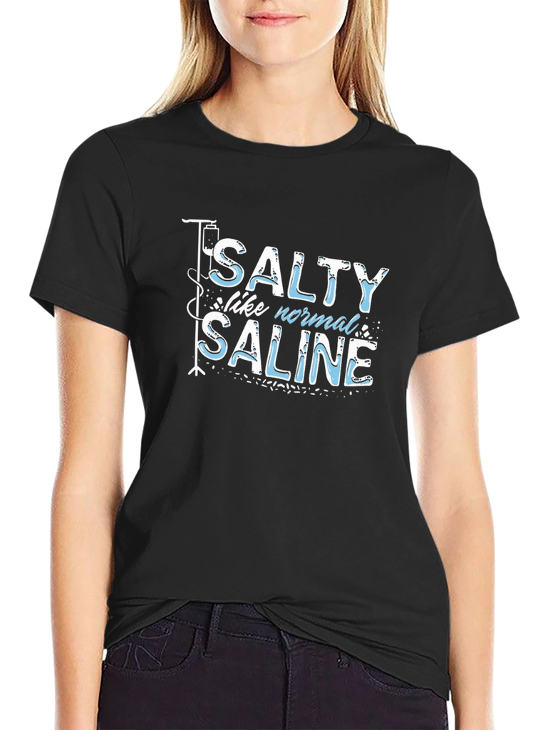 Embrace your sassy side with this "Salty Like Normal Saline" T-shirt. This black tee features a witty and eye-catching design, making it the perfect conversation starter. The graphic includes an IV drip stand, adding a touch of medical humor. Made from a comfortable, breathable fabric, this shirt is ideal for casual wear, healthcare professionals, or anyone with a playful attitude. The print is in a blue and white color palette and gives off a cool, modern vibe. Great for nurses, doctors, or anyone with a bit of wit! Show off your sense of humor with this unique and stylish tee.