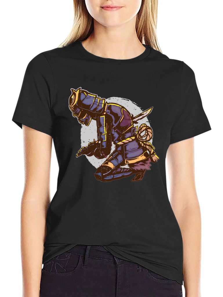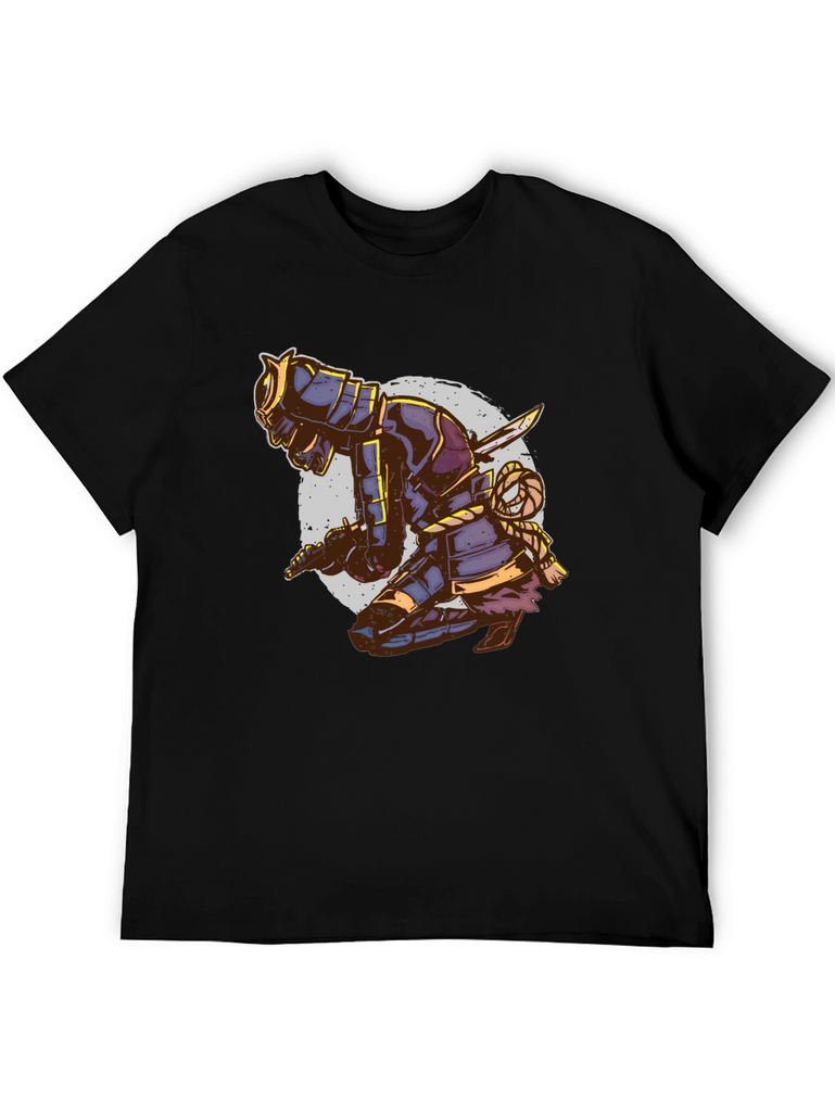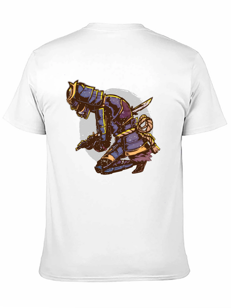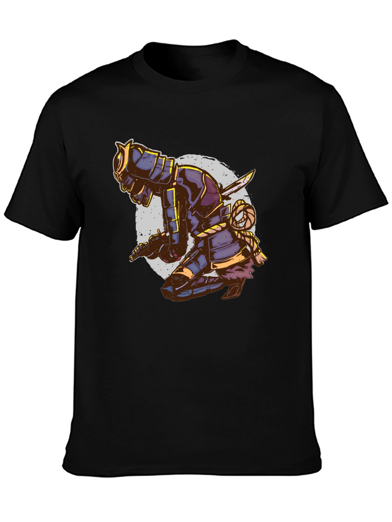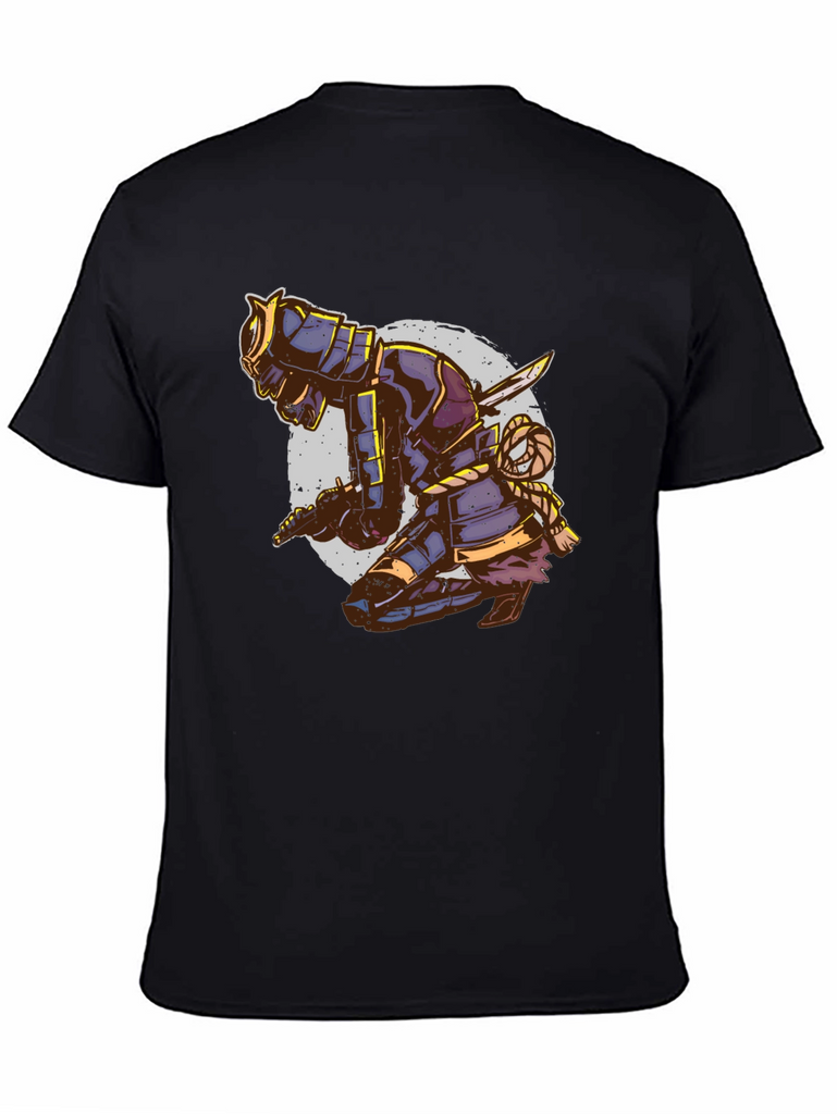 Unleash your inner warrior with this eye-catching black t-shirt featuring a striking samurai design. The detailed graphic depicts a kneeling samurai in full armor, complete with swords and intricate rope detailing, set against a faded circular backdrop. This tee is perfect for those who appreciate Japanese culture, martial arts, or unique artistic expressions. Made from a comfortable, breathable fabric, this t-shirt is ideal for casual wear, workouts, or making a statement wherever you go. Stand out from the crowd and showcase your bold style with this distinctive and attention-grabbing piece. Order yours today and embrace the spirit of the samurai!