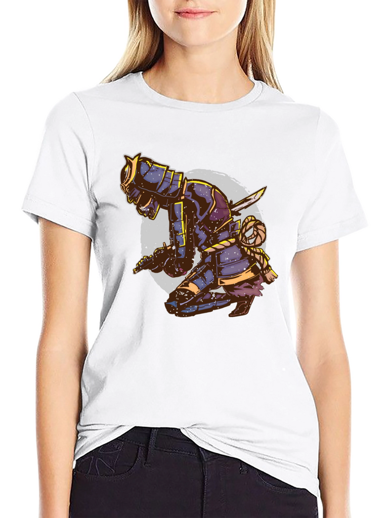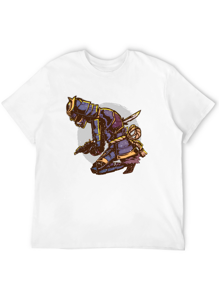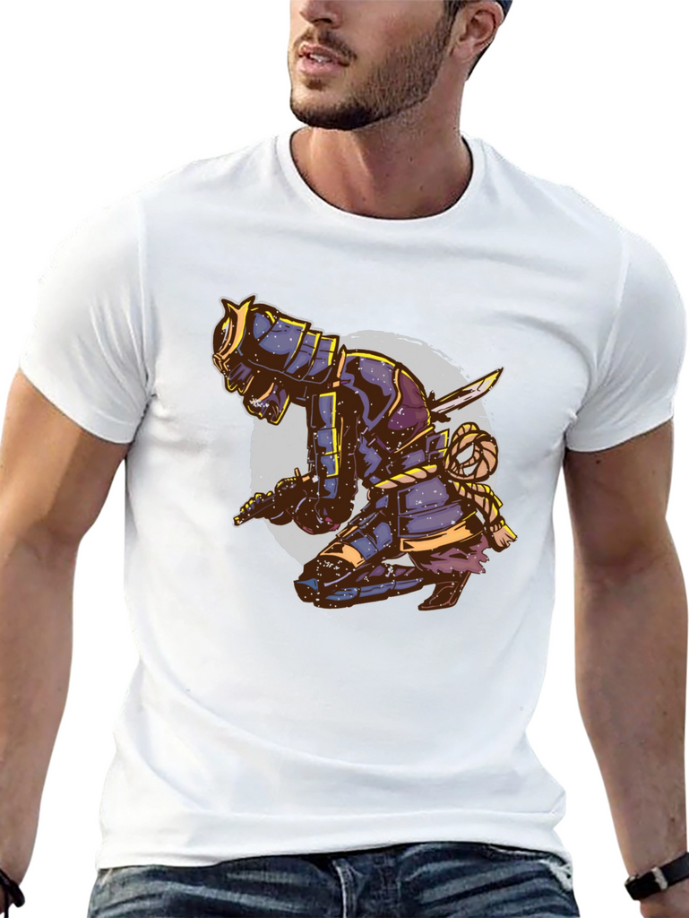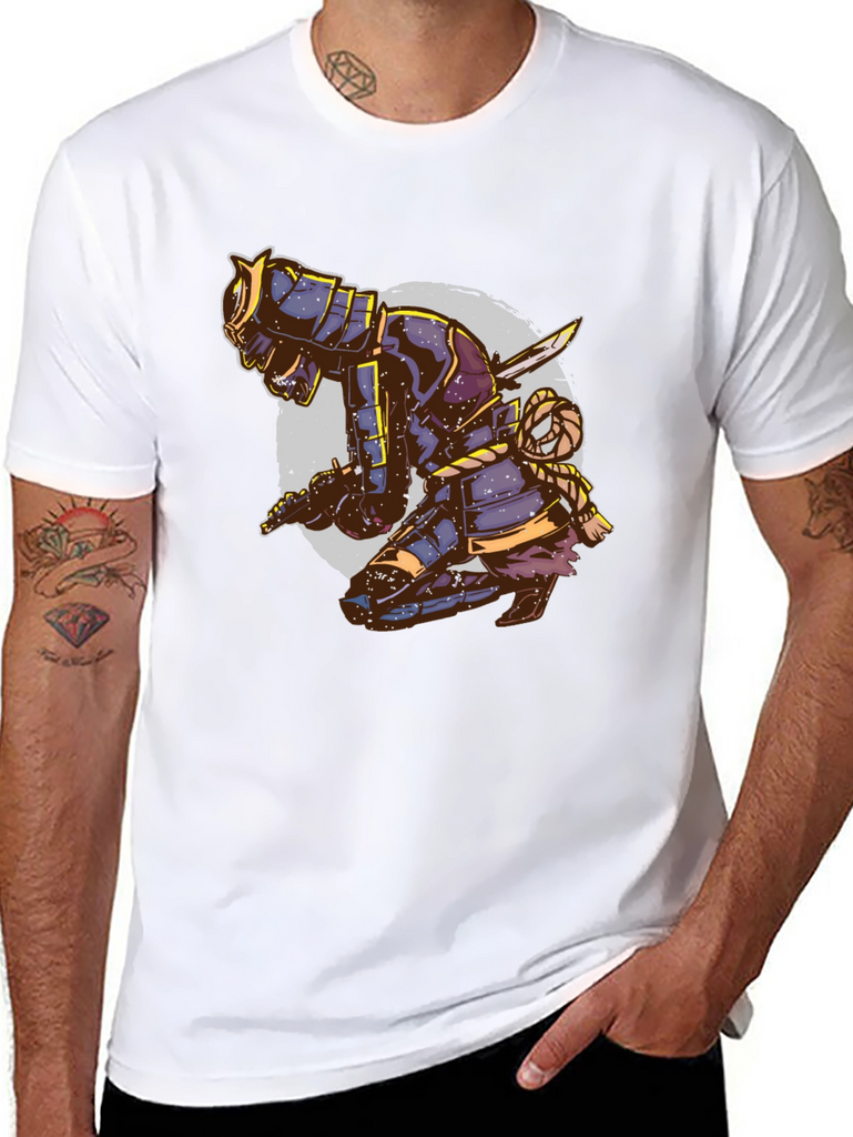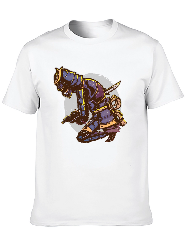 Unleash your inner warrior with this eye-catching black t-shirt featuring a striking samurai design. The detailed graphic depicts a kneeling samurai in full armor, complete with swords and intricate rope detailing, set against a faded circular backdrop. This tee is perfect for those who appreciate Japanese culture, martial arts, or unique artistic expressions. Made from a comfortable, breathable fabric, this t-shirt is ideal for casual wear, workouts, or making a statement wherever you go. Stand out from the crowd and showcase your bold style with this distinctive and attention-grabbing piece. Order yours today and embrace the spirit of the samurai!