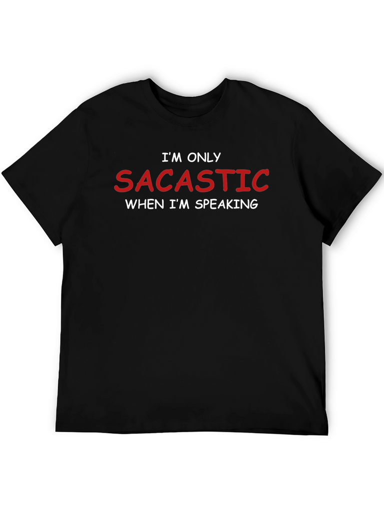 This black tee shirt features a humorous quote in white and red text. The funny saying on the shirt reads, "I'M ONLY SACASTIC WHEN I'M SPEAKING", making it a perfect conversation starter. Crafted from a soft and breathable fabric, it ensures all-day comfort. The t-shirt has a casual fit and is ideal for everyday wear, social gatherings, or as a fun gift for someone with a great sense of humor. Add a touch of wit to your wardrobe with this unique tee!