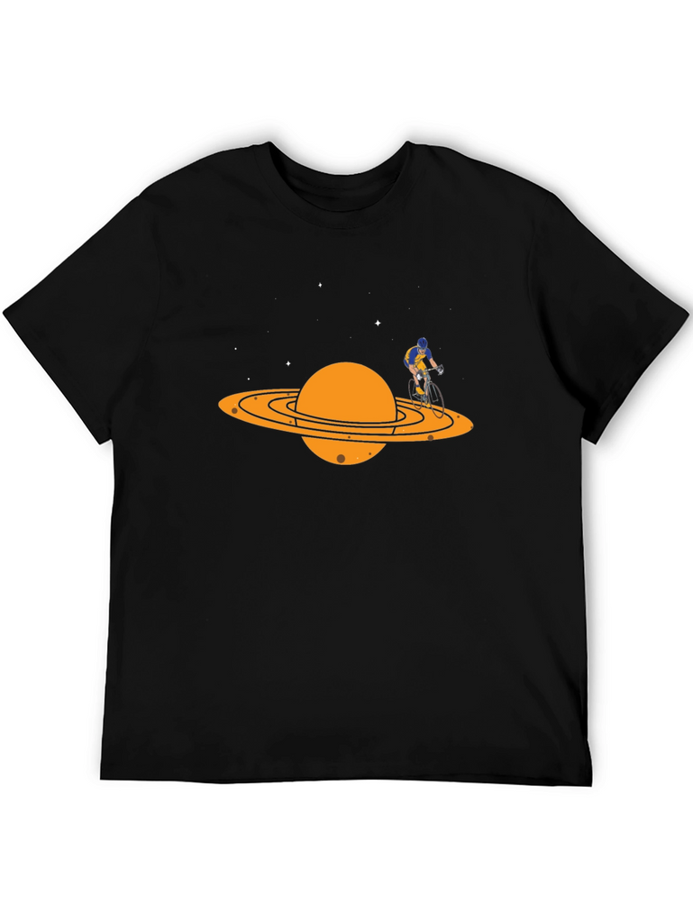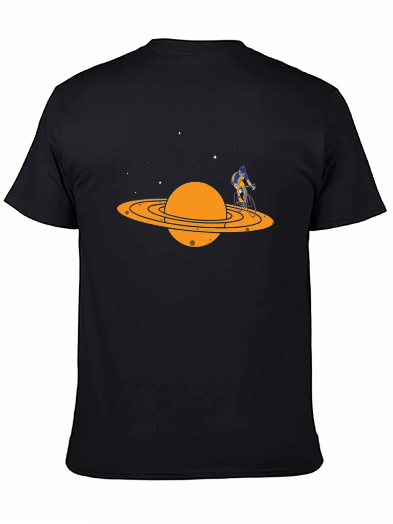 Show off your love for cycling and space with this unique graphic t-shirt. This black tee features an eye-catching design of a cyclist riding around the rings of Saturn. The vibrant orange planet and rings stand out against the dark background, creating a bold and playful look. Made from a comfortable, breathable fabric, this shirt is perfect for everyday wear. Whether you're hitting the trails or just hanging out, this tee is sure to spark conversation and express your passion. A great gift for cyclists and space enthusiasts alike.