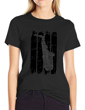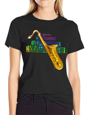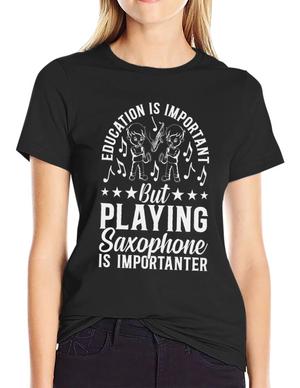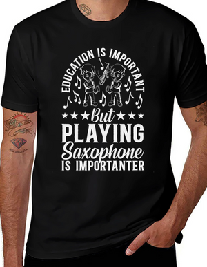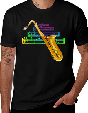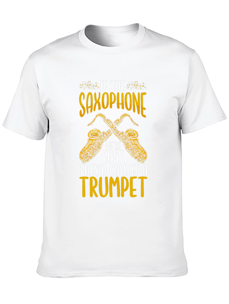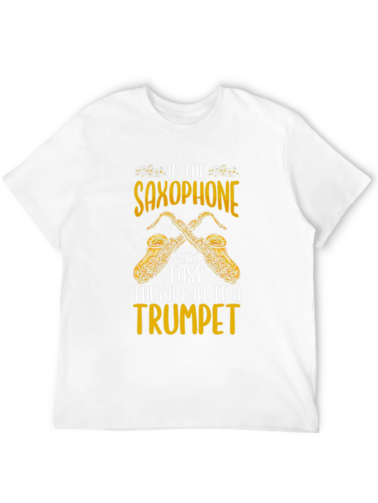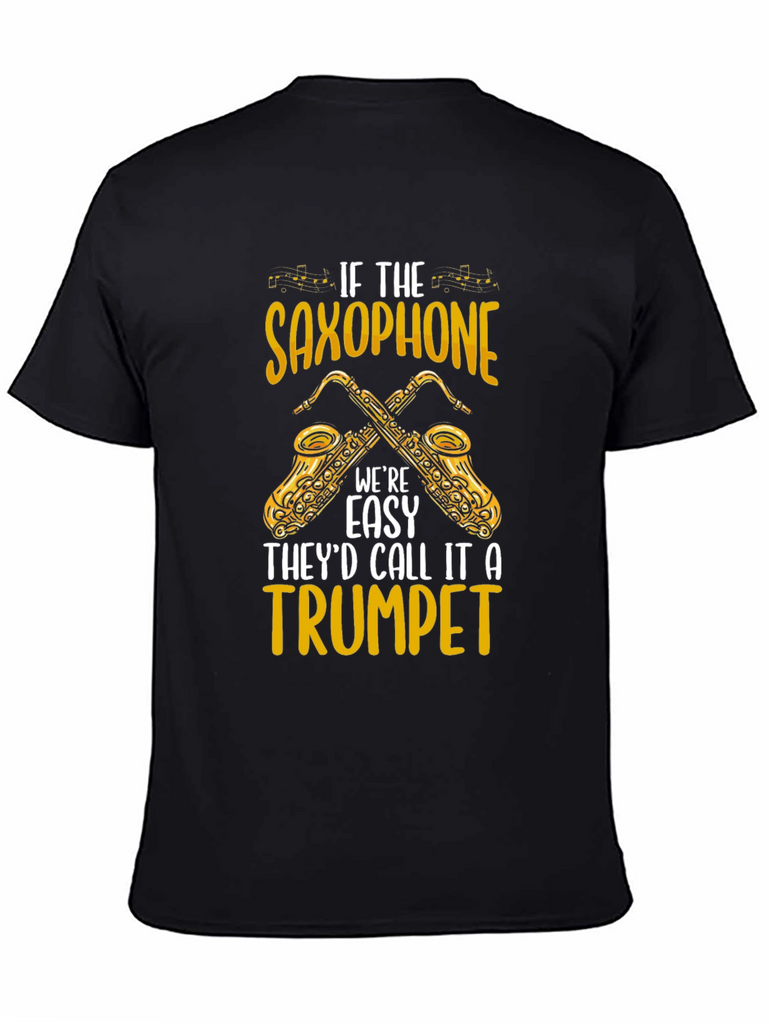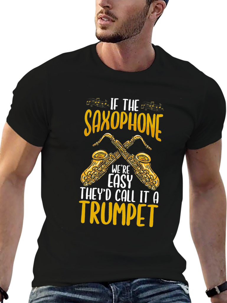 Show off your love for the saxophone with this stylish black t-shirt. Featuring a playful graphic that reads, "If the Saxophone Were Easy They'd Call It A Trumpet", accompanied by two crossed golden saxophones and musical notes. This tee is perfect for musicians, music lovers, or anyone with a great sense of humor. Made from a comfortable-looking fabric, it's ideal for everyday wear, band practice, or casual outings. Stand out and express your passion for music with this fun and eye-catching t-shirt.