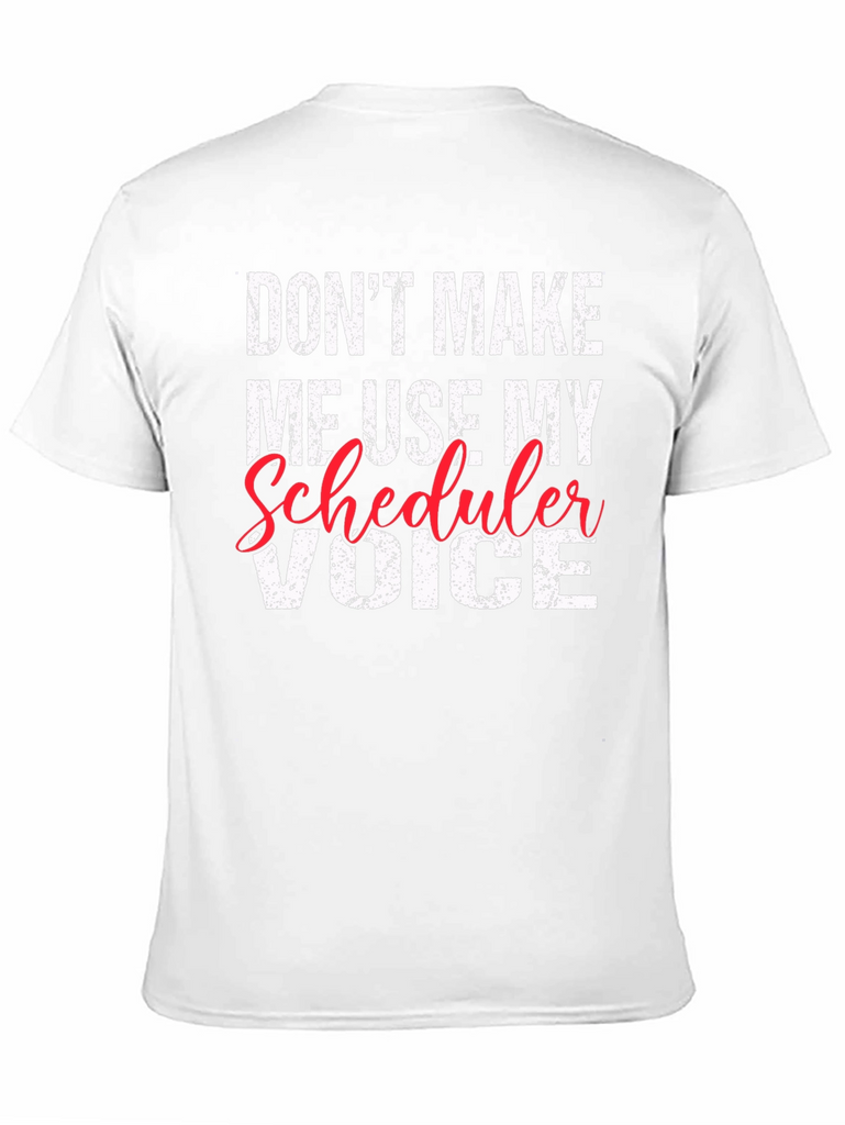 Make a statement with this witty "Don't Make Me Use My Scheduler Voice" t-shirt. Crafted from a soft, comfortable black fabric, this tee is designed for everyday wear. The bold, distressed white lettering and a touch of red adds a playful yet professional edge. This shirt is perfect for schedulers who want to showcase their sense of humor while on the job. Whether at the office or casual outings, this scheduler t-shirt is a perfect conversation starter. Wear it with pride and a smile, letting everyone know you mean business!