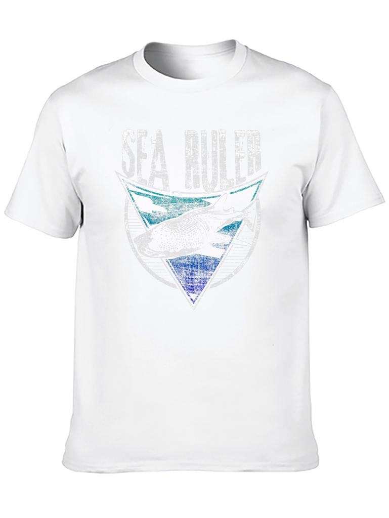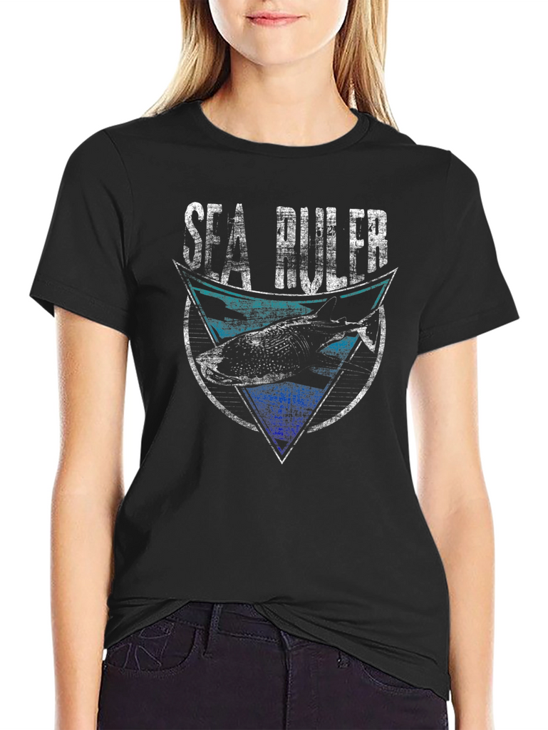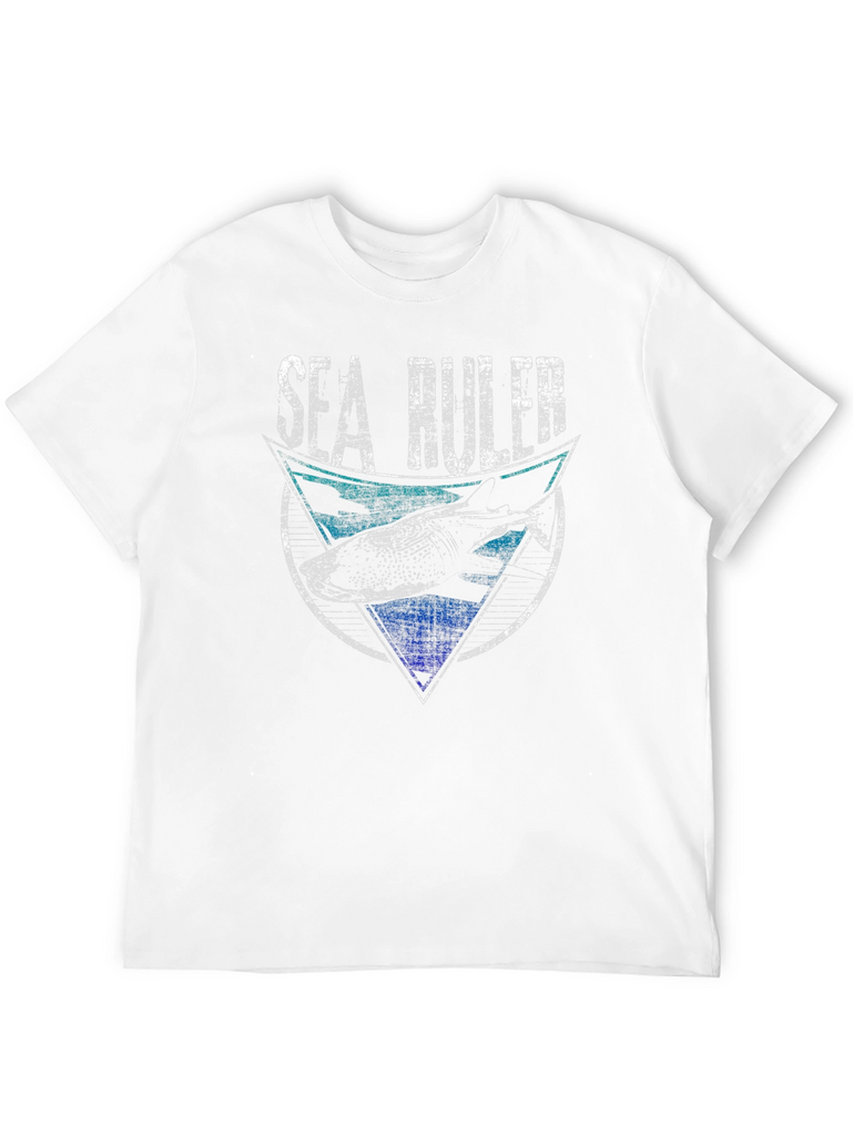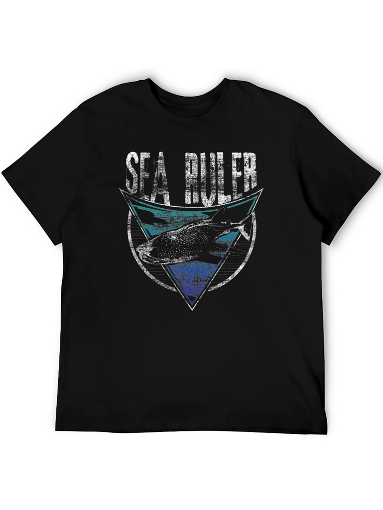 Show your love for the ocean with this unique Sea Ruler graphic tee! This black t-shirt features a distressed-style print with a shark design inside a geometric shape. The top portion features a turquoise blue color scheme, while the bottom has a bold royal blue. The words 'Sea Ruler' are printed in a bold, distressed white font above the graphic. Made from a comfortable, breathable fabric, this short-sleeved shirt is perfect for casual wear, beach outings, or ocean-themed events. A great gift for shark lovers and marine enthusiasts!