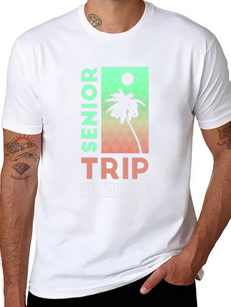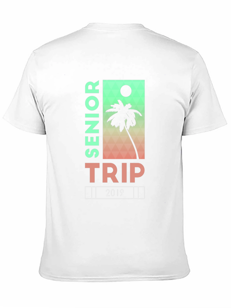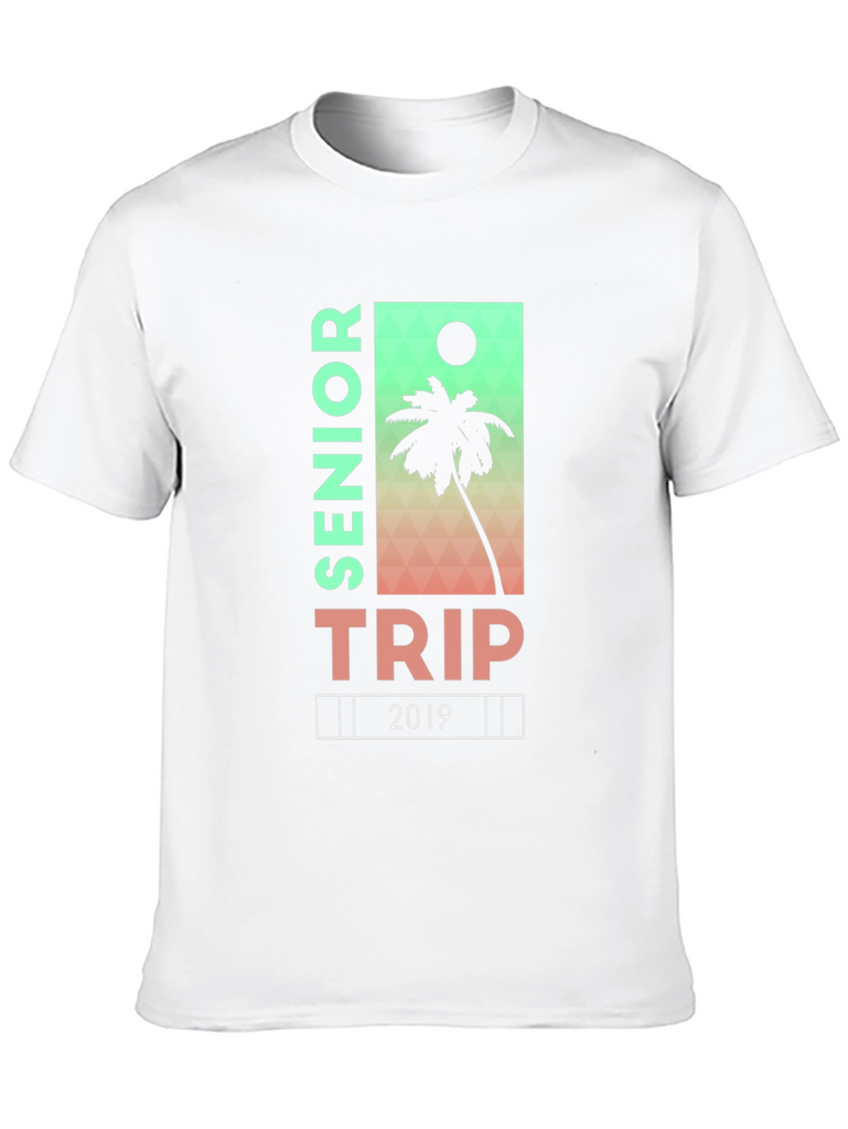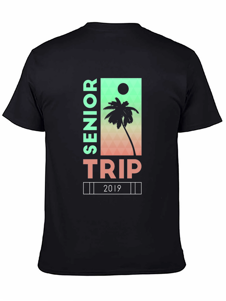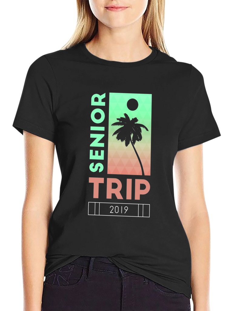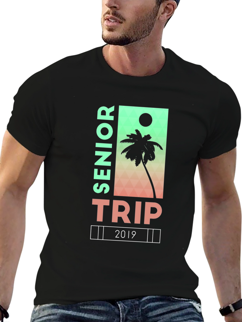 Get ready for your senior trip with this stylish black t-shirt! The design features a retro-inspired graphic with a palm tree silhouette, a radiant sun, and the words "SENIOR TRIP" in a bold, eye-catching font. The "2019" is displayed within a thin-lined box. Made from what appears to be a soft and comfortable fabric, this tee is perfect for casual wear. Whether you're exploring a new city, relaxing on the beach, or enjoying a fun-filled adventure, this t-shirt will keep you looking and feeling great. Show off your senior pride and make unforgettable memories with this unique and trendy shirt!