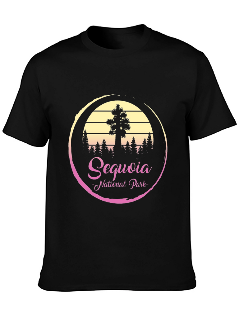 Show your love for the outdoors with this Sequoia National Park graphic tee! The black t-shirt features a vibrant circular design with a sequoia tree silhouette against a sunset-hued backdrop. The words "Sequoia" and "National Park" are displayed in a stylish script below the trees. The shirt appears to be made from a soft, comfortable fabric, making it perfect for casual wear or your next adventure. Whether you're hiking in the park or just want to show your appreciation for nature, this tee is a great choice. A great way to support the parks!
