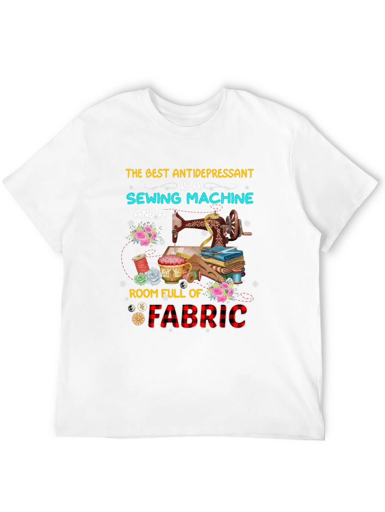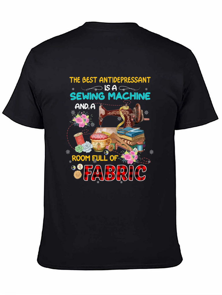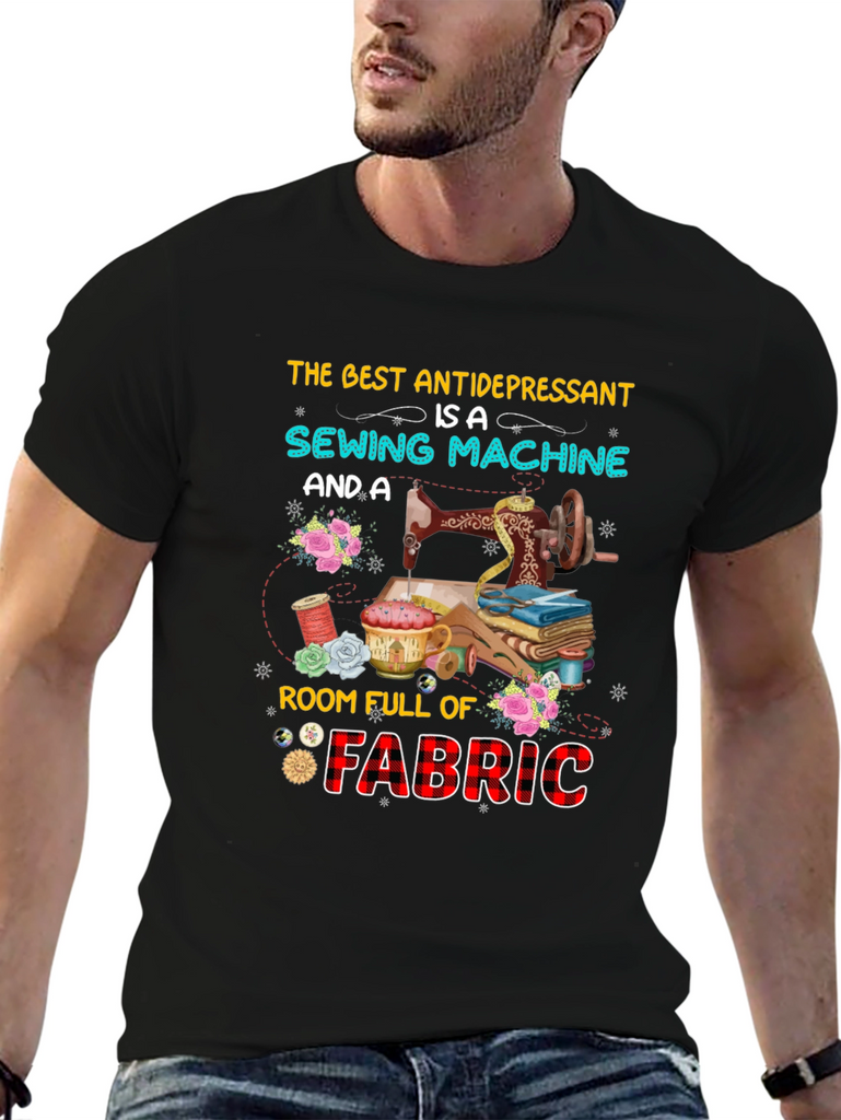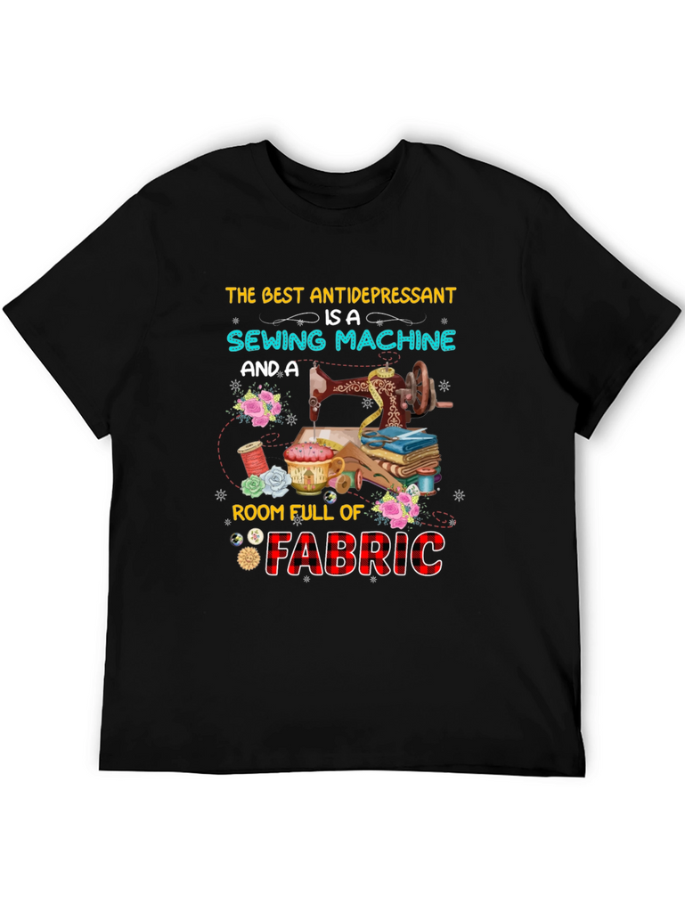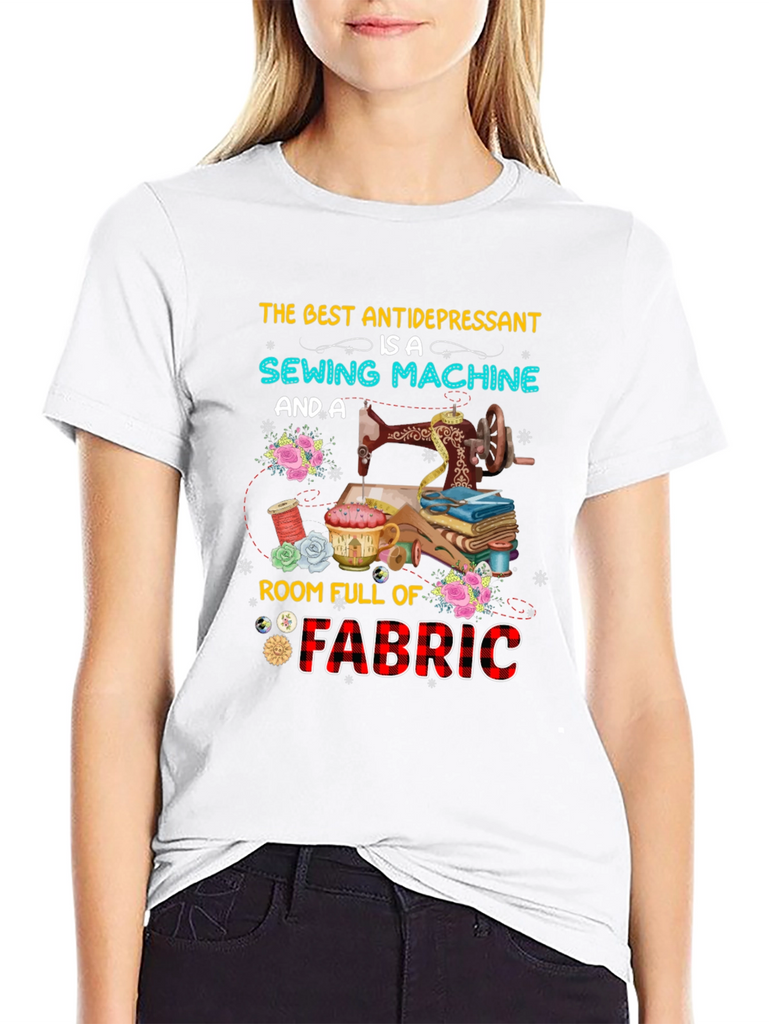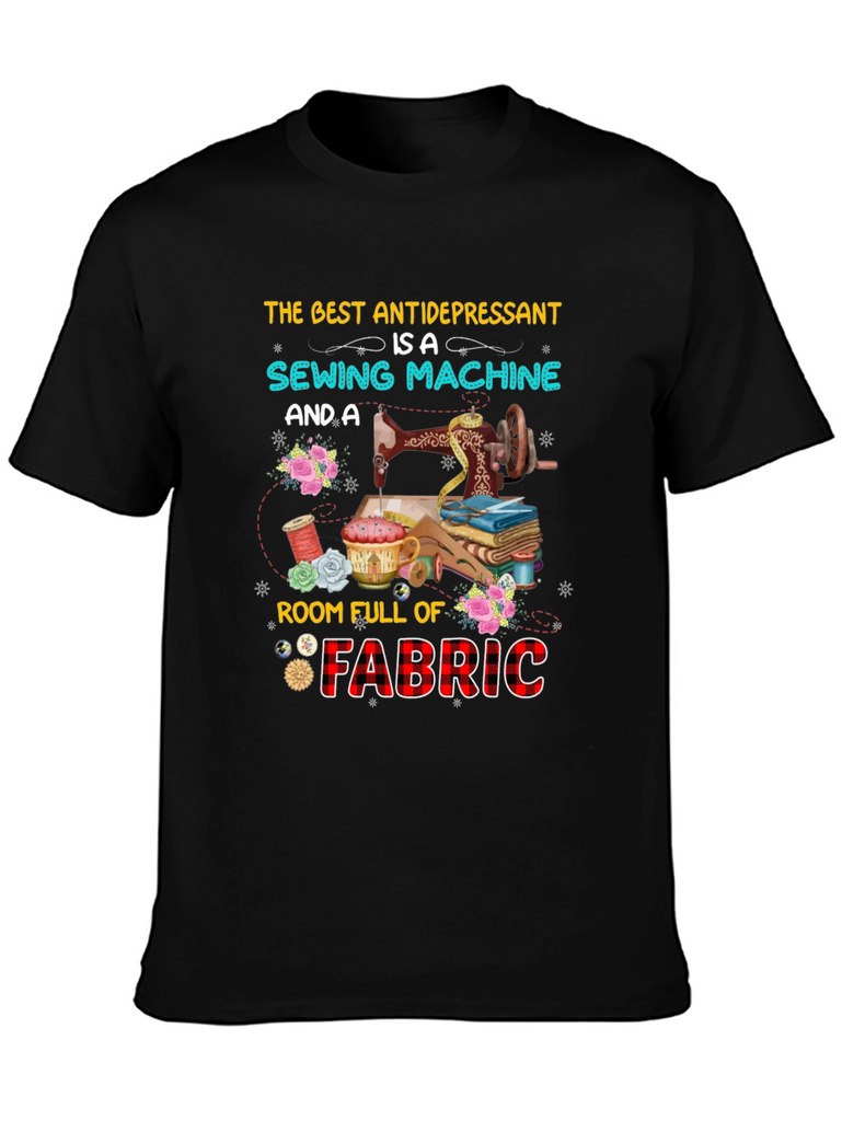 This black t-shirt is perfect for anyone who loves sewing! The design features a vintage-style sewing machine surrounded by floral accents. The text reads, "The best antidepressant is a sewing machine and a room full of fabric", making it a great gift for seamstresses and crafters. Made from a comfortable fabric blend, this tee is ideal for everyday wear, crafting sessions, or as a fun statement piece. Show off your passion for sewing with this unique and charming t-shirt!