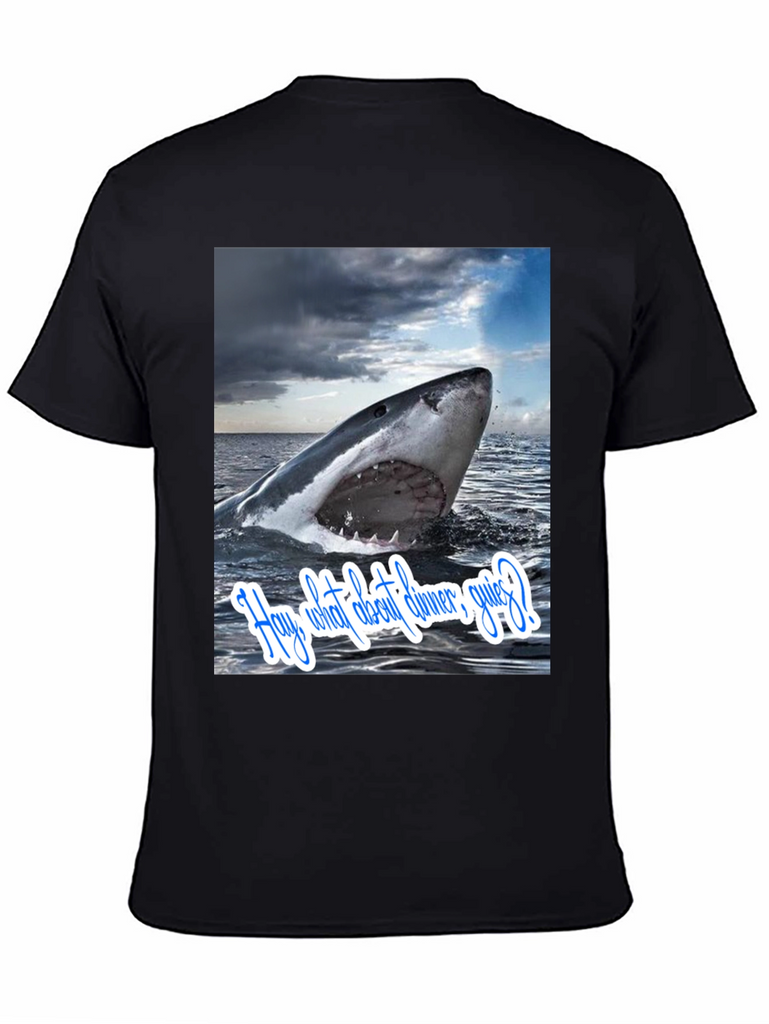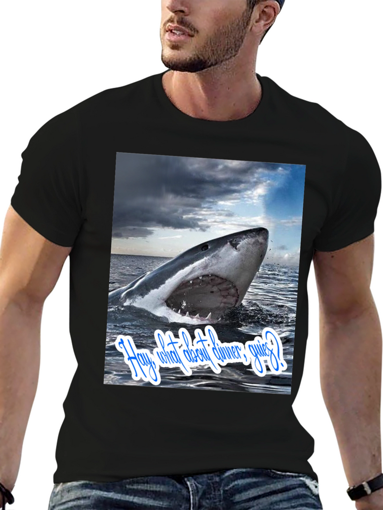 Dive into style with this unique black t-shirt featuring a stunning graphic print of a great white shark emerging from the ocean. The playful text overlay adds a humorous touch, making it a great conversation starter. Made from comfortable, breathable fabric, this tee is perfect for casual wear, ocean enthusiasts, or anyone who loves a good laugh. Wear it on your next beach outing, a casual get-together, or simply to express your love for marine life. A must-have addition to any fun-loving wardrobe!