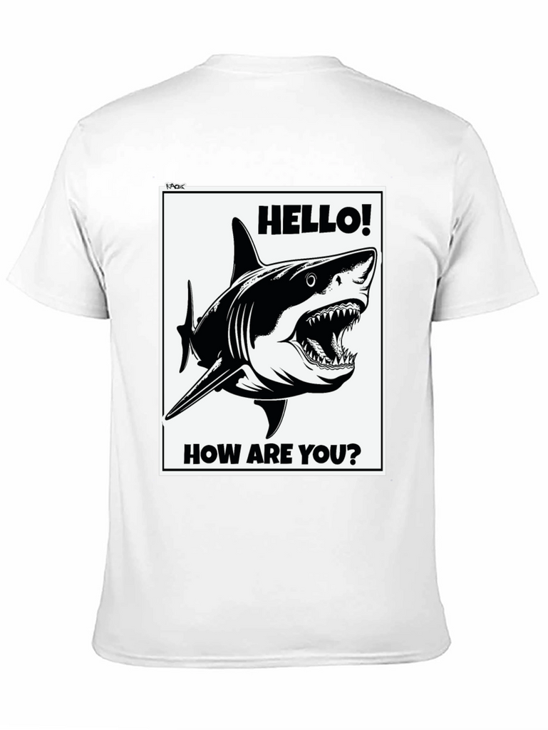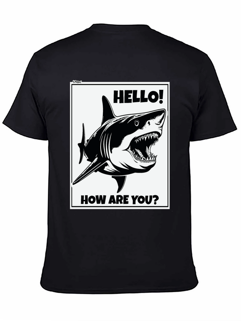 Make a splash with this unique black graphic tee. Featuring a bold, cartoon-style shark illustration inside a white rectangular border, accompanied by the text "HELLO! HOW ARE YOU?" above and below the shark, this t-shirt is sure to turn heads. The print is sharp and high-quality, making the shark's menacing grin pop. Perfect for casual wear, it adds a touch of humor and edgy style to any outfit. Show off your unique personality and love for marine life with this eye-catching tee – a great conversation starter for any occasion!