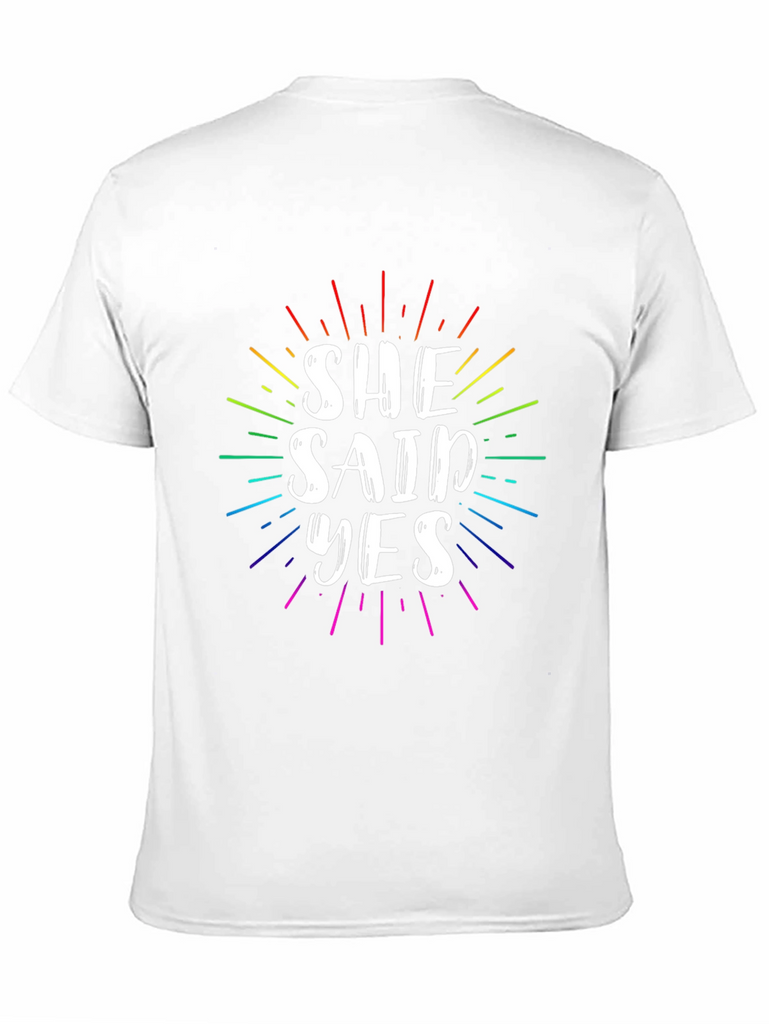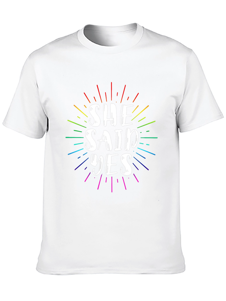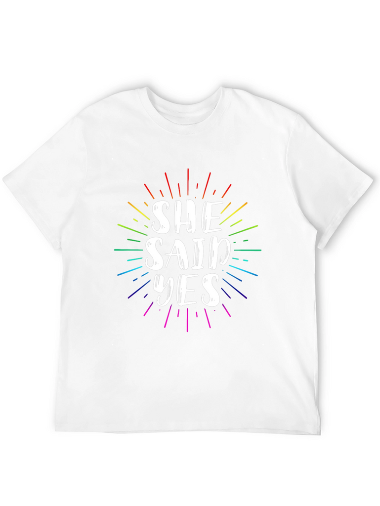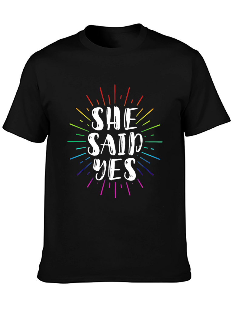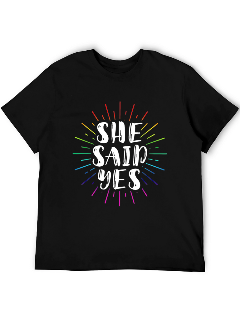 Celebrate love and commitment with this stylish black t-shirt featuring the phrase "She Said Yes" in a playful, handwritten-style font. Radiating from the text are vibrant rainbow-colored lines, adding a touch of pride and joy. The shirt appears to be made from a soft, comfortable material, perfect for everyday wear or special occasions. Wear it to engagement parties, bridal showers, or simply as a statement of love and support. This eye-catching tee makes a wonderful gift for newly engaged couples or anyone celebrating a milestone in their relationship.