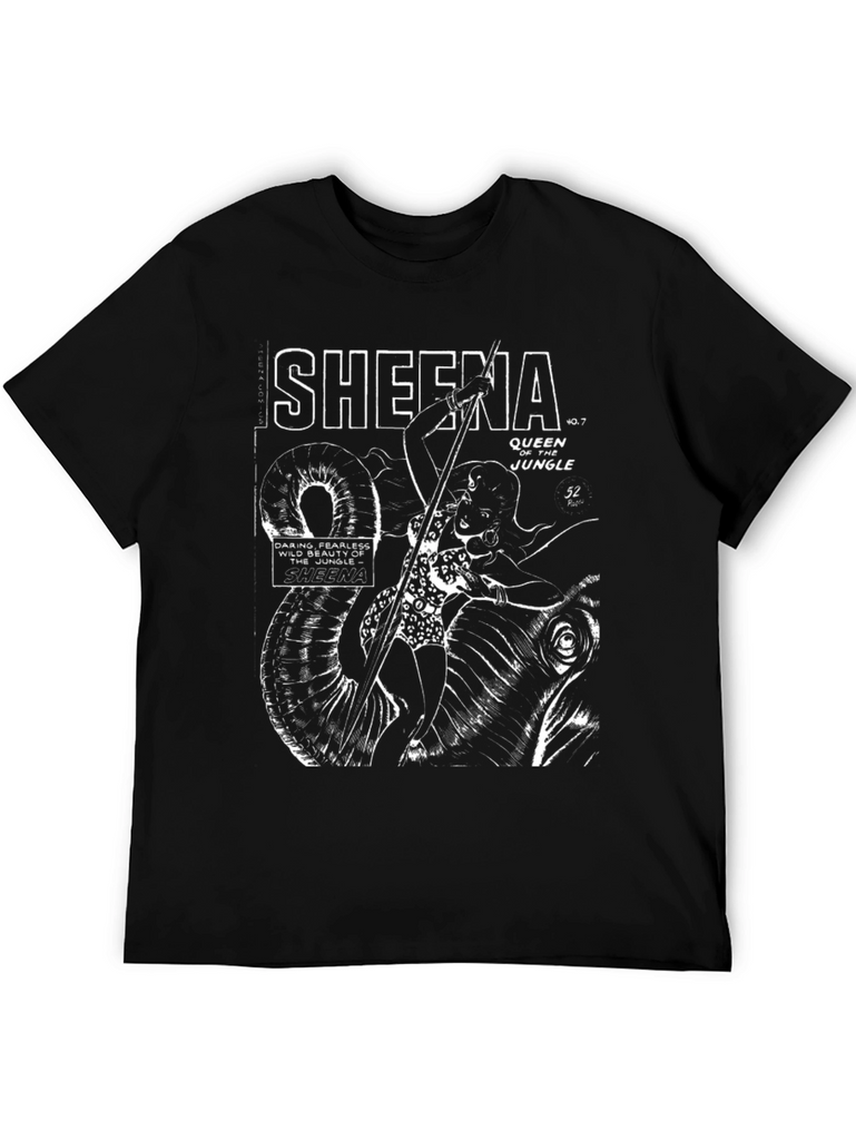 Showcase your love for classic comic art with this striking Sheena Queen of the Jungle graphic t-shirt. This black tee features a bold white print of the iconic comic book cover, complete with Sheena herself and the classic logo. Made from comfortable, breathable fabric, this shirt is perfect for everyday wear or as a standout piece for comic conventions and casual outings. Its durable print ensures the artwork stays vibrant wash after wash. A must-have for collectors and fans of vintage comic book art.